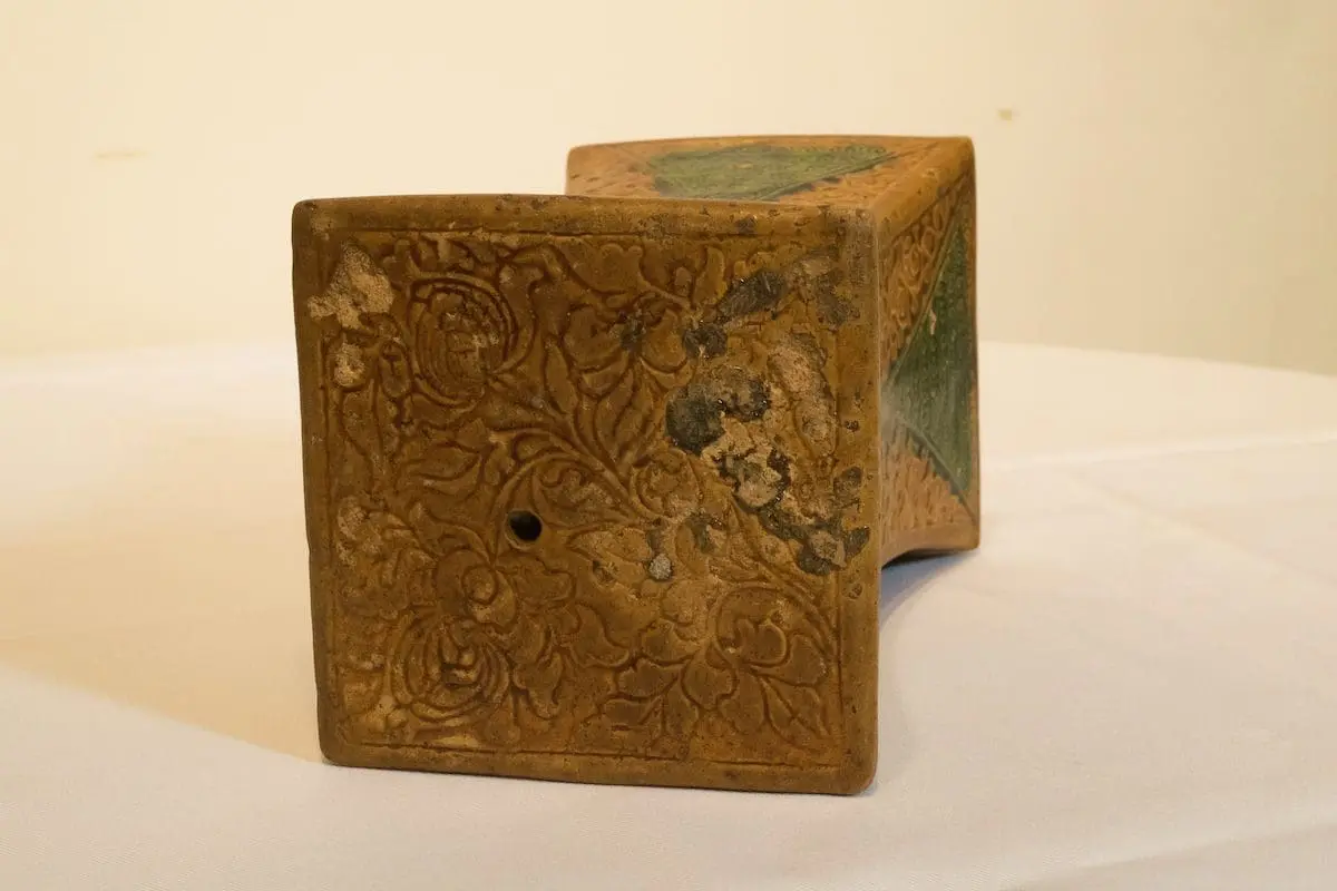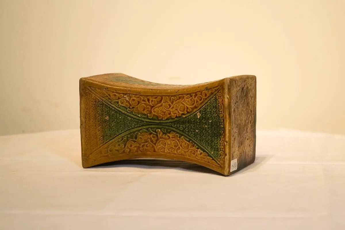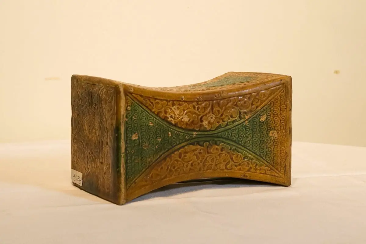 | Description | Waisted Pillow: Pillow of waisted rectangular form, the ends with fine impressed peony designs and glazed in amber, sides with panels of stylized flowerhead designs glazed in lead green and with surrounds of impressed leaf scrolls in amber. |