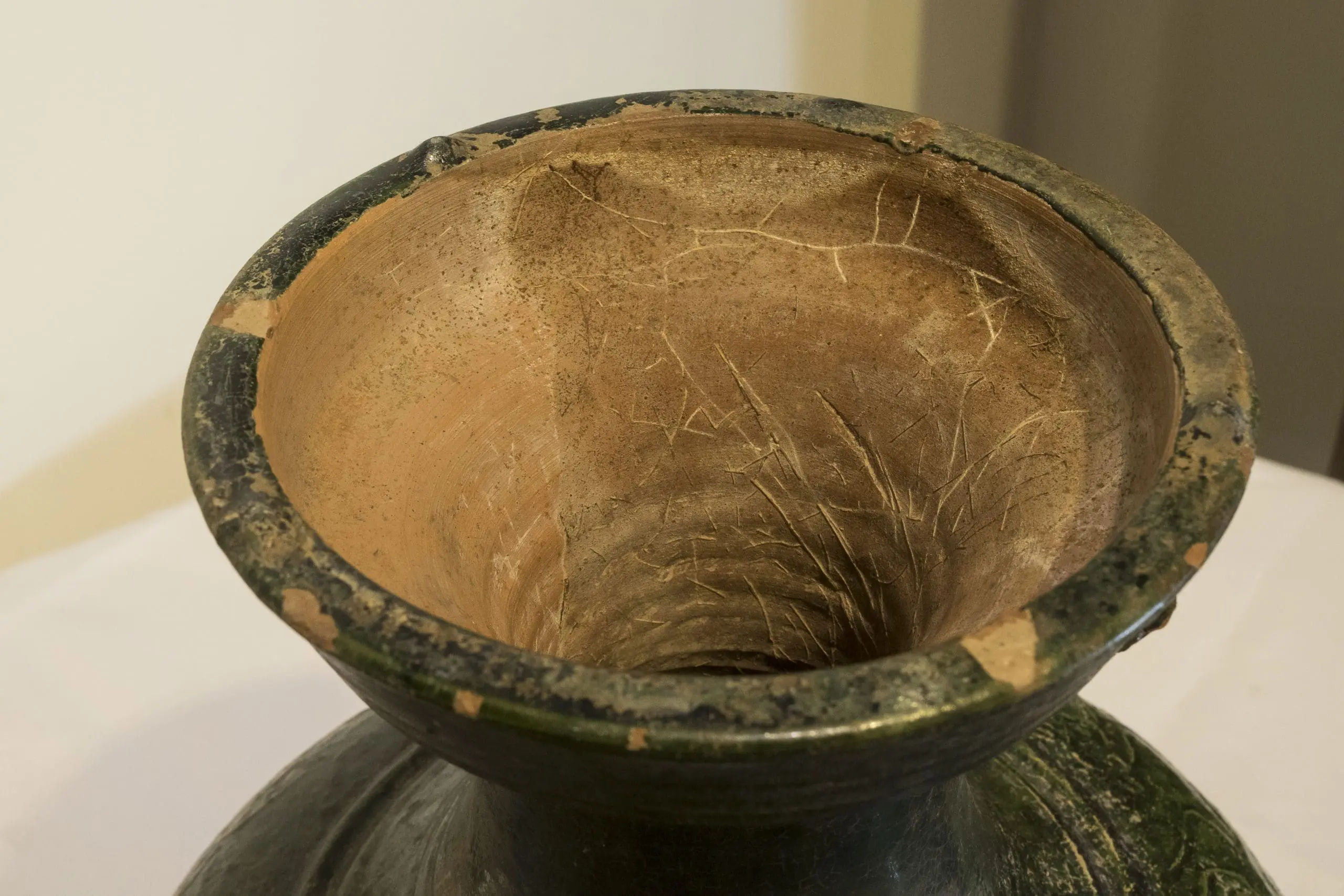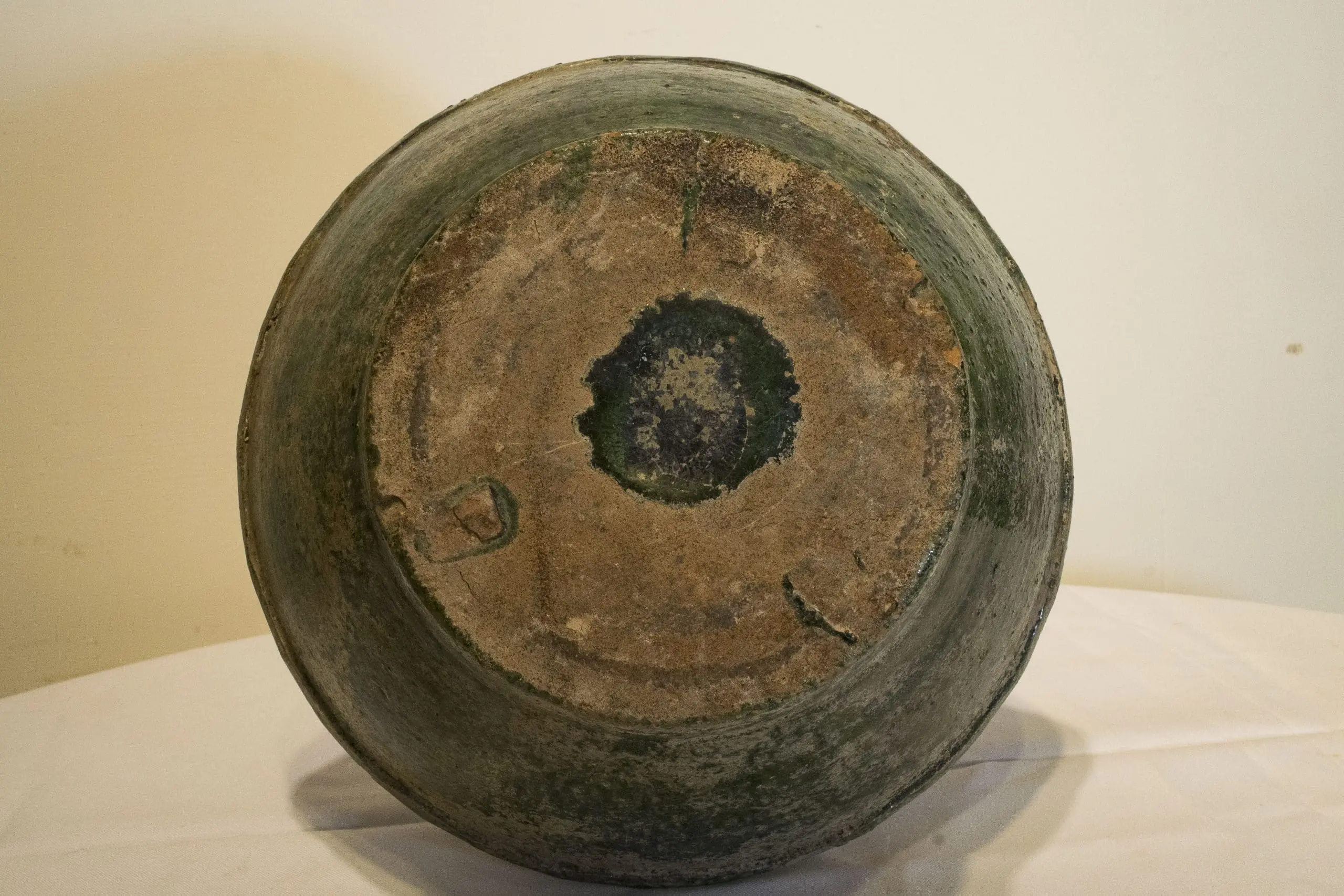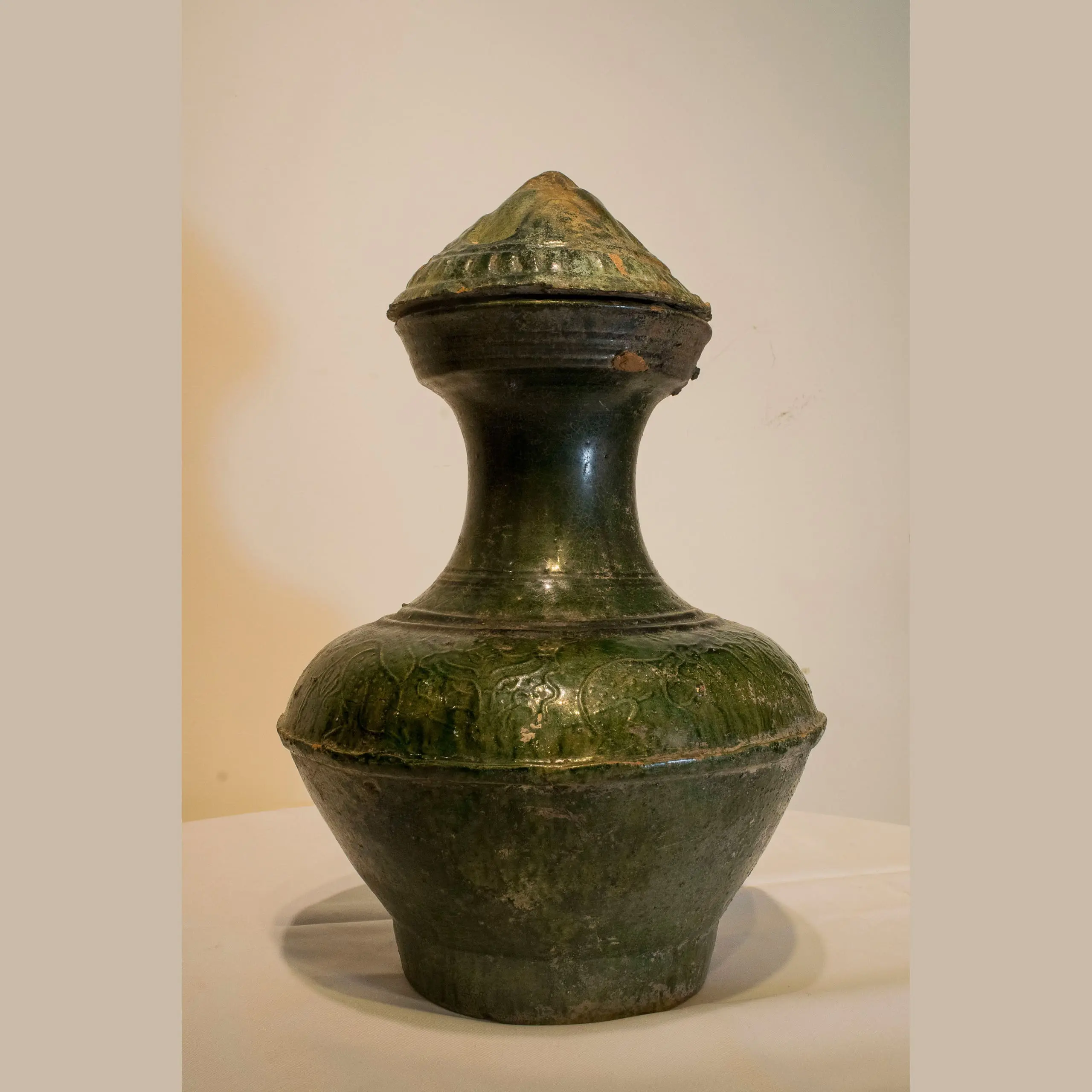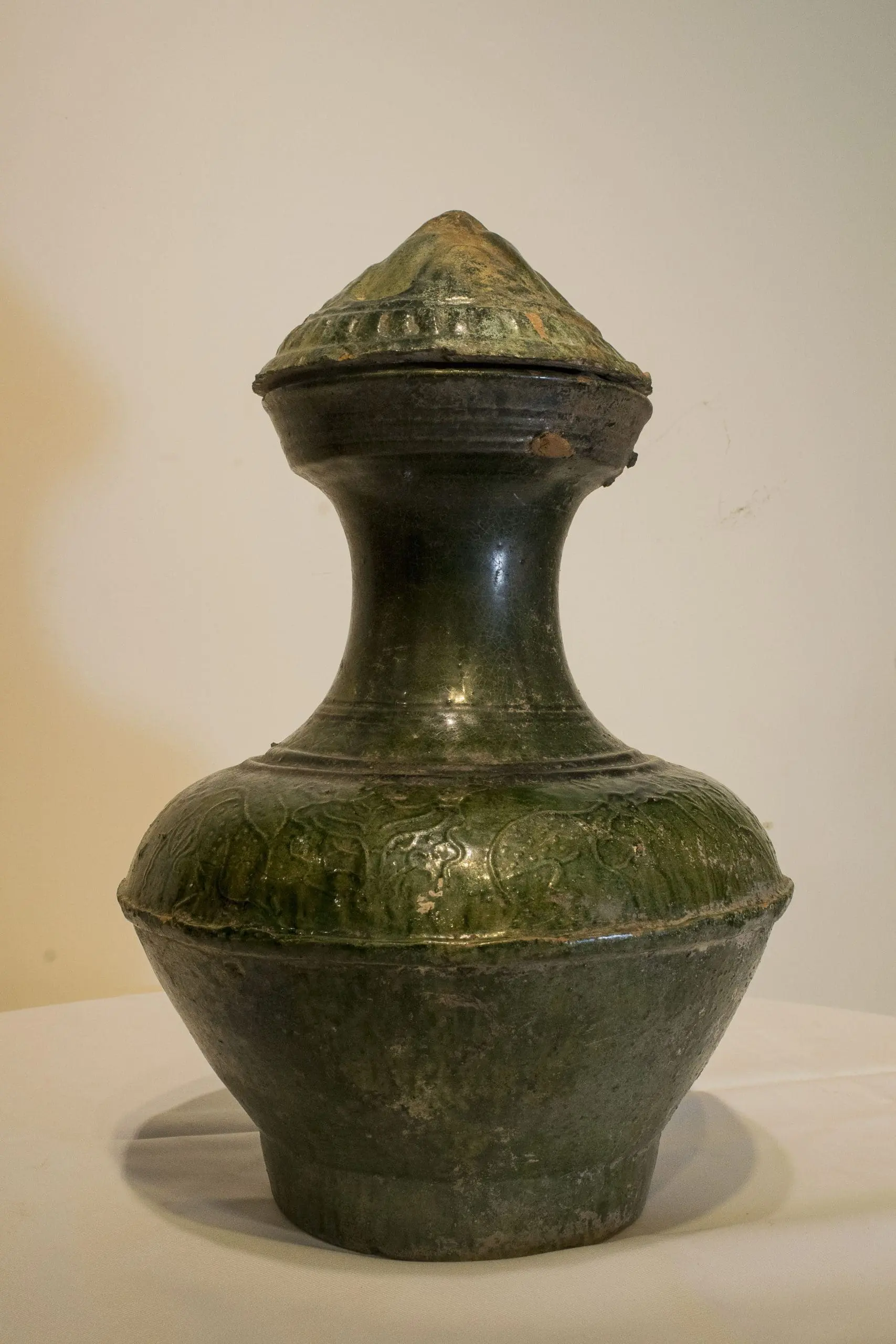 | Description | ‘HU’ Form Vessel: Lead green glazed red pottery “hu” form vessel retaining its original conical shaped cover. Body with high neck, wide mouth, rounded shoulder with a wide circling rib below, high foot. Interesting moulded band of wild beasts on the shoulder. |