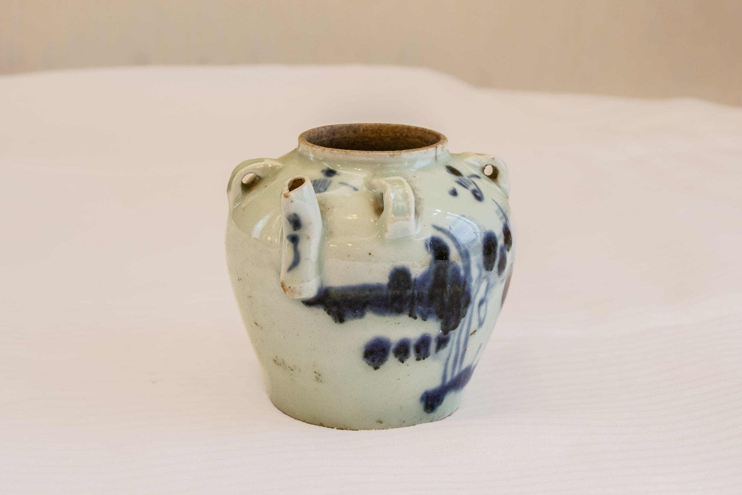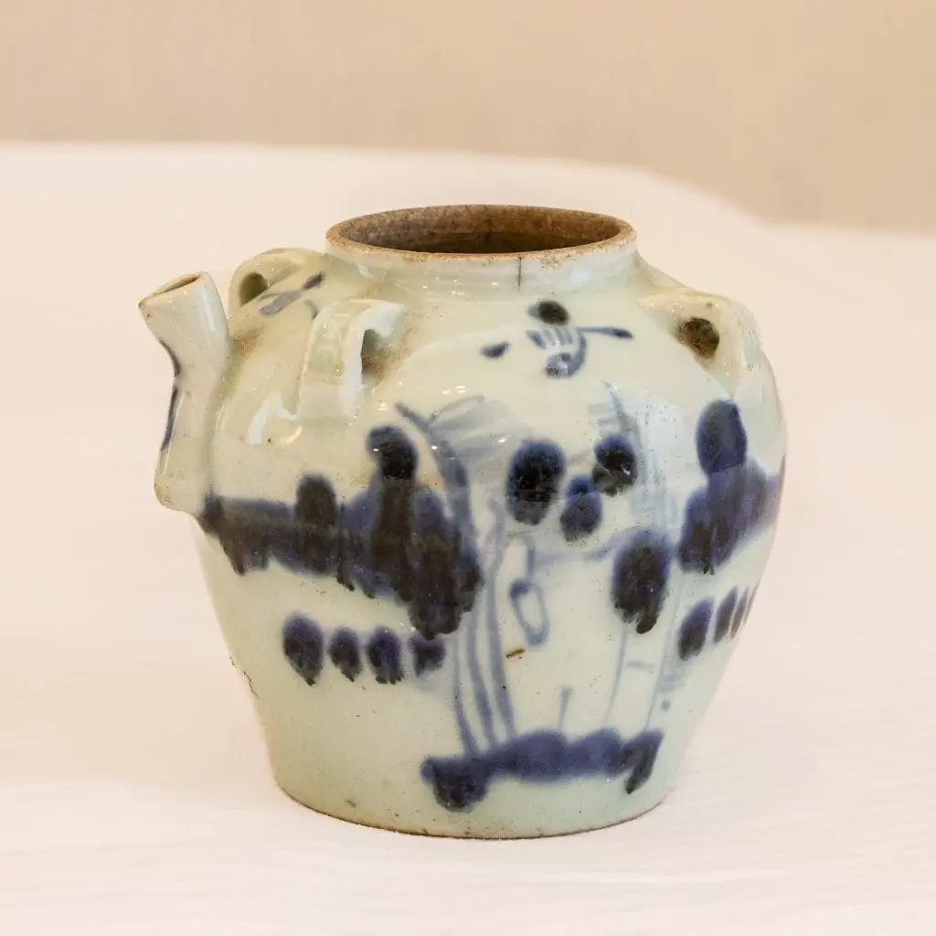 | Description | Small oil jar with blue and white abstract blue and white design of a man and landscape, flowers and branches |