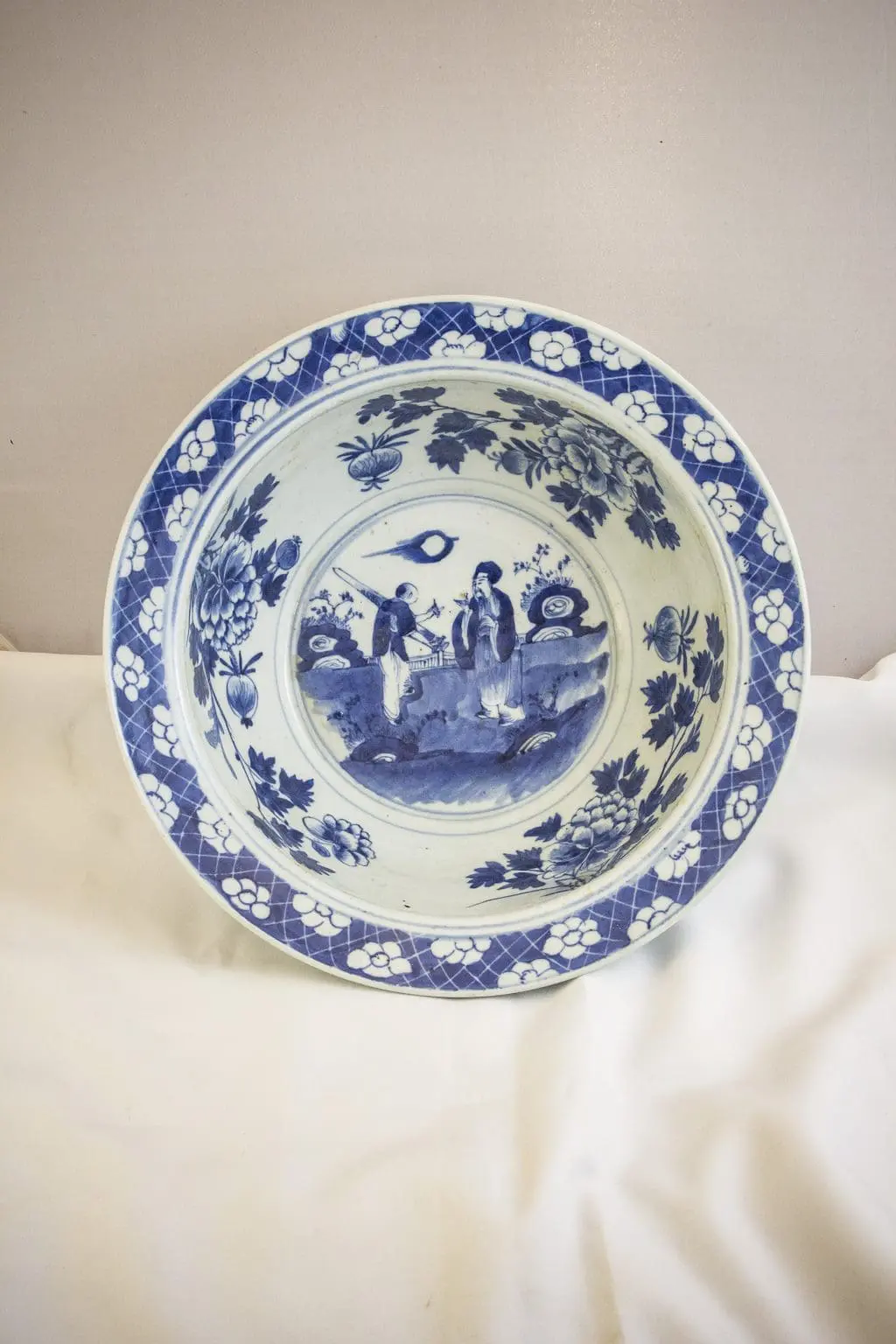 | Description | Qing dynasty porcelain wash bowl decorated in underglaze cobalt blue. The interior scene depicts a robed official attended by a servant, standing among scholar’s rocks and garden motifs. Surrounding floral sprays and a patterned diaper border along the rim enhance the composition. |