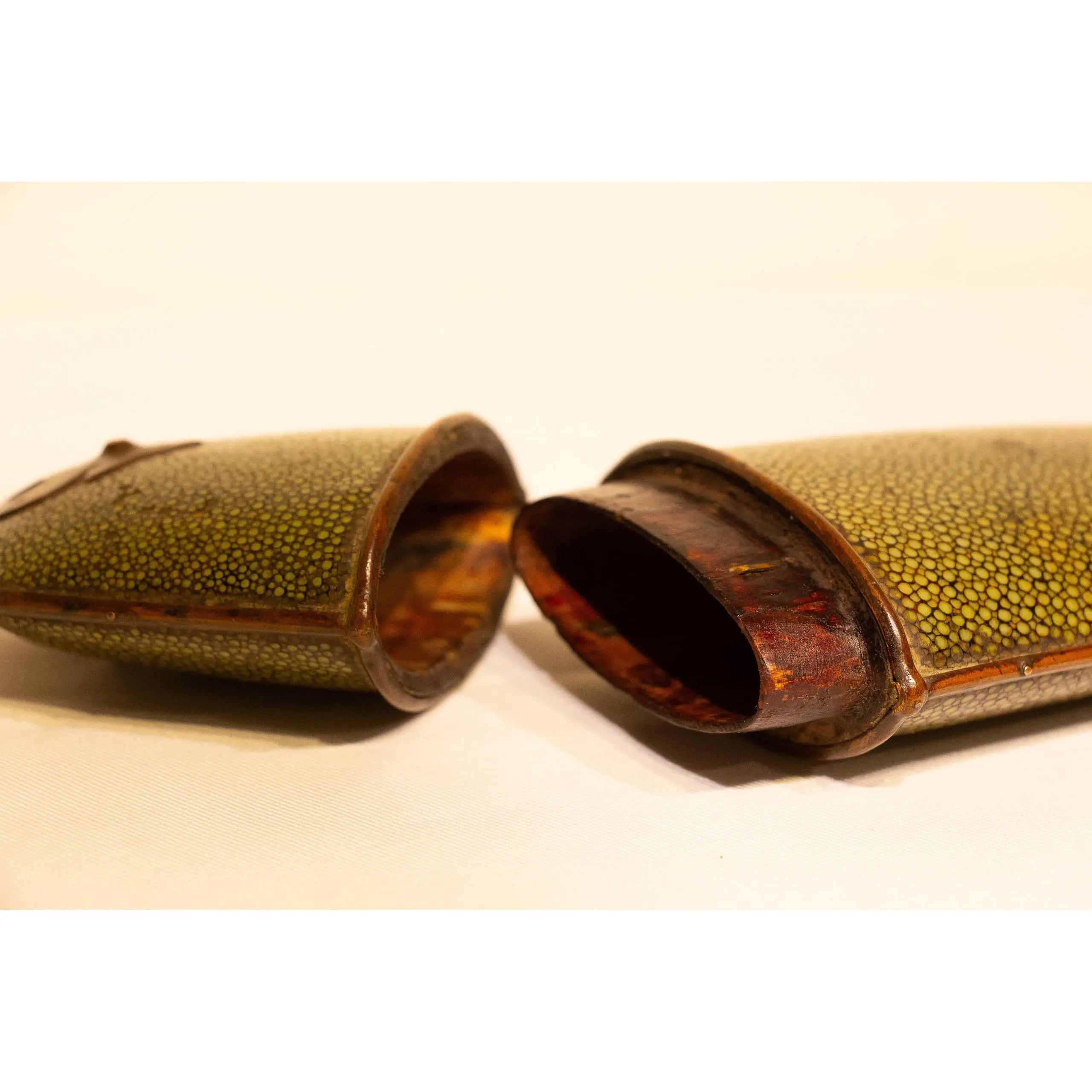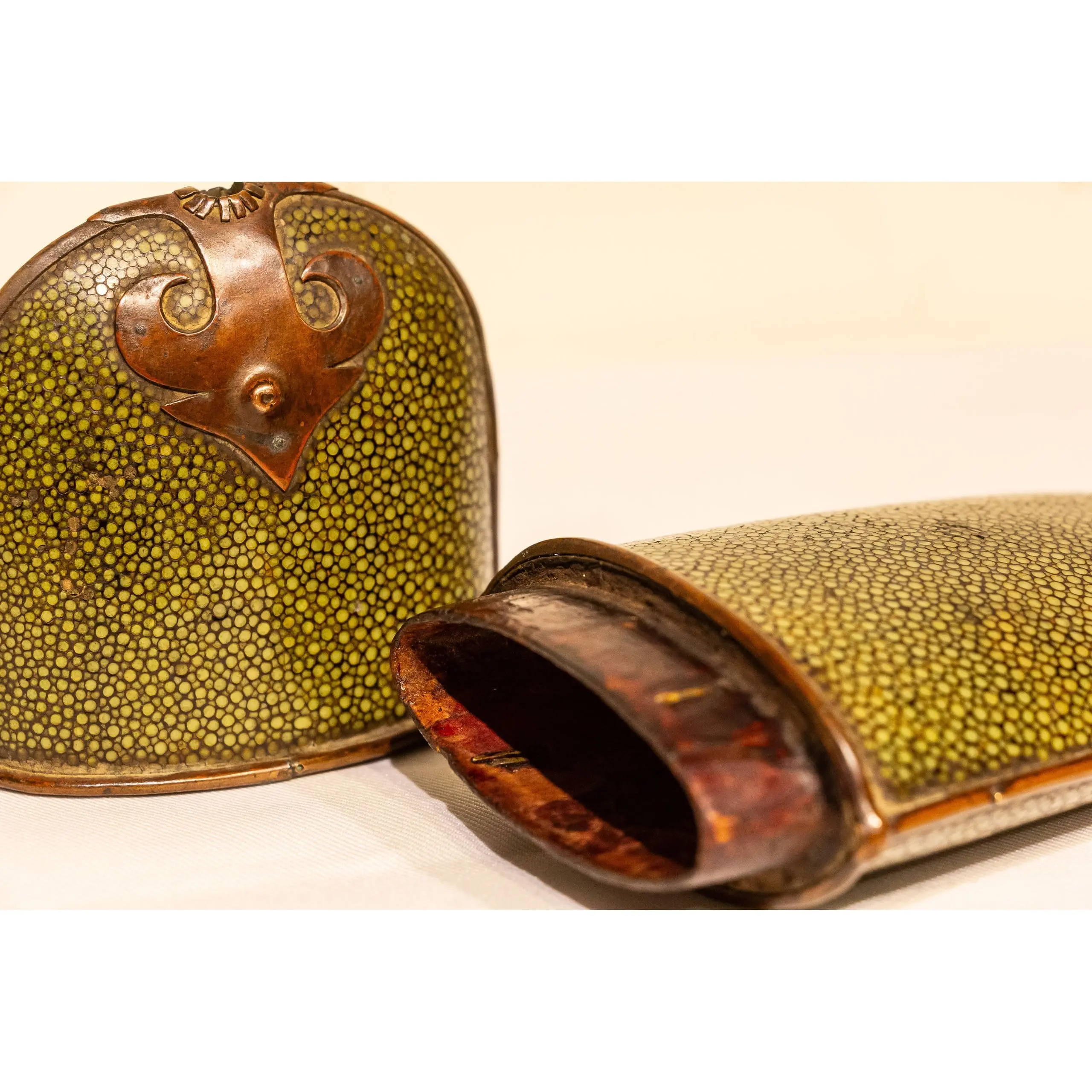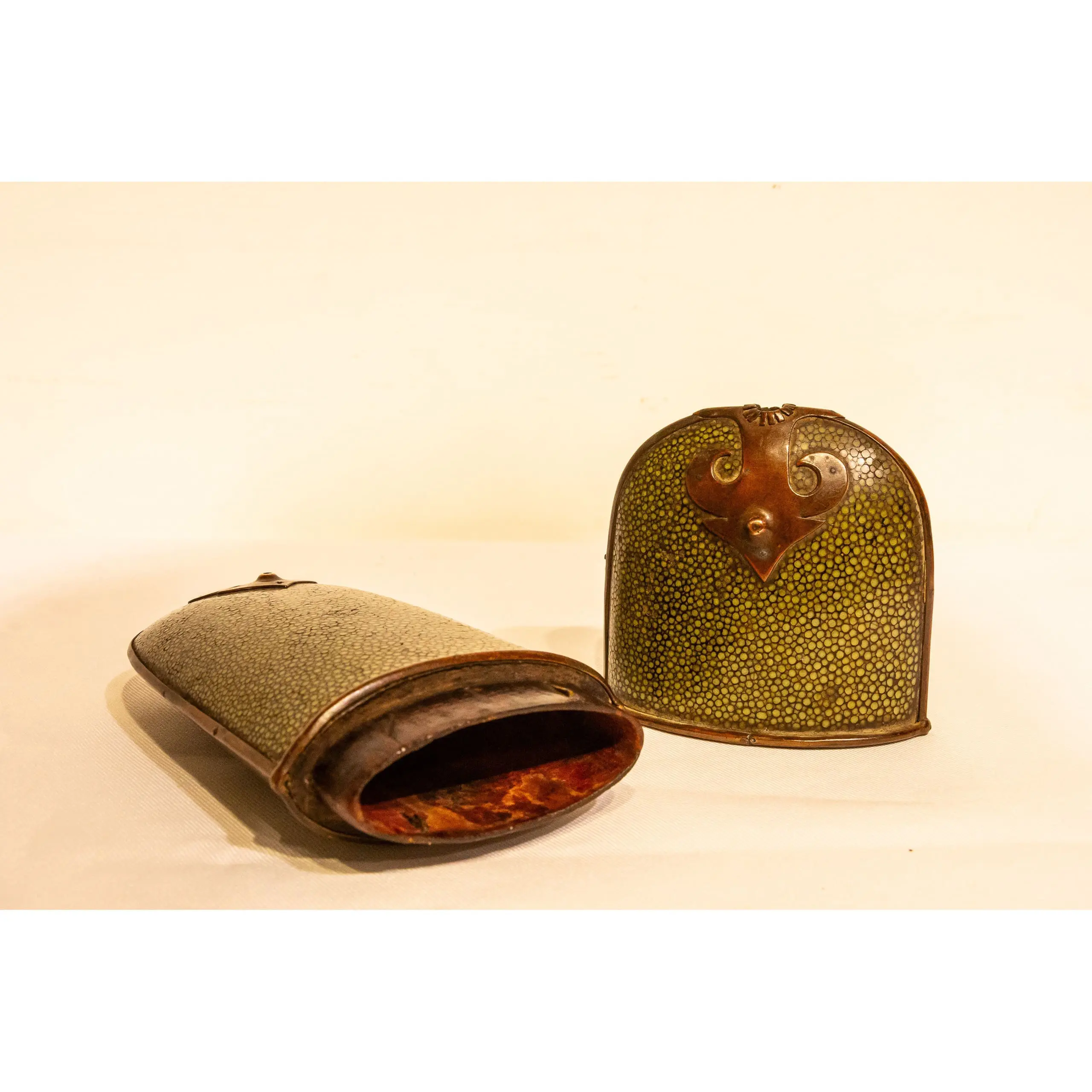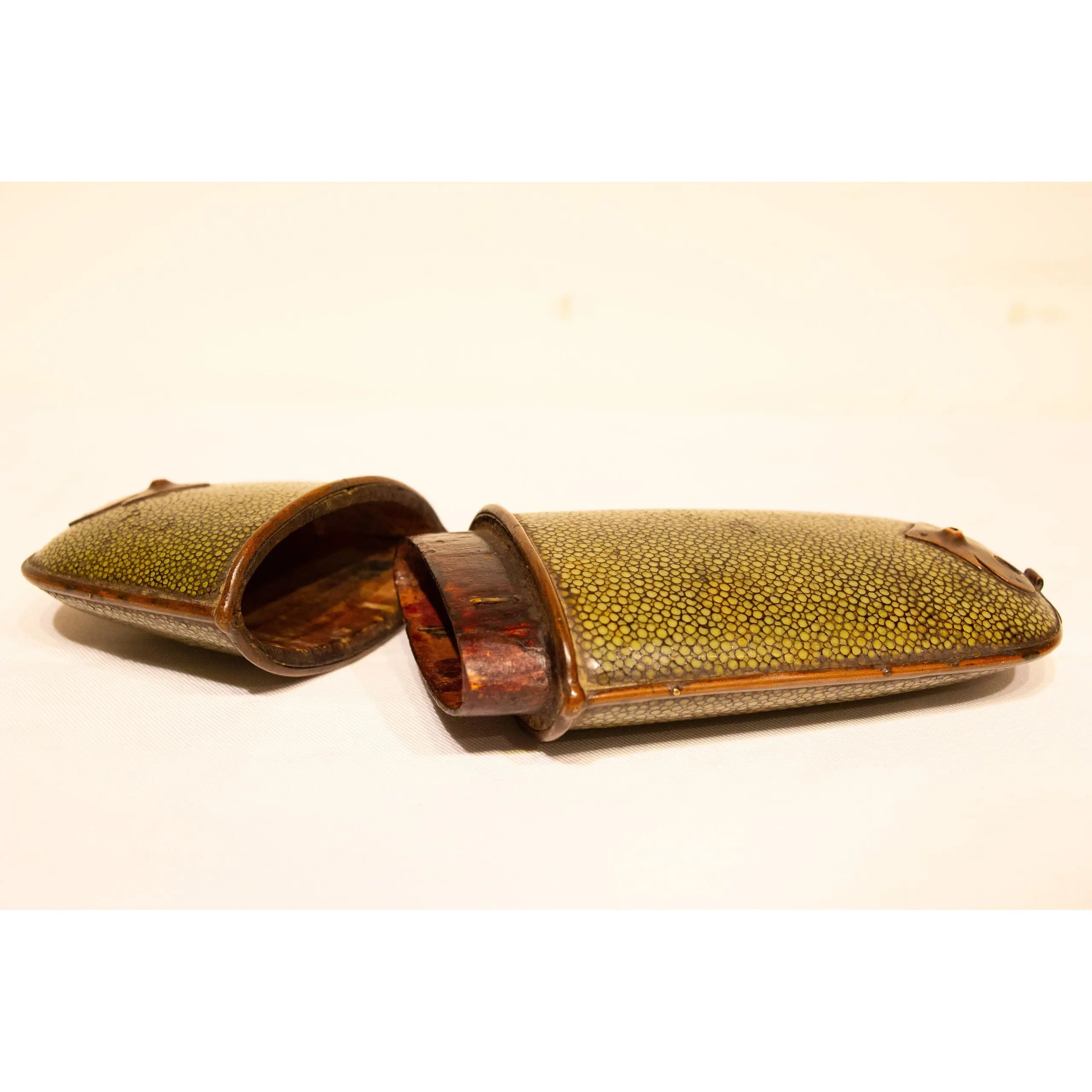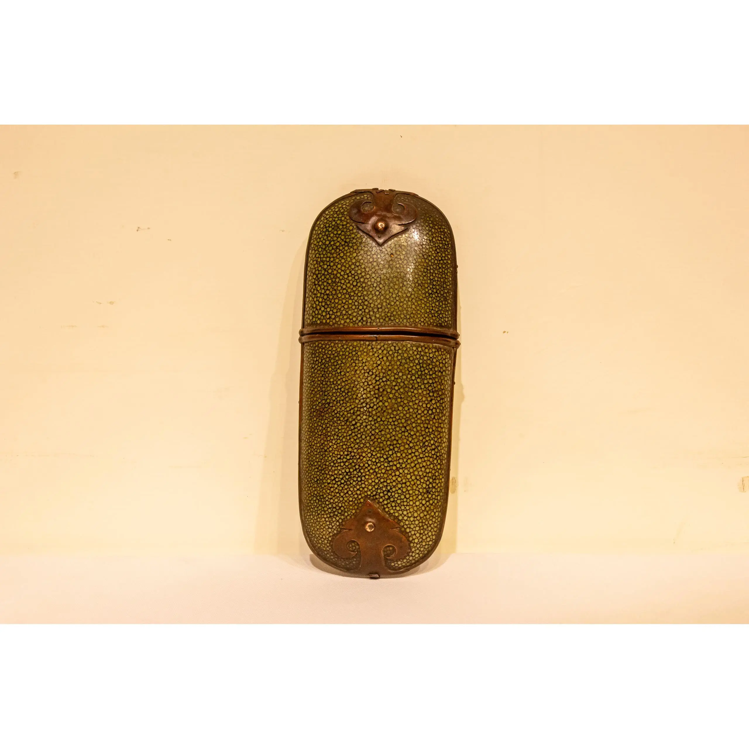 | Description | An elegant eyeglass case crafted from wood and covered in green-dyed sharkskin, bordered with brass fittings and adorned with ornamental mounts at each end. |