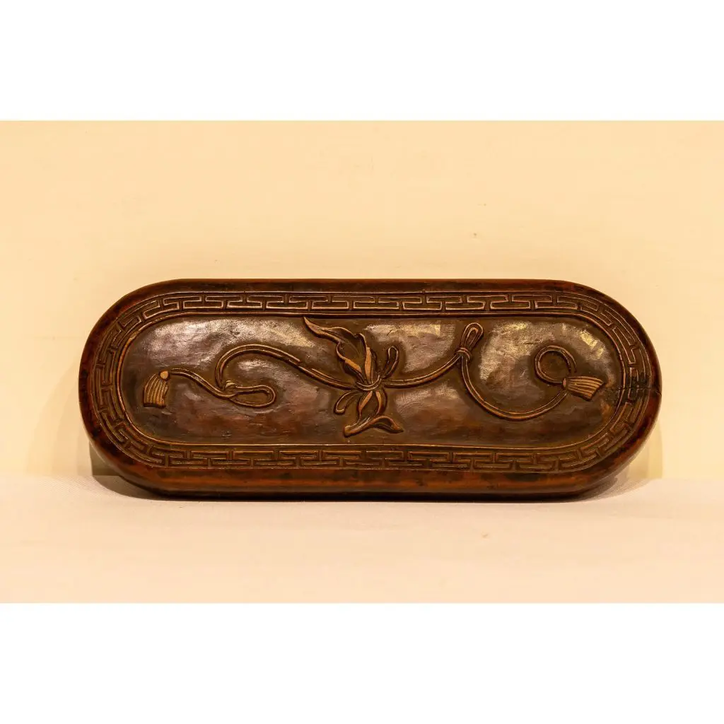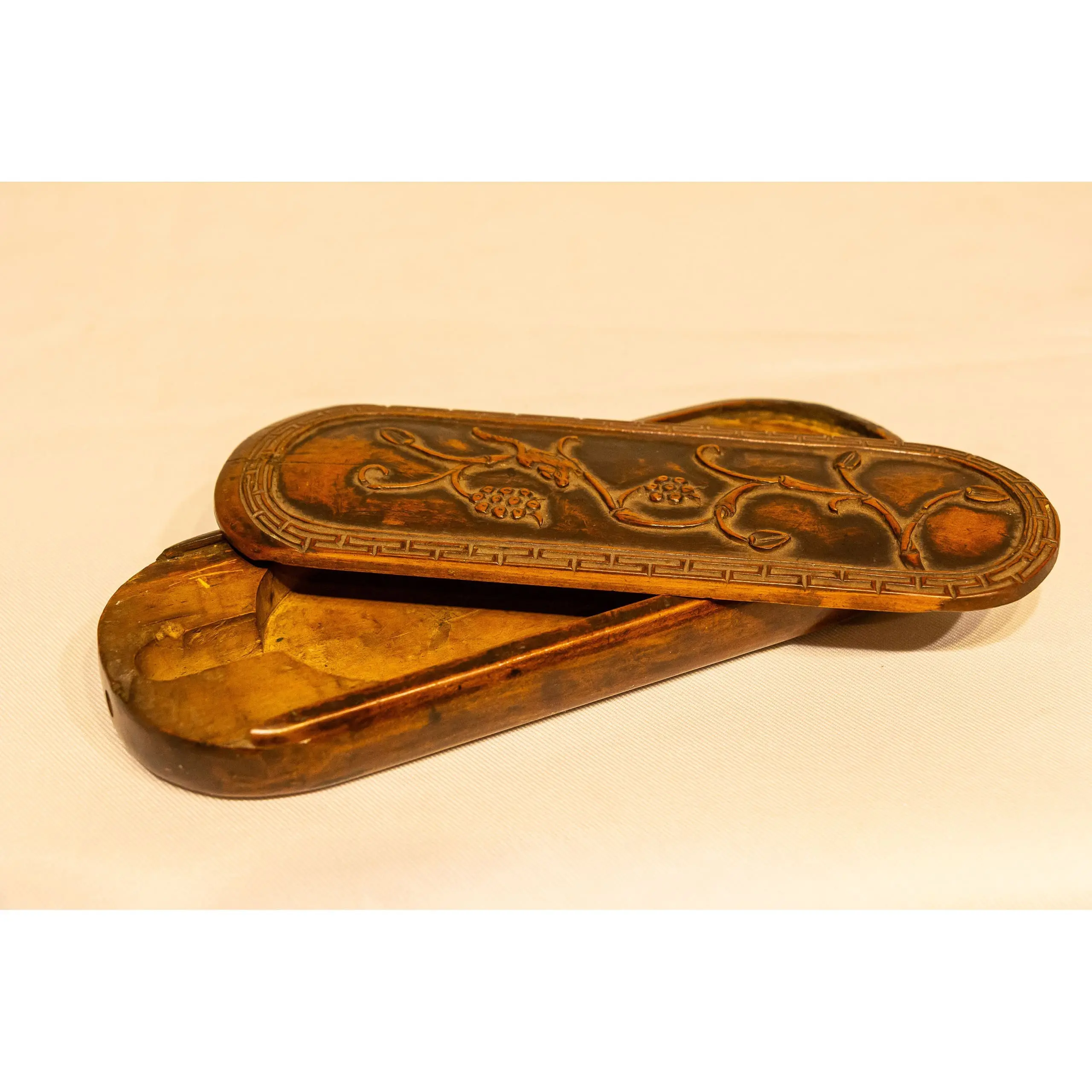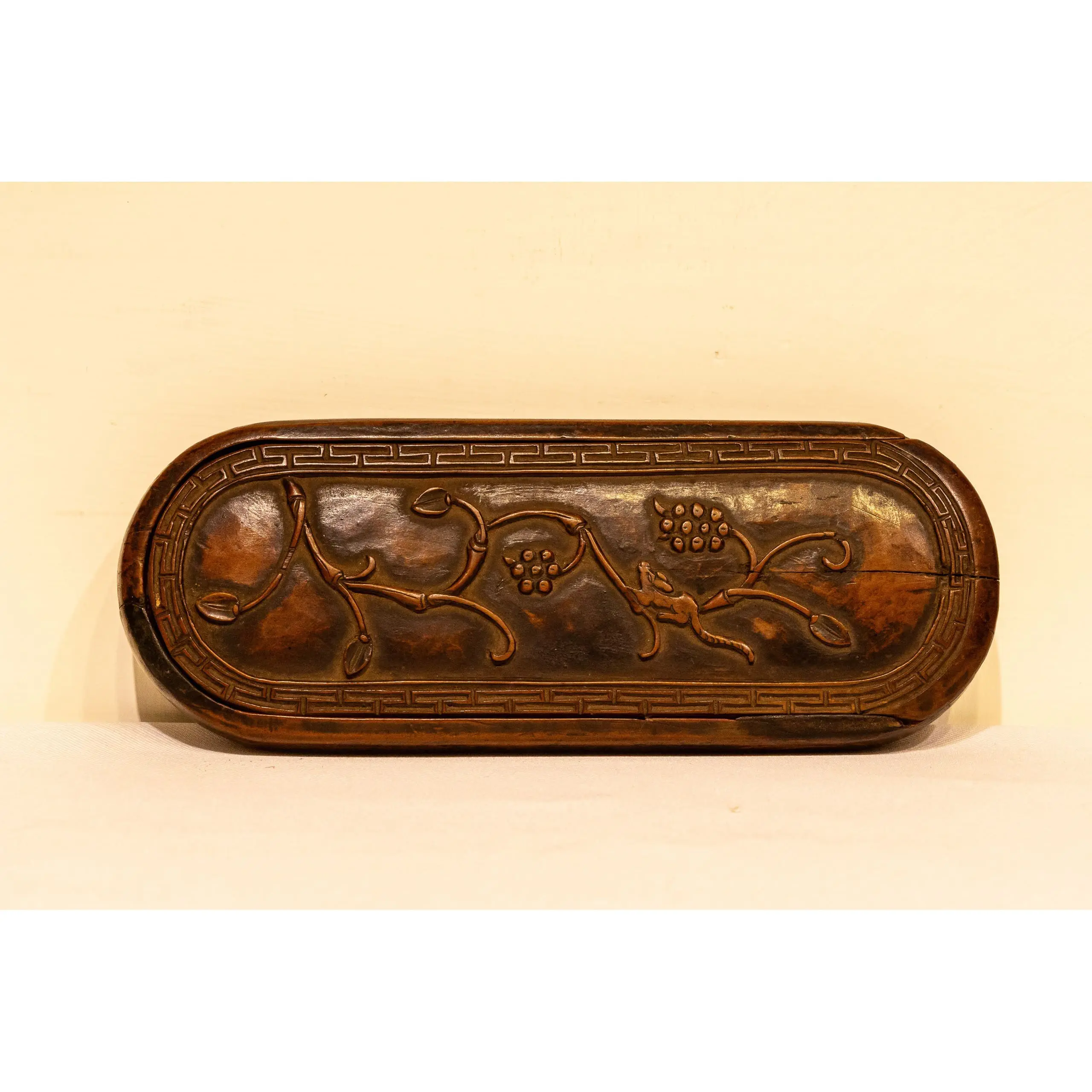 | Description | A refined eyeglass case carved from Huangyang (boxwood), featuring graceful relief carvings of grapevines and clusters symbolizing abundance and prosperity. |
