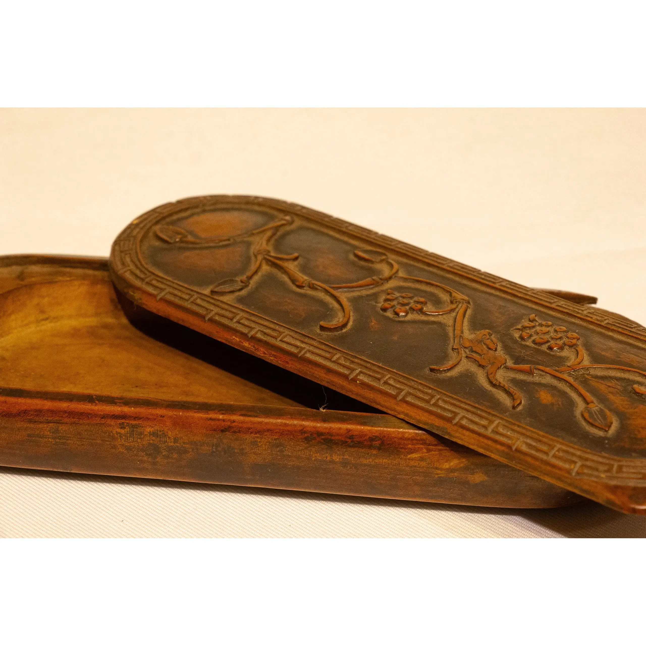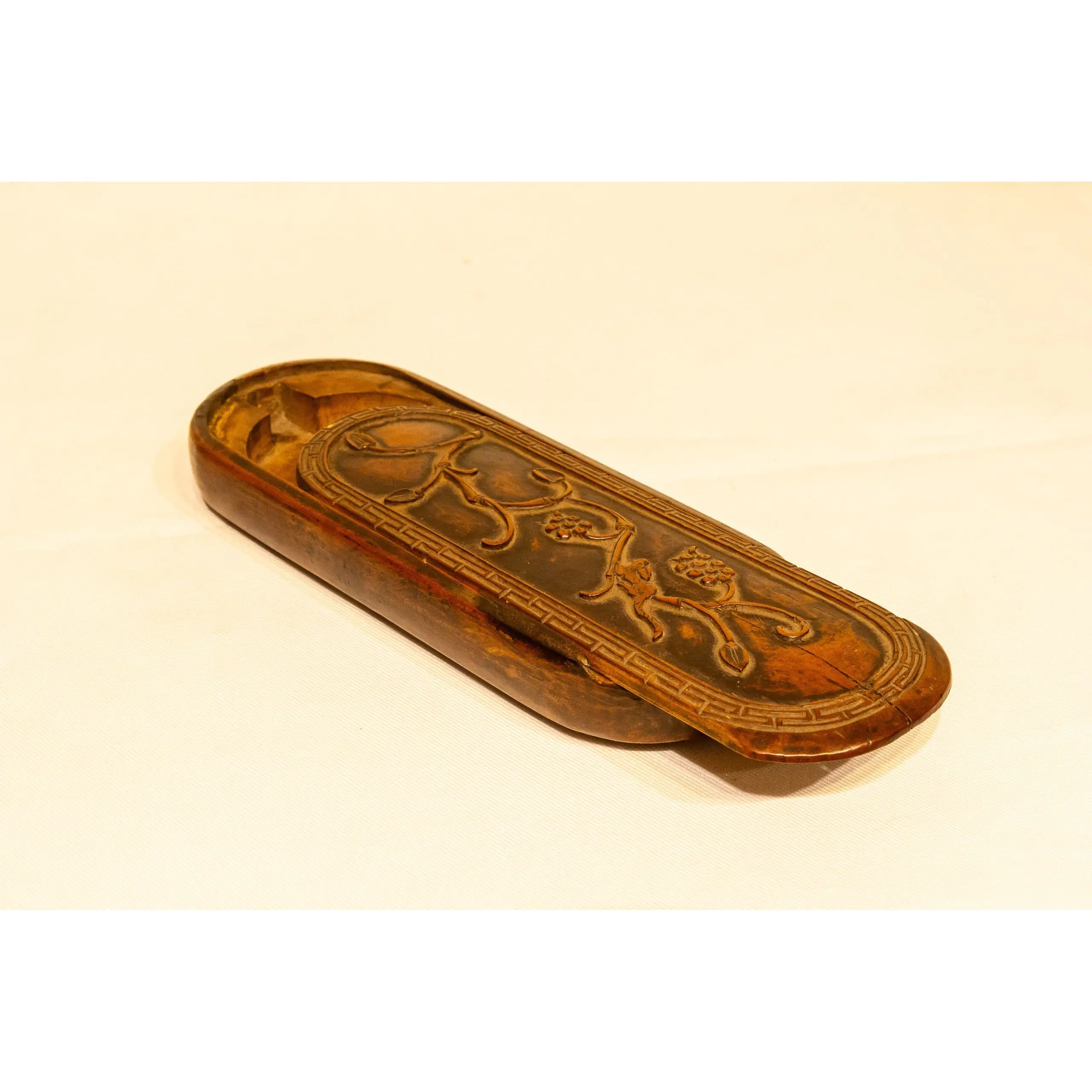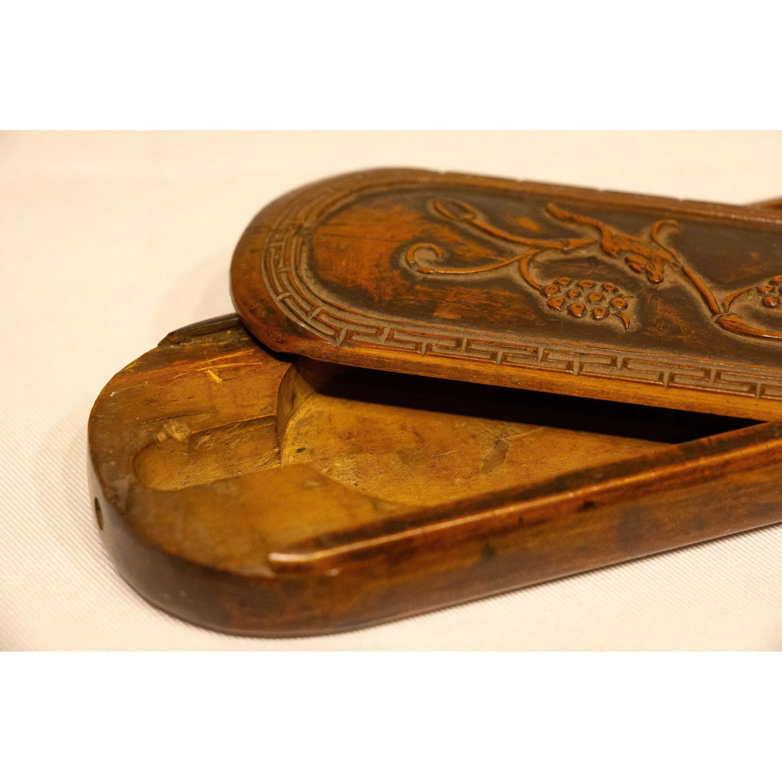 | Description | A refined eyeglass case carved from Huangyang (boxwood), featuring graceful relief carvings of grapevines and clusters symbolizing abundance and prosperity. |