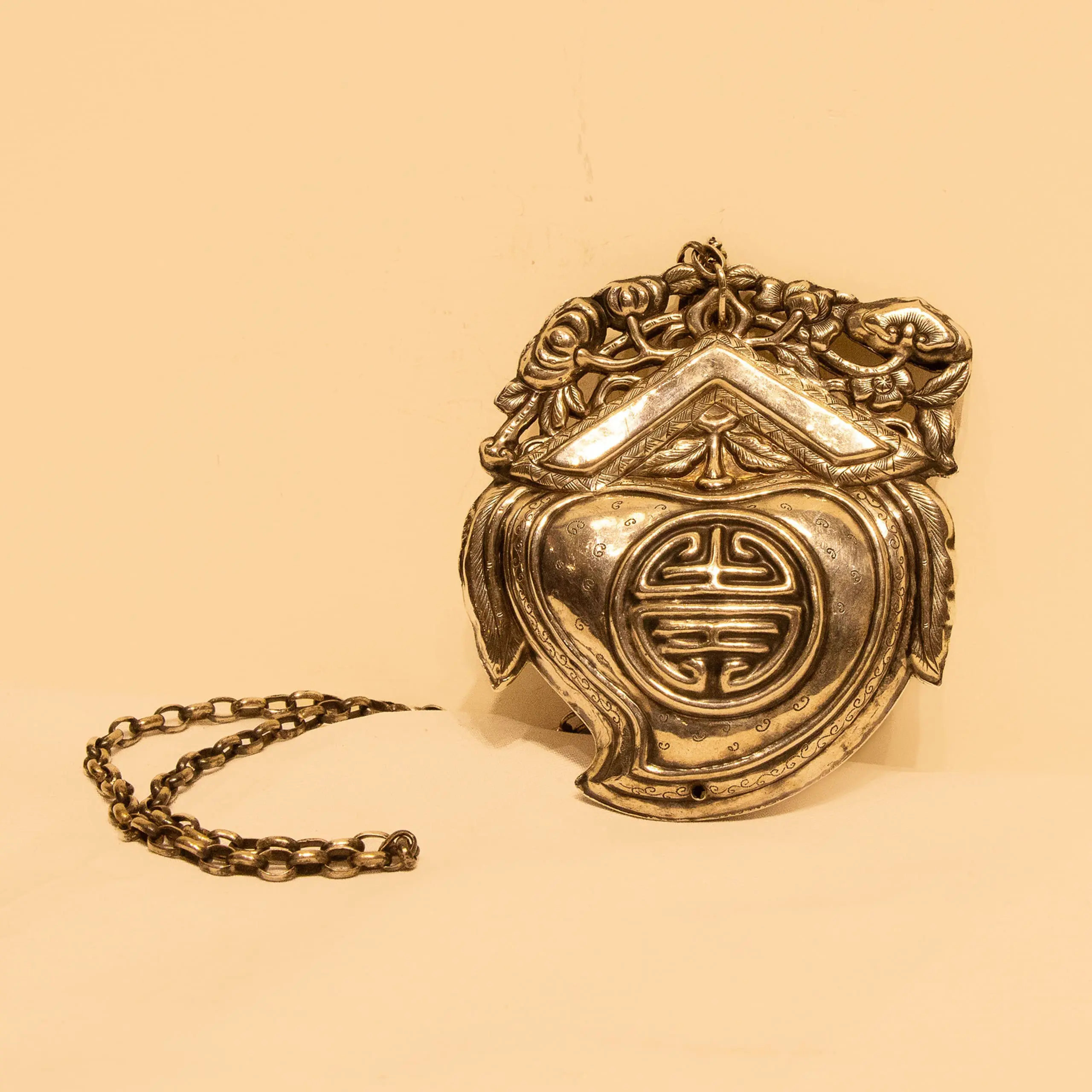 | Description | A finely crafted silver amulet shaped like a peach, symbolizing longevity and immortality. The front bears the “Fu” (福) character for good fortune, surrounded by floral and scroll motifs in relief |