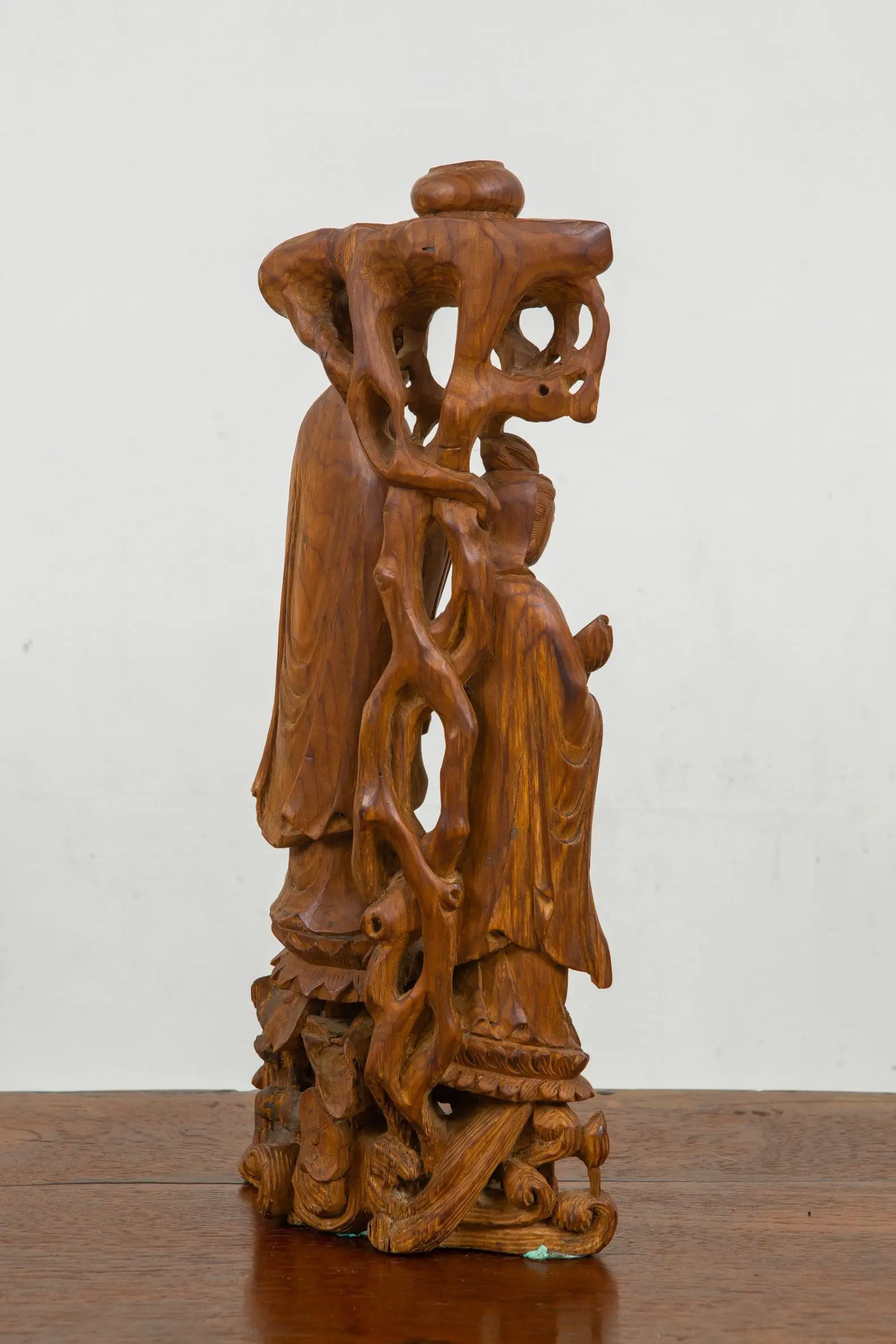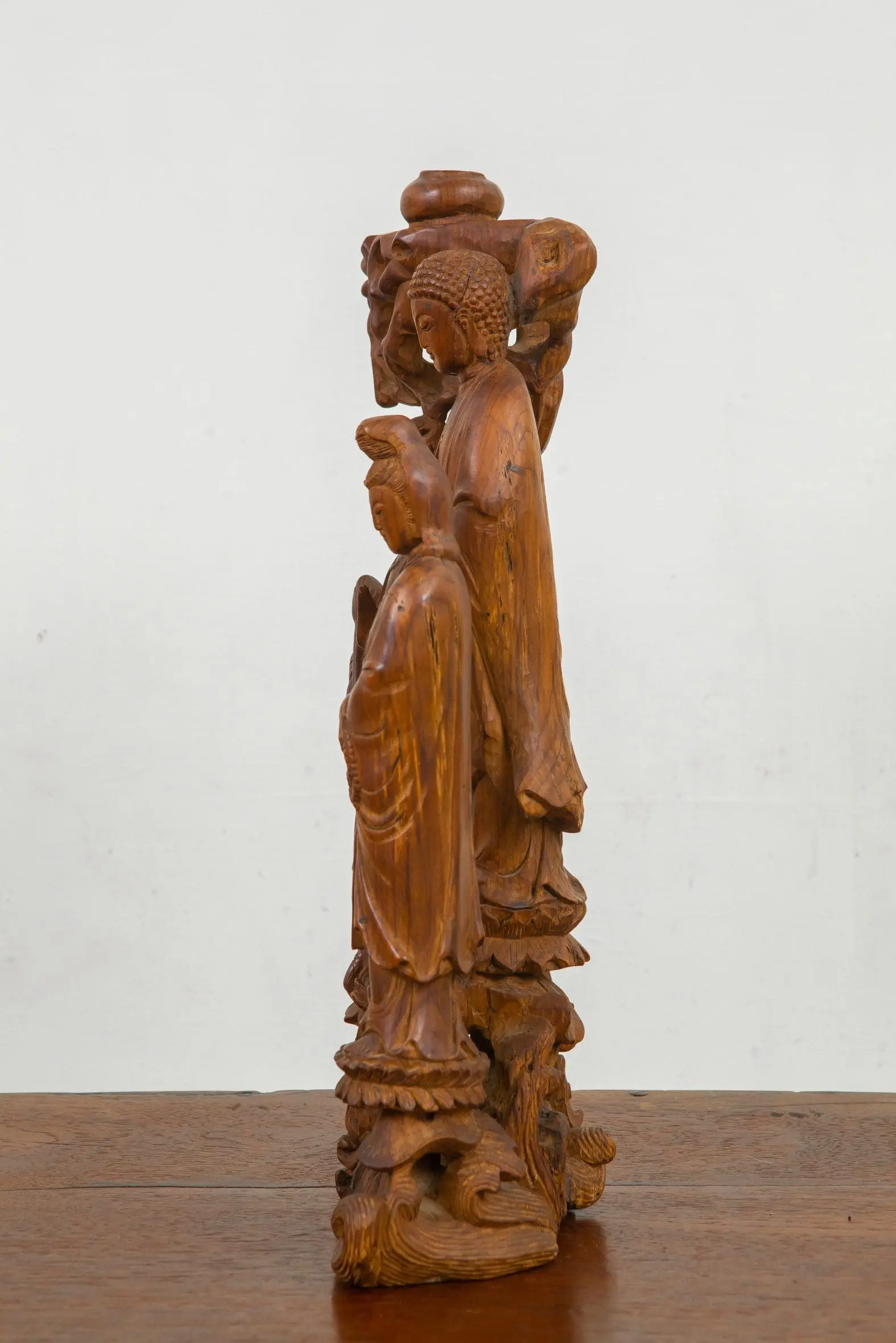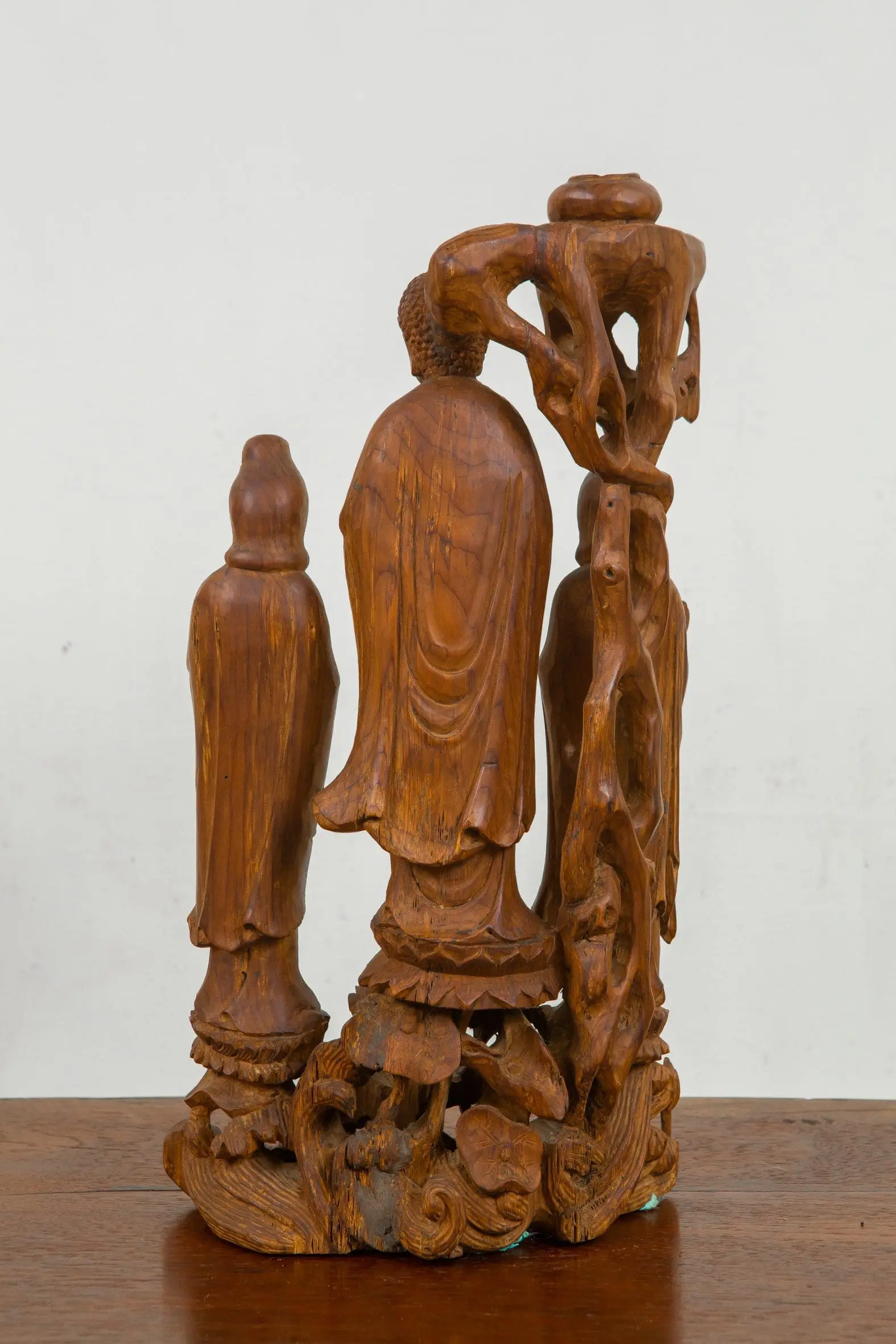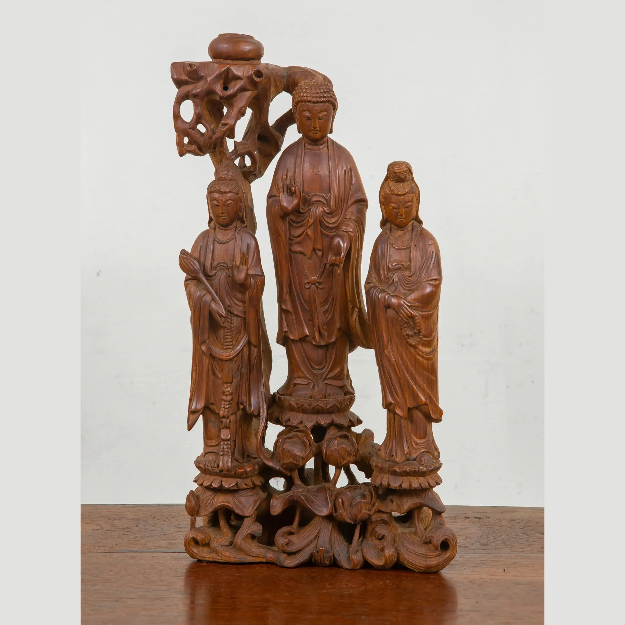 | Description | Buddha and Kuan Yins: A finely carved grouping of Buddha with two Kuan Yin's standing on lotus flowers thrones, a single tree overhead. |