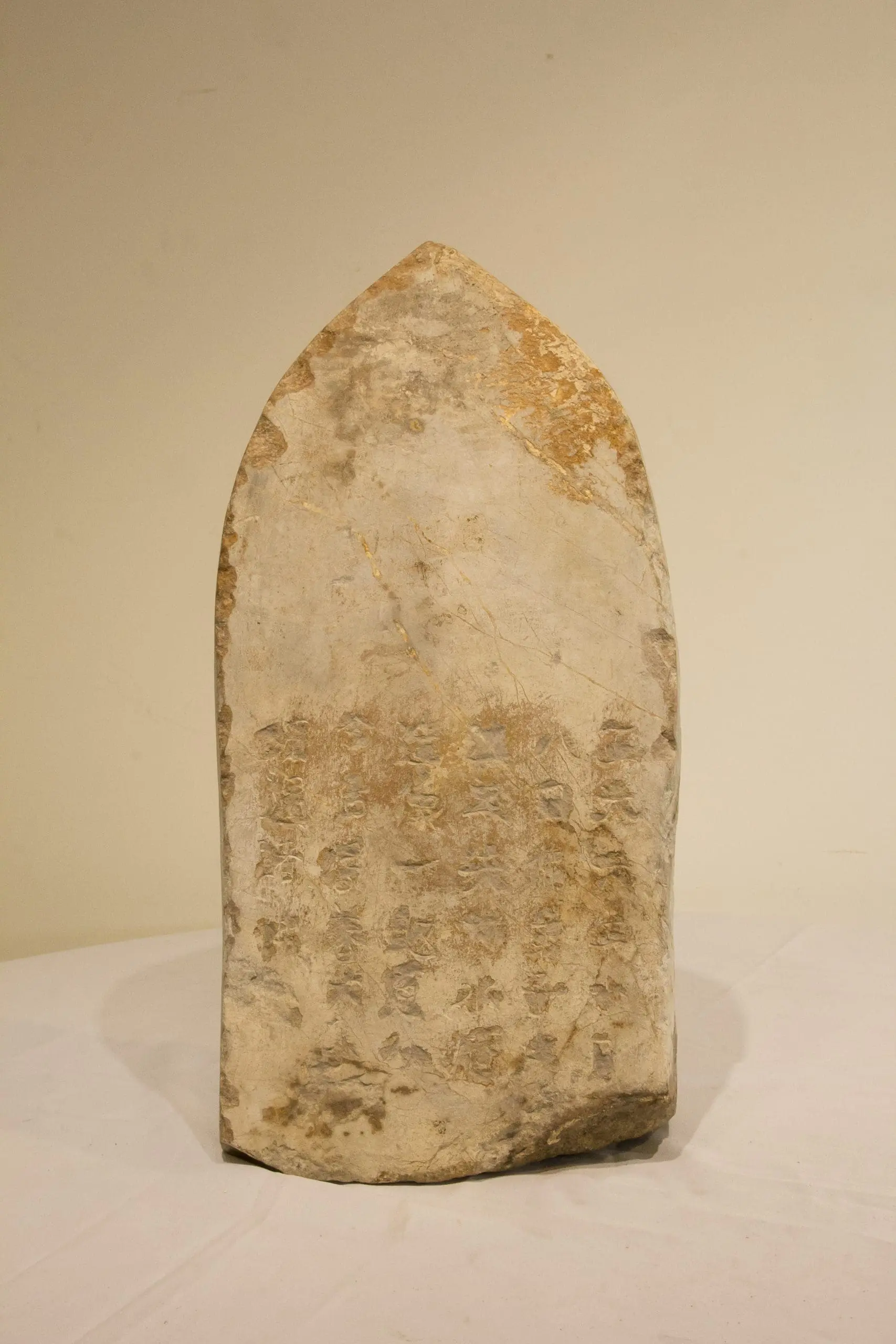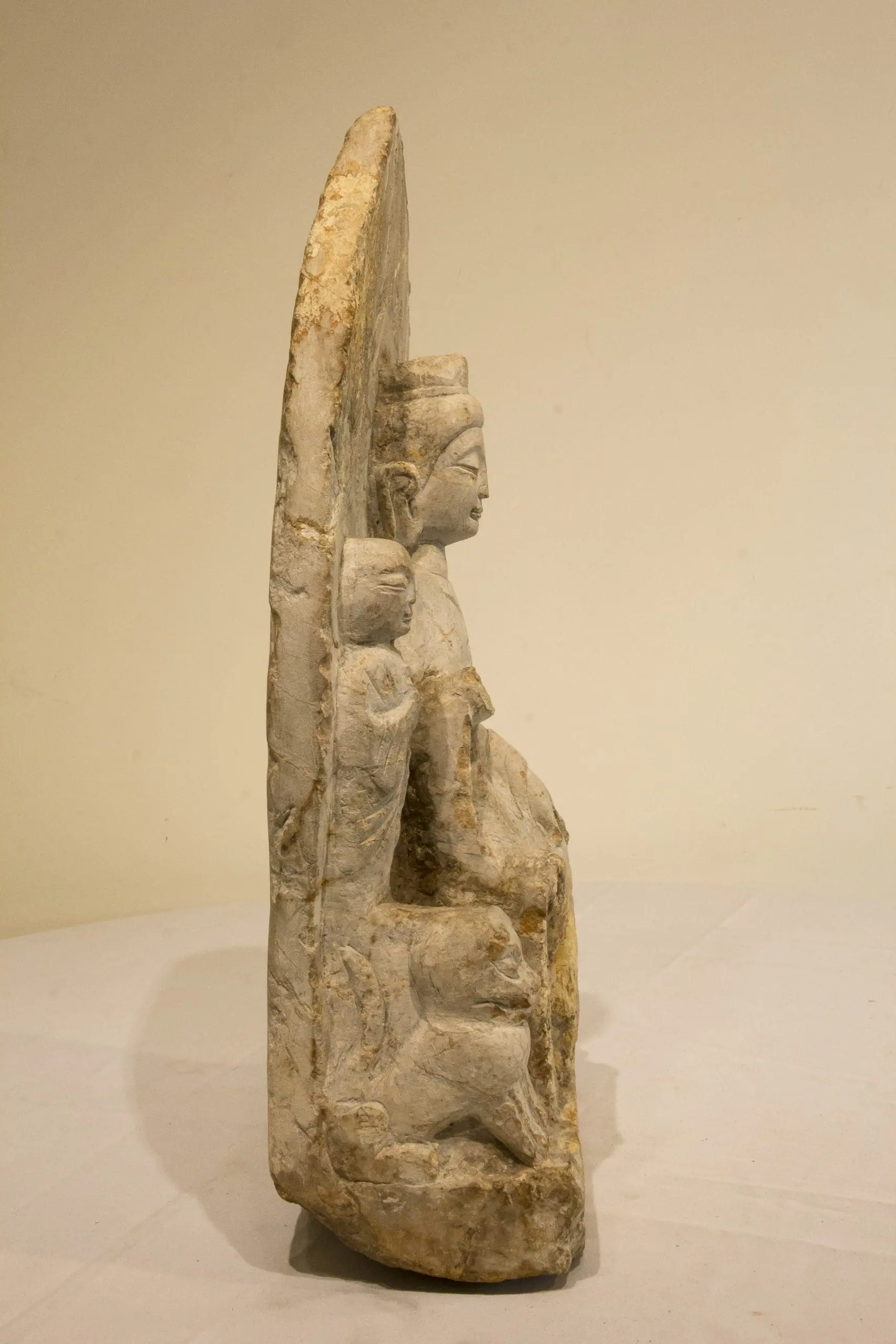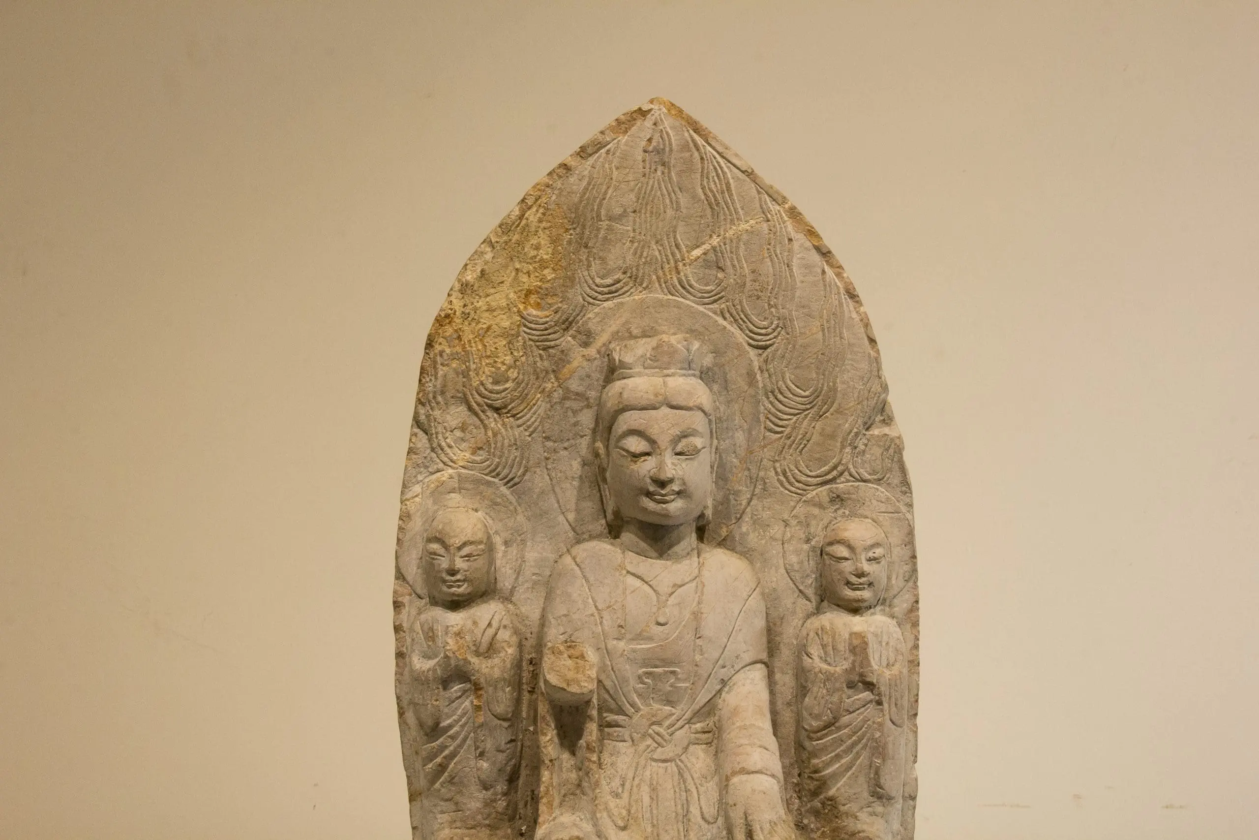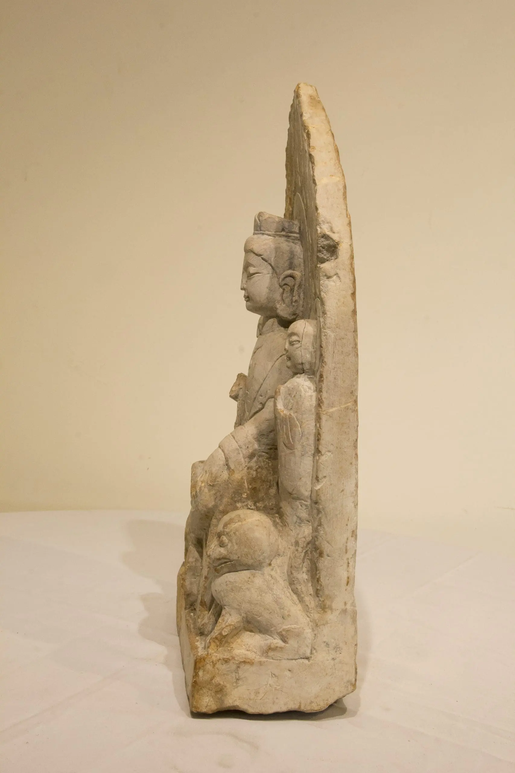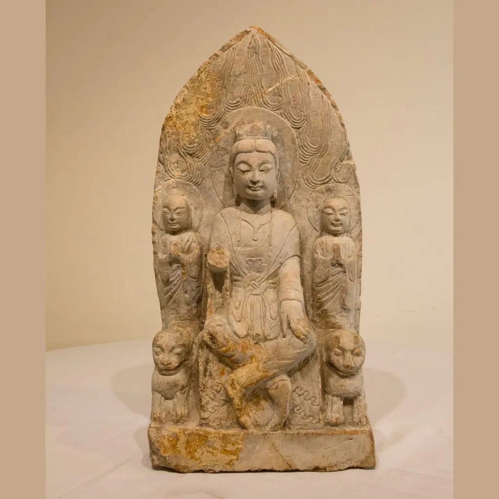 | Description | A Northern Wei dynasty stone stele depicting a seated Buddha with knotted hair, originally in the “Subdue the Elephant” pose, though the right arm is broken at the elbow. Hands and posture convey serene authority, flanked by two standing attendants behind stylized animal figures. A finely incised flame-pattern mandorla frames the scene. Slightly damaged. |