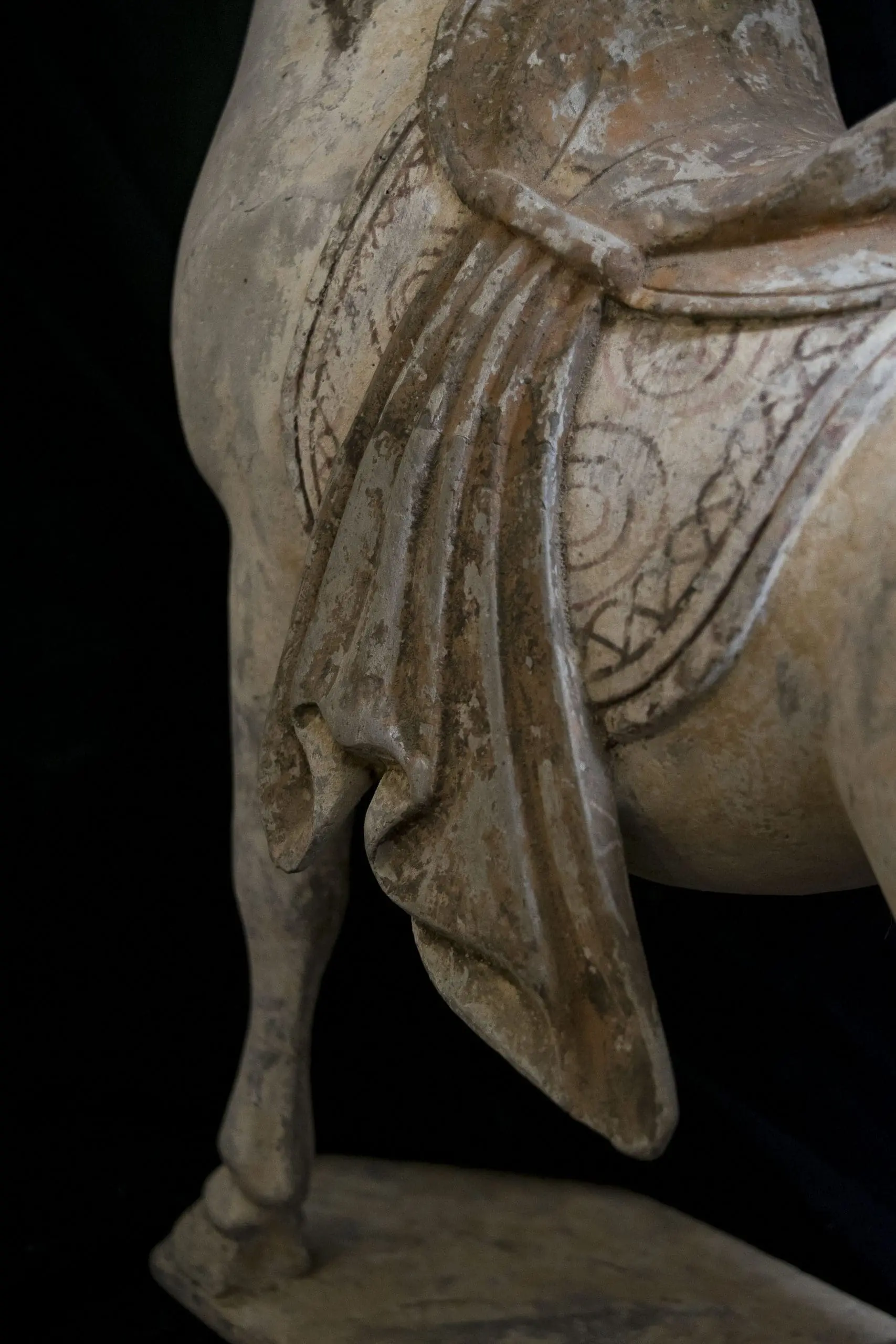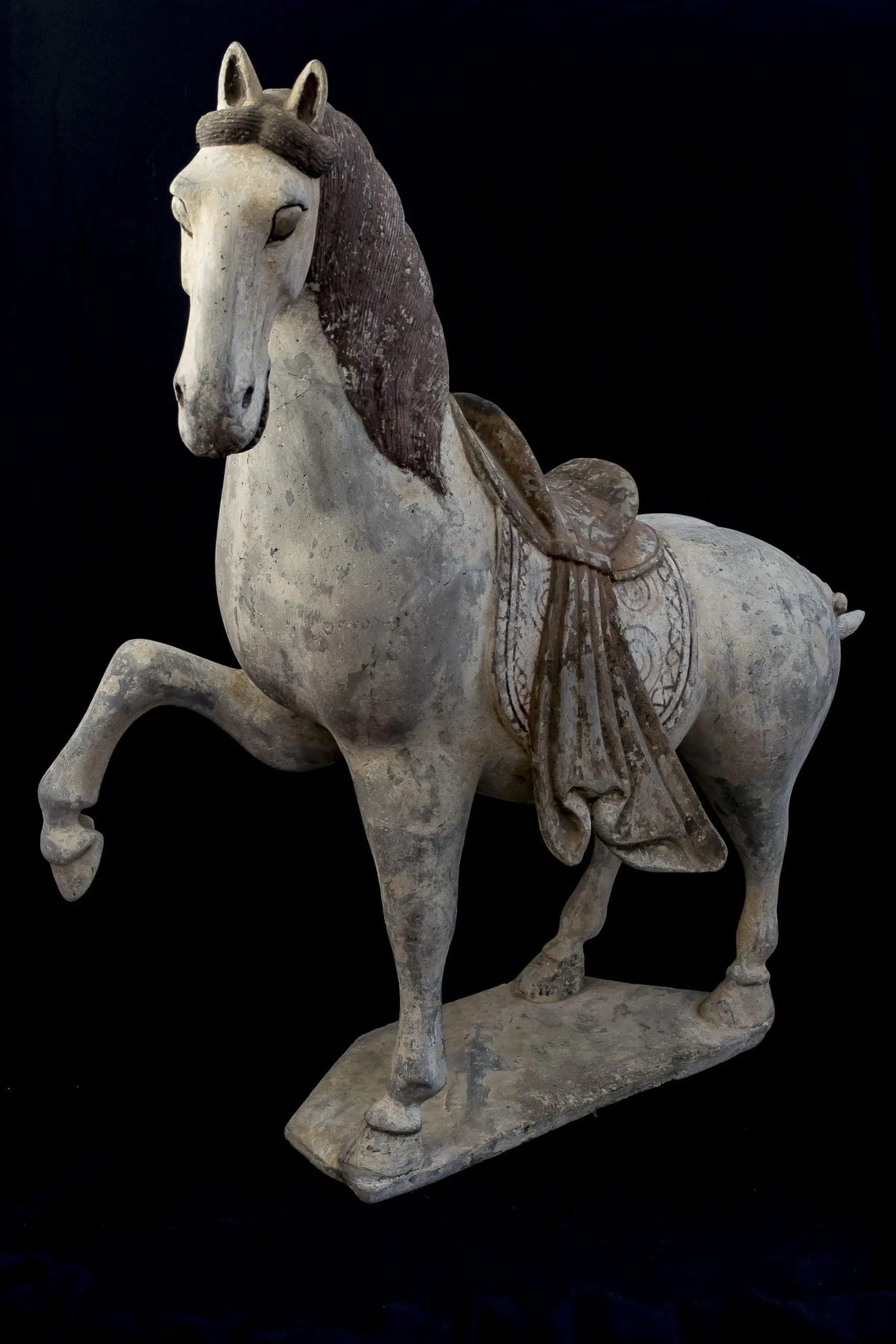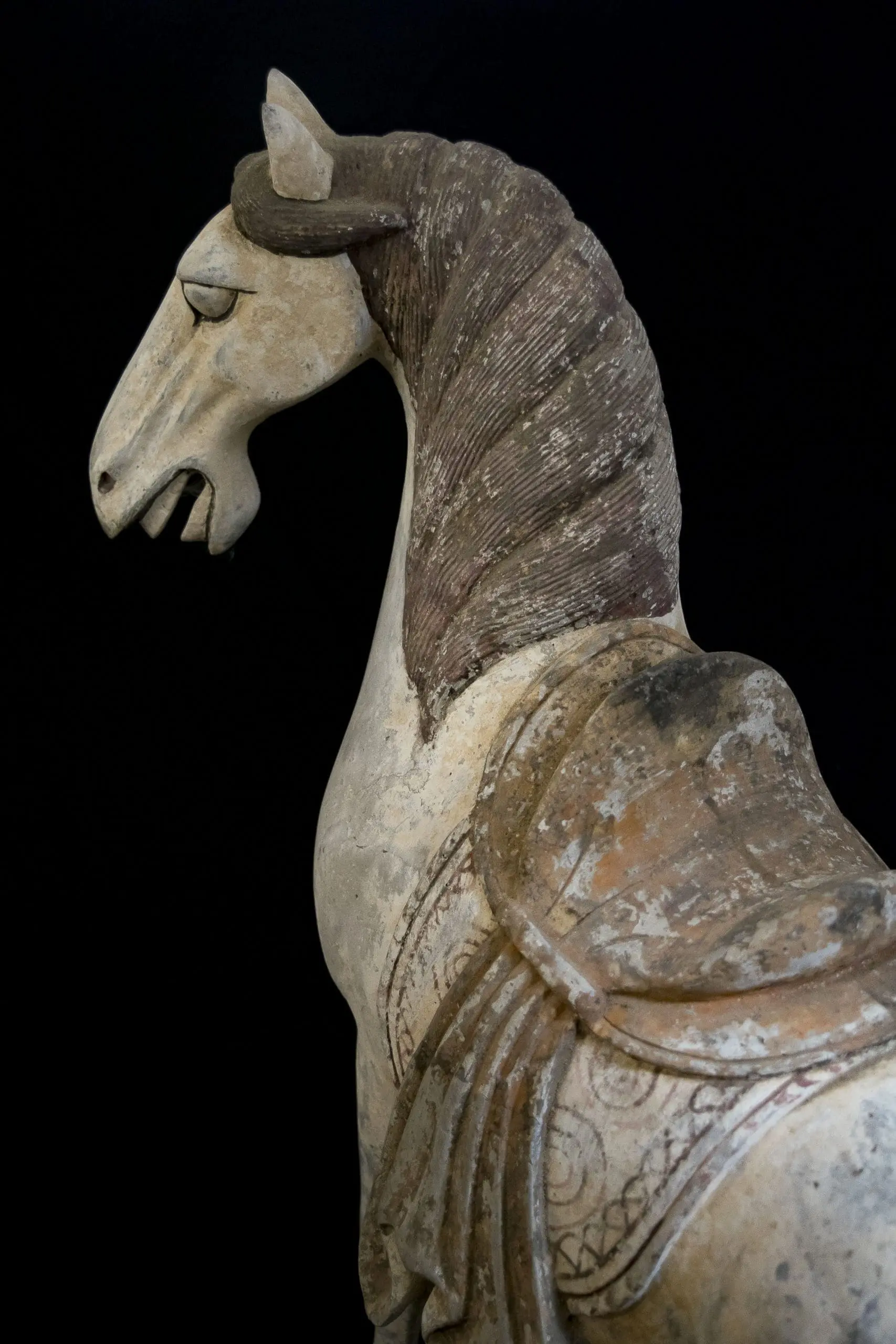 | Description | HORSE WITH RAISED LEG: A large painted figure of a horse with right leg raised and head turned slightly, the mouth open and the ears pricked forward, traces of dark red pigment on the grooved mane and cheeks, orange and red on the saddle and pleated saddle cloth, the eyes detailed in black. Some restoration. TL Tested. |