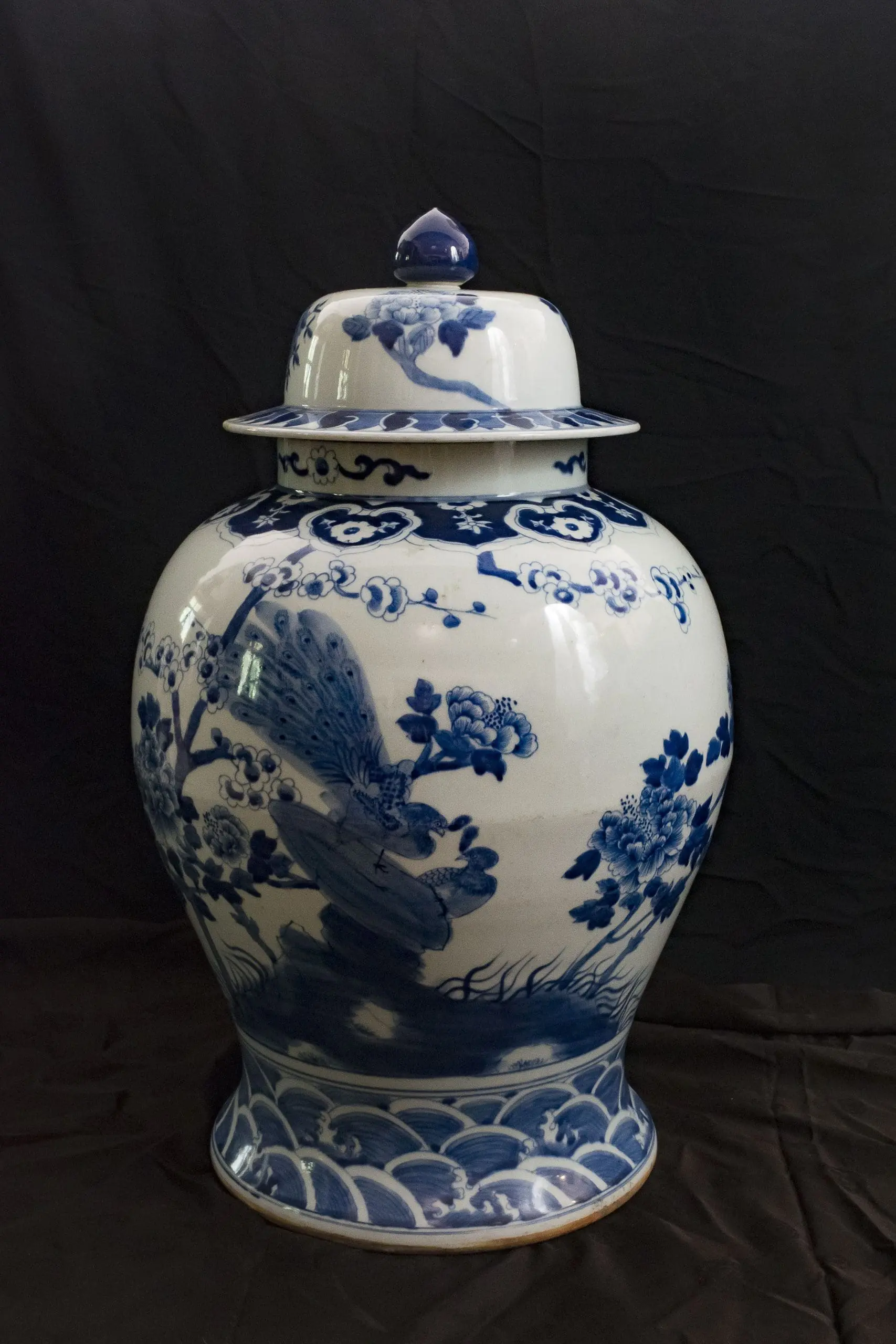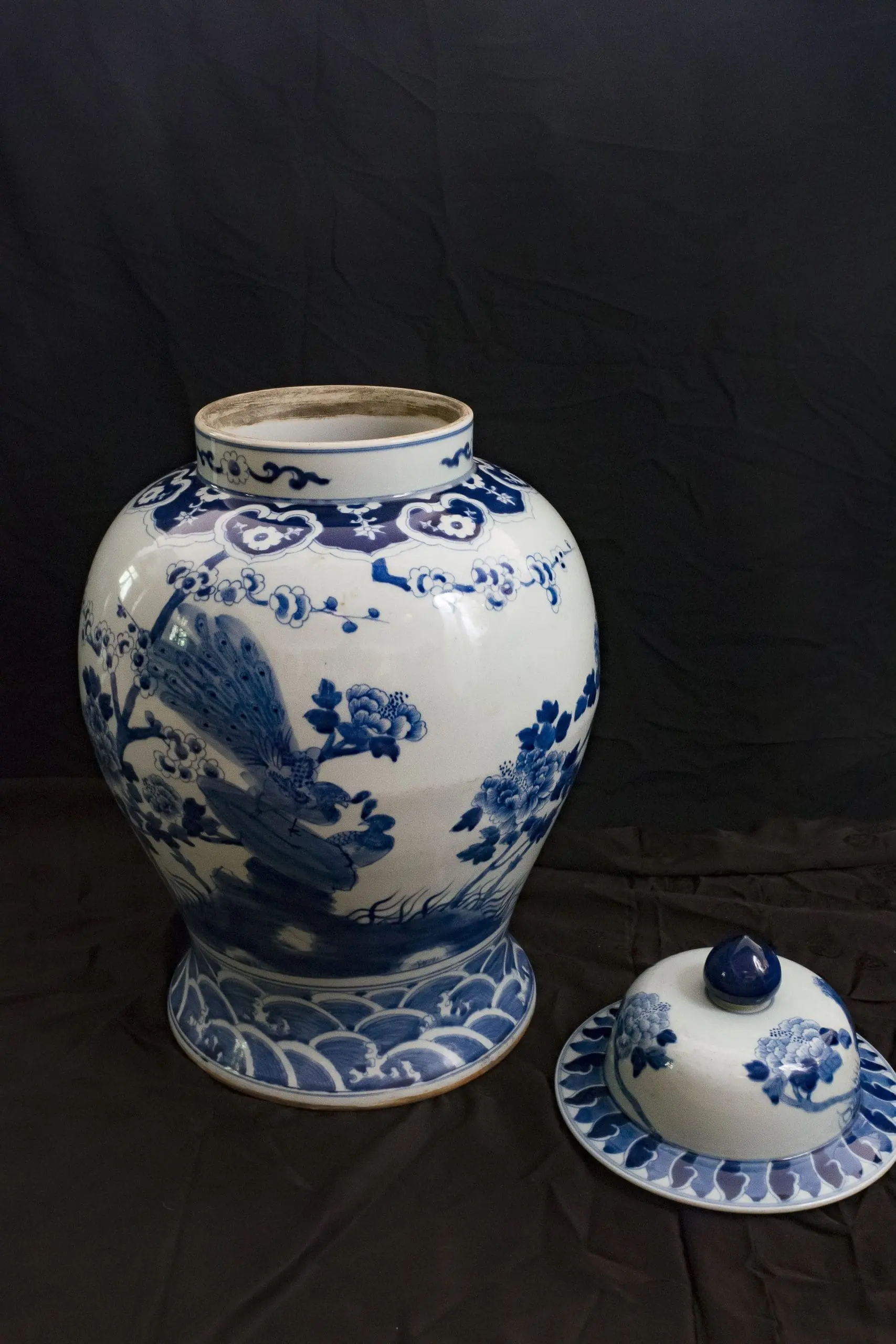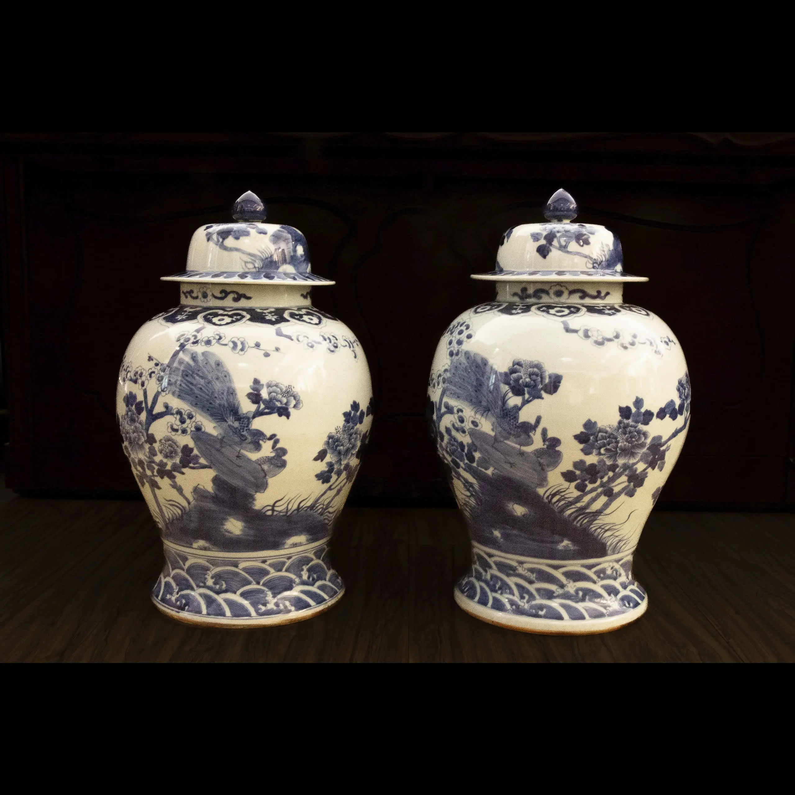 | Description | A pair of large covered jars with wide shoulders, underglaze paintings of birds, including peacocks, flying among the trees, wave paintings at the base. One lid is slightly damaged. |