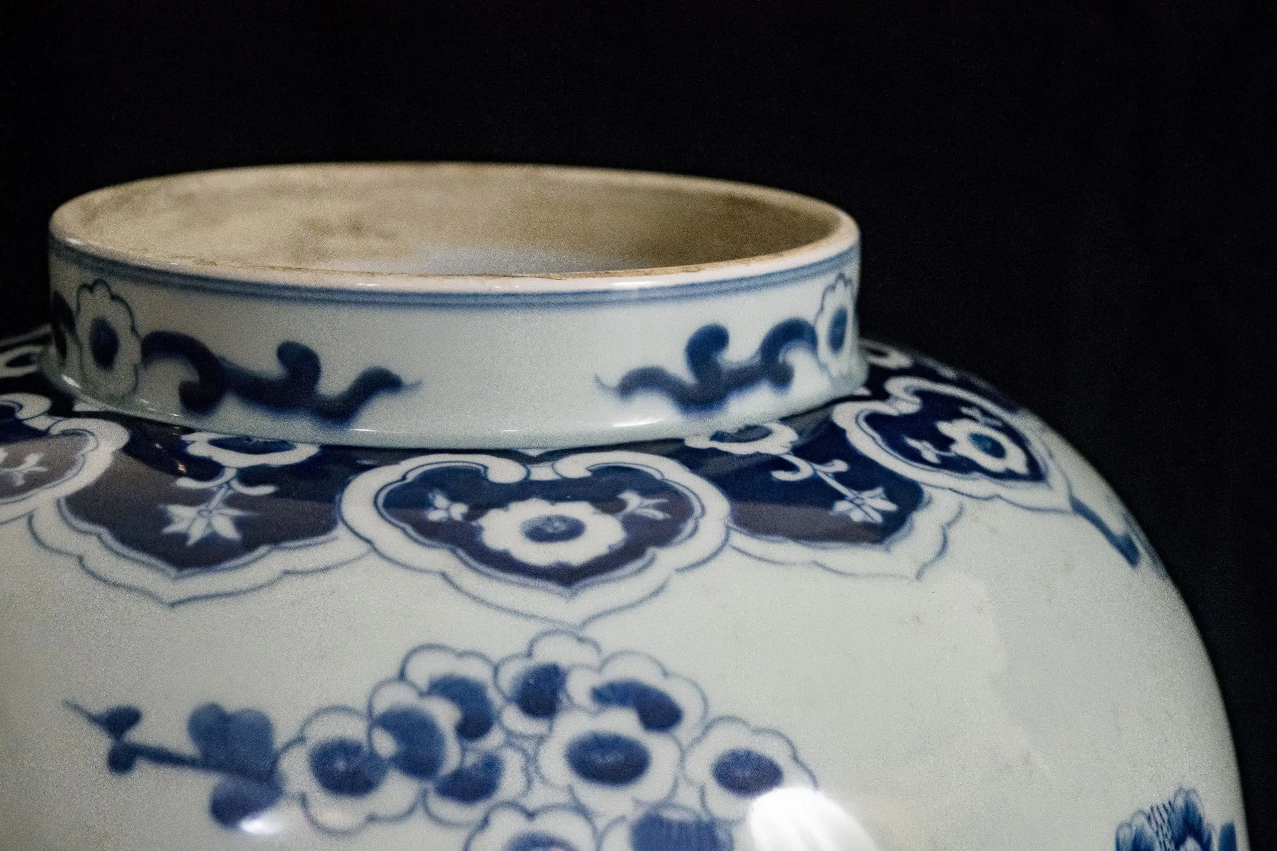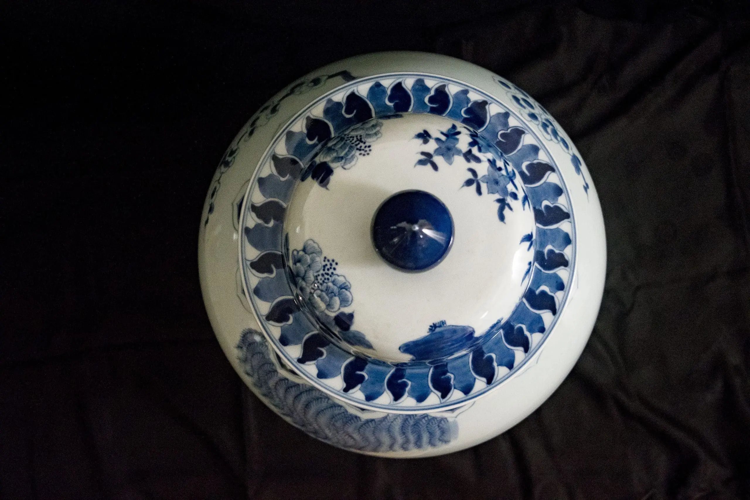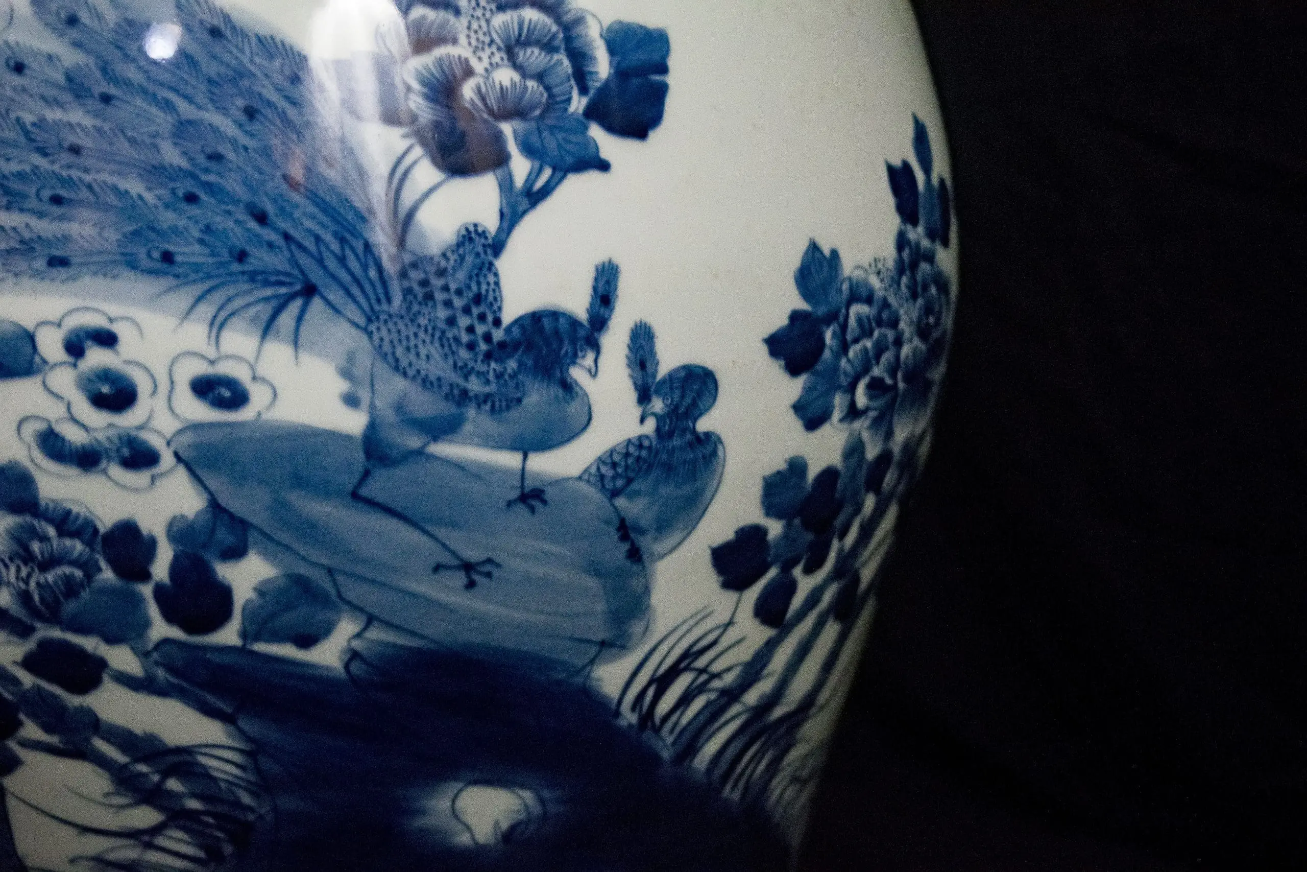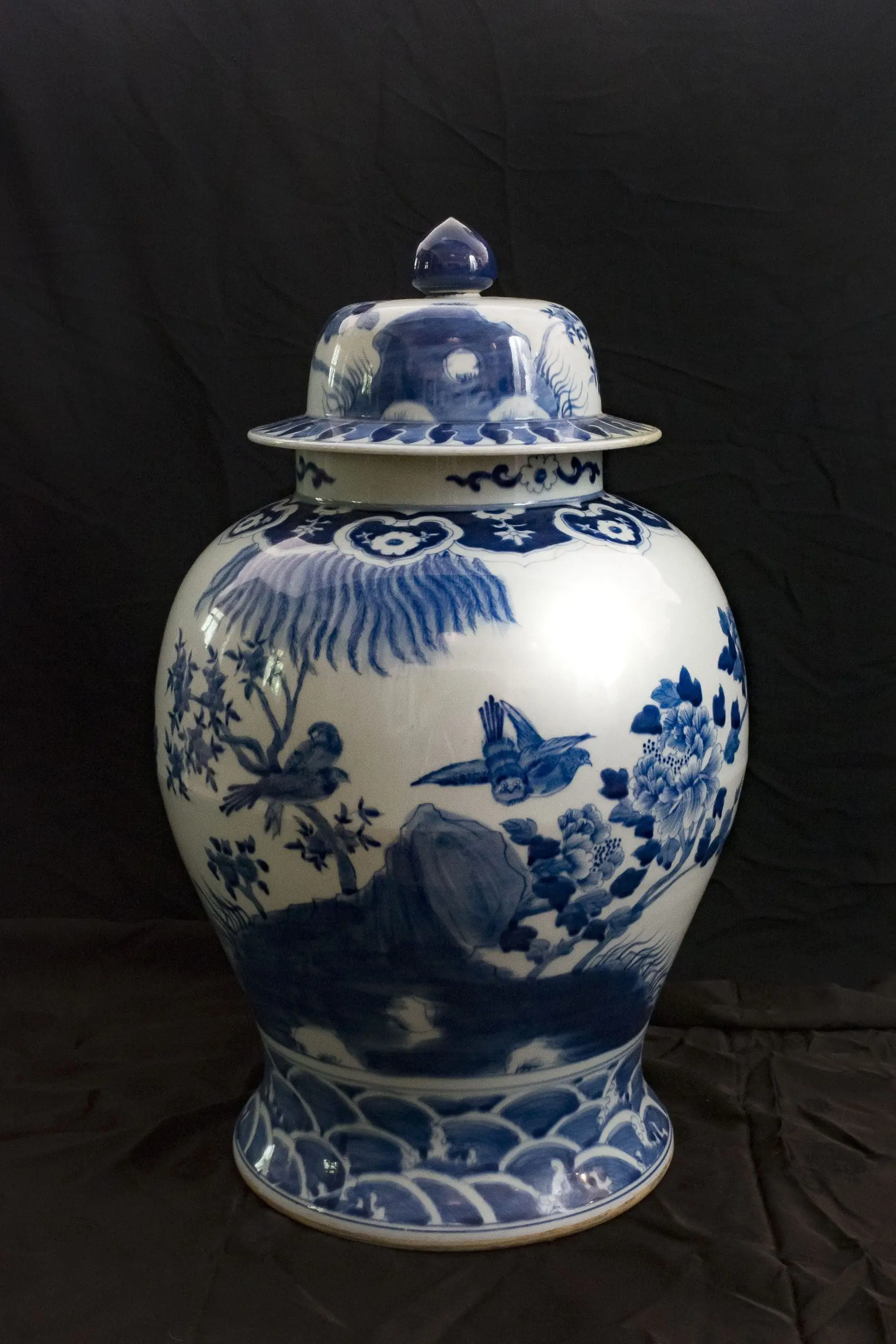 | Description | A pair of large covered jars with wide shoulders, underglaze paintings of birds, including peacocks, flying among the trees, wave paintings at the base. One lid is slightly damaged. |