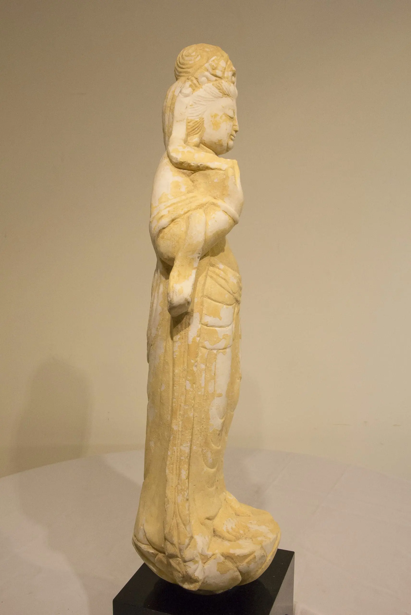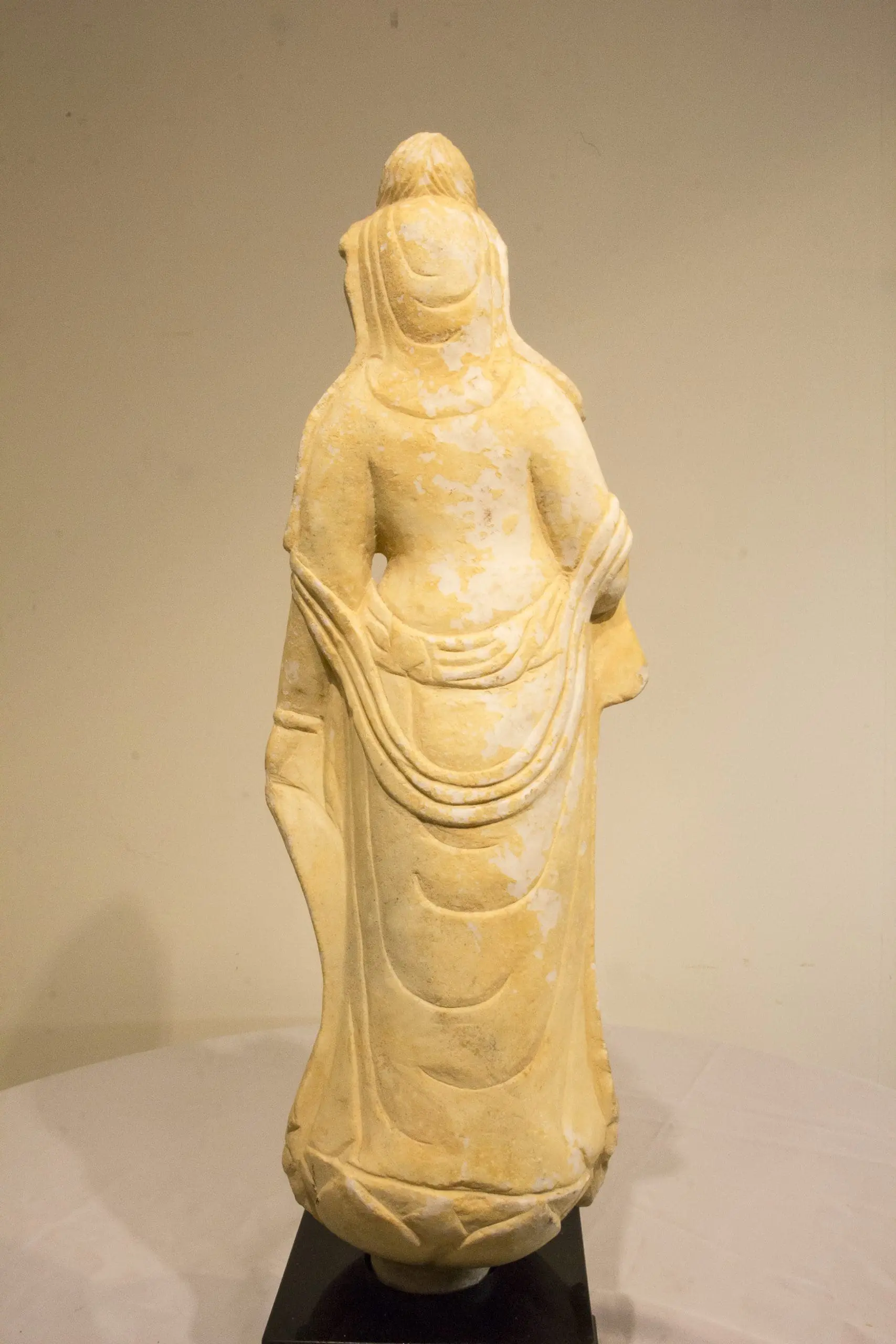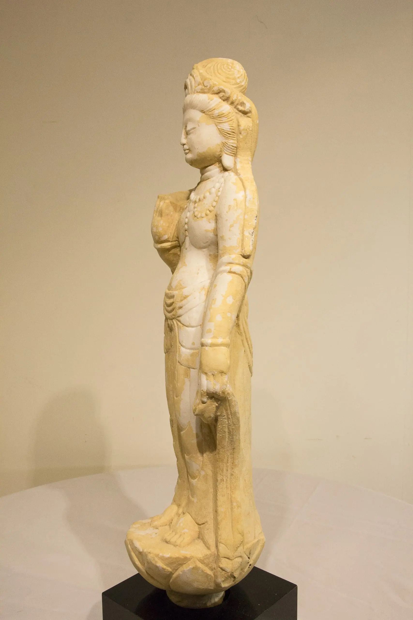 | Description | Marble carving of a bodhisattva or Guan Yin, (Indian name Avalokiteśvara) with an elaborate crown and necklace, flowing robes, and standing on a lotus pedestal. |