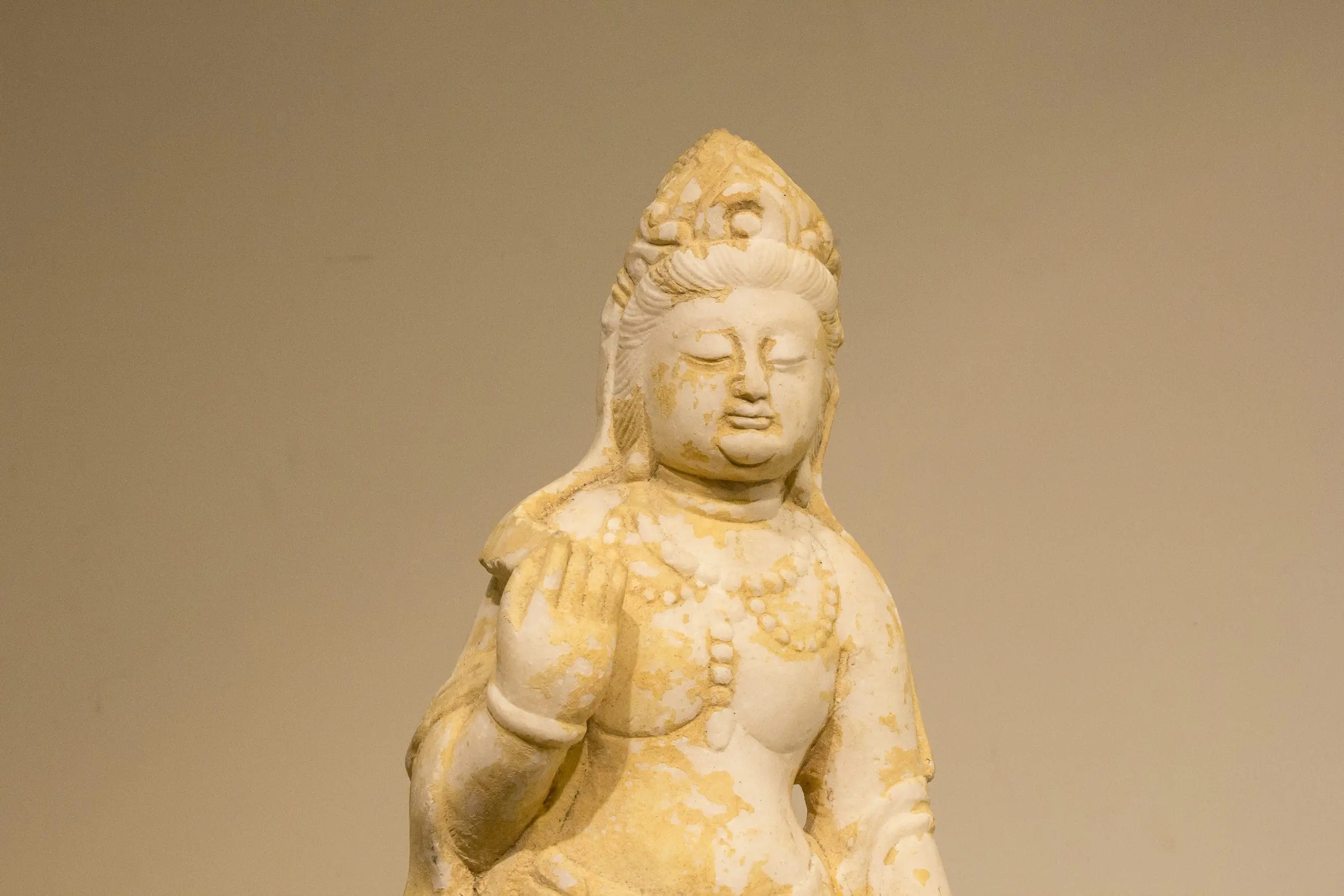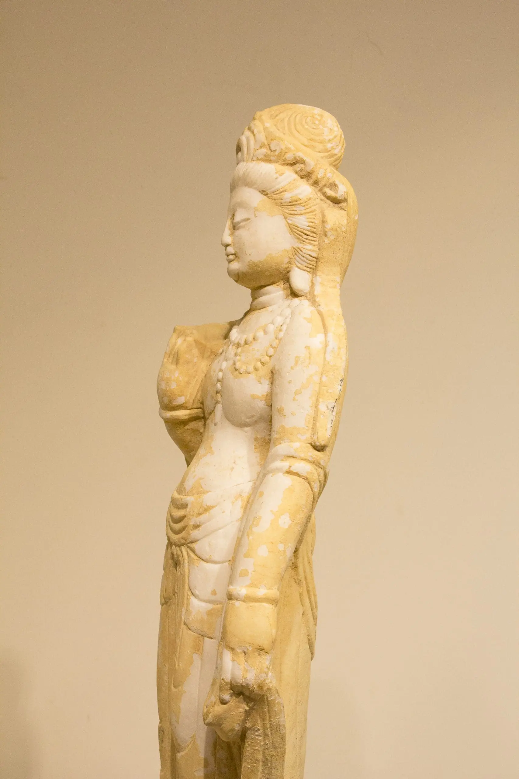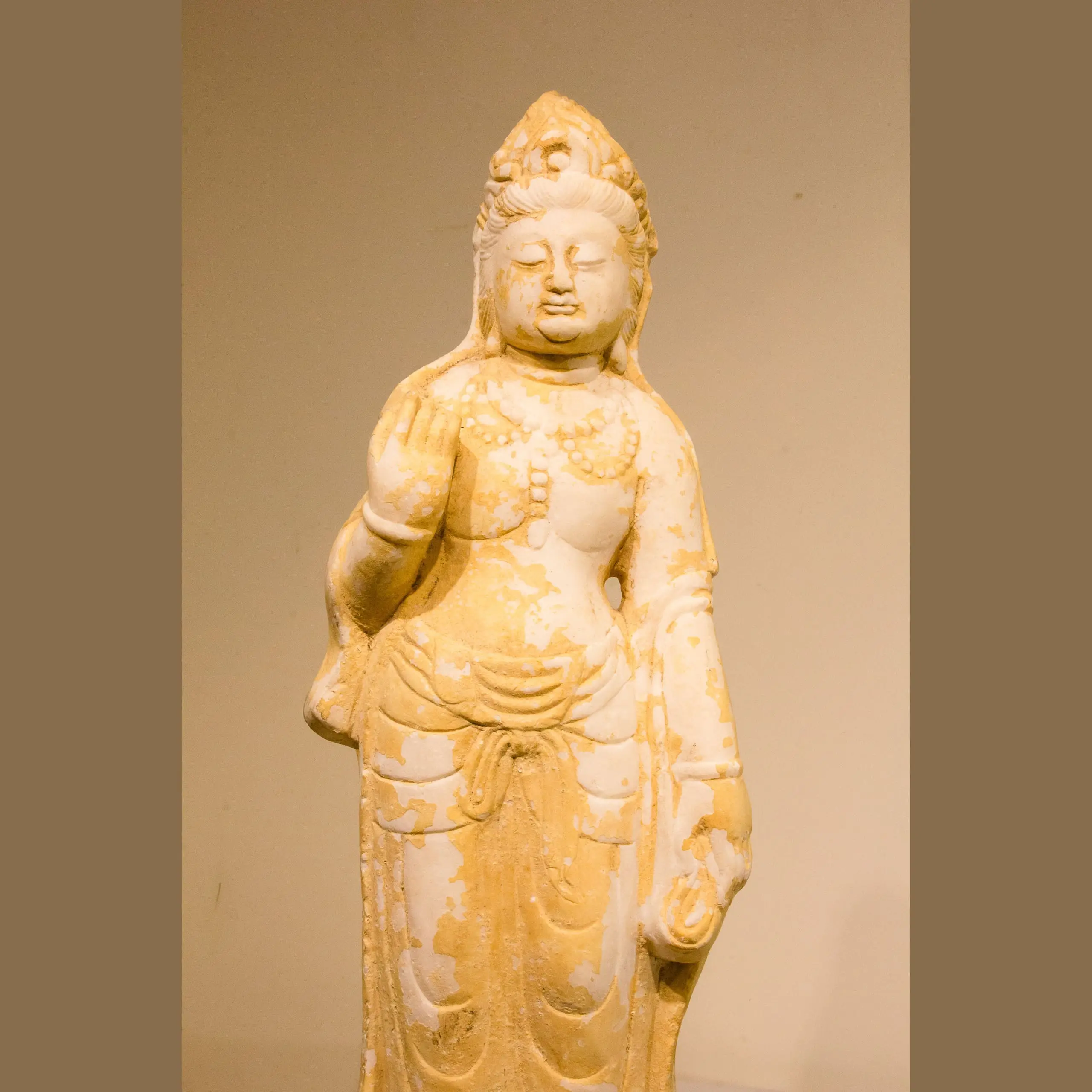 | Description | Marble carving of a bodhisattva or Guan Yin, (Indian name Avalokiteśvara) with an elaborate crown and necklace, flowing robes, and standing on a lotus pedestal. |