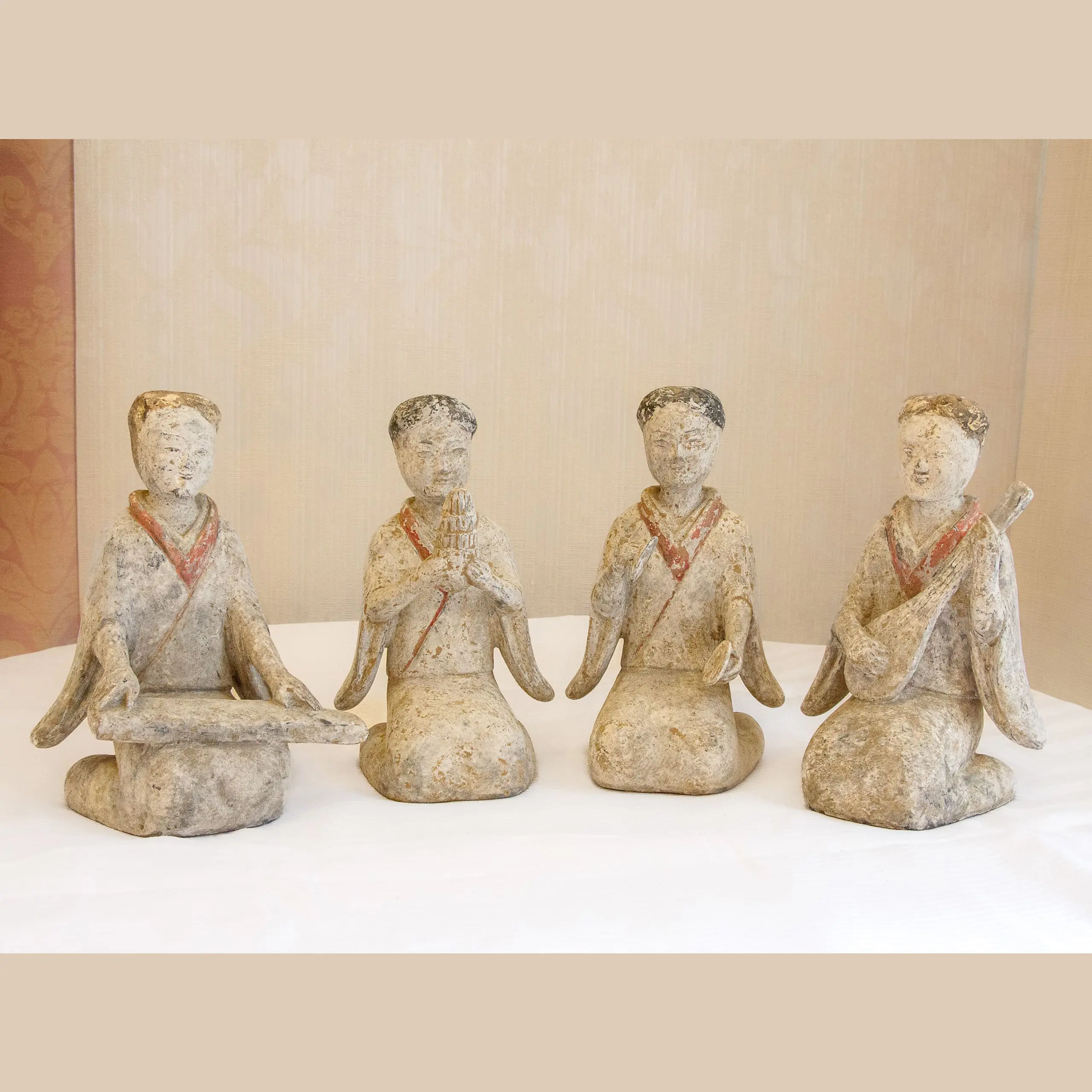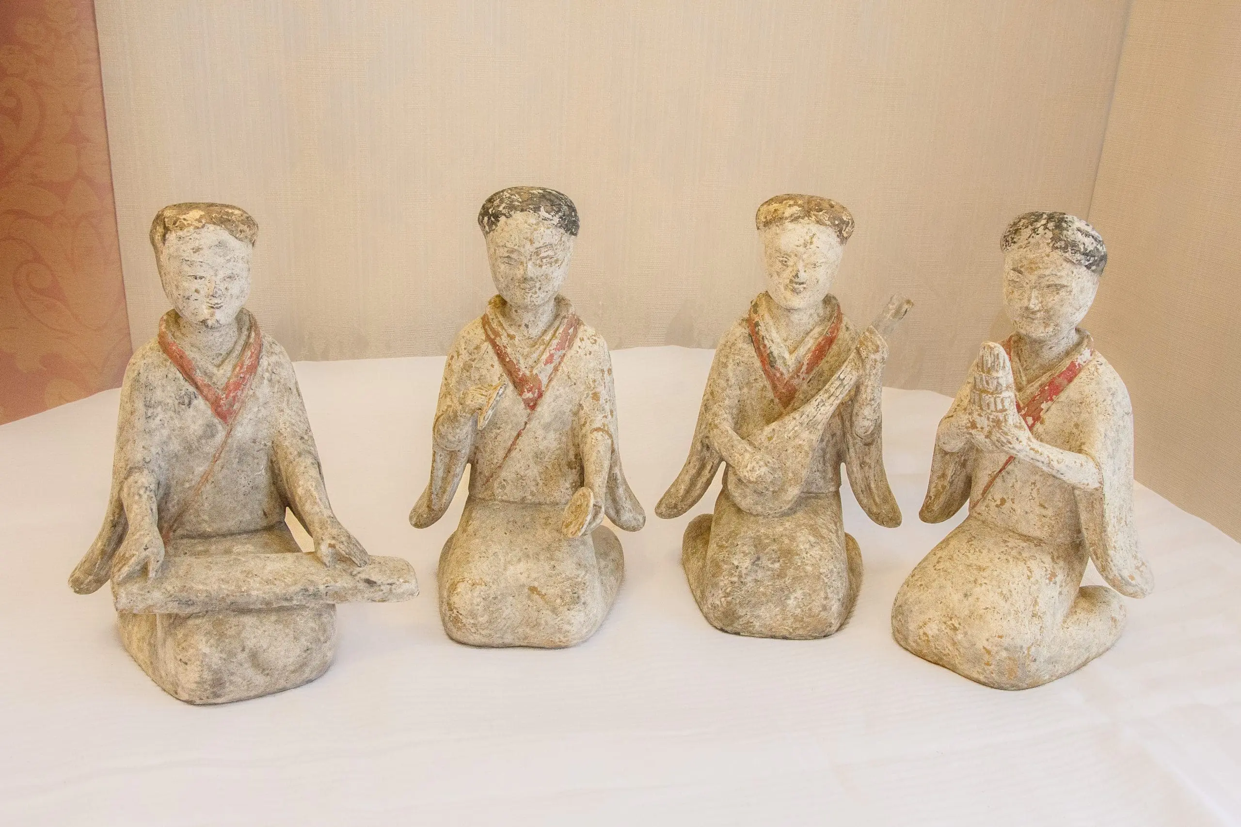 | Description | A Han dynasty (206 BCE–220 CE) pottery ensemble of four kneeling musicians, each modeled with expressive restraint. The figures play, from left to right, a se zither, panpipes (paixiao), hand clappers, and an early pipa lute, symbolizing courtly music and afterlife harmony. |