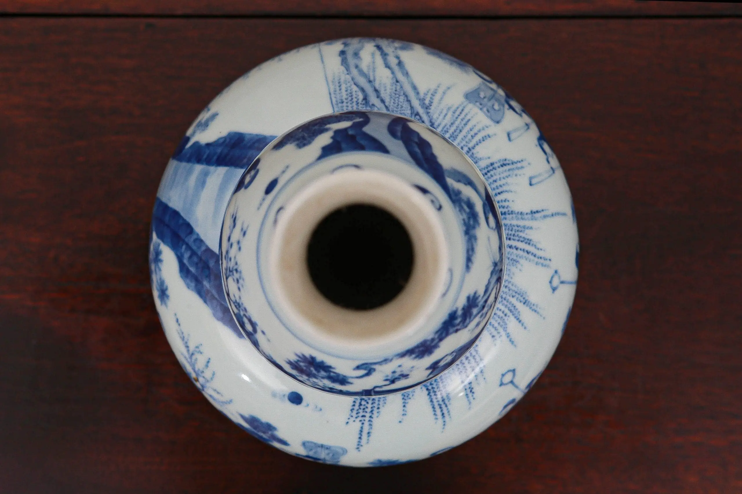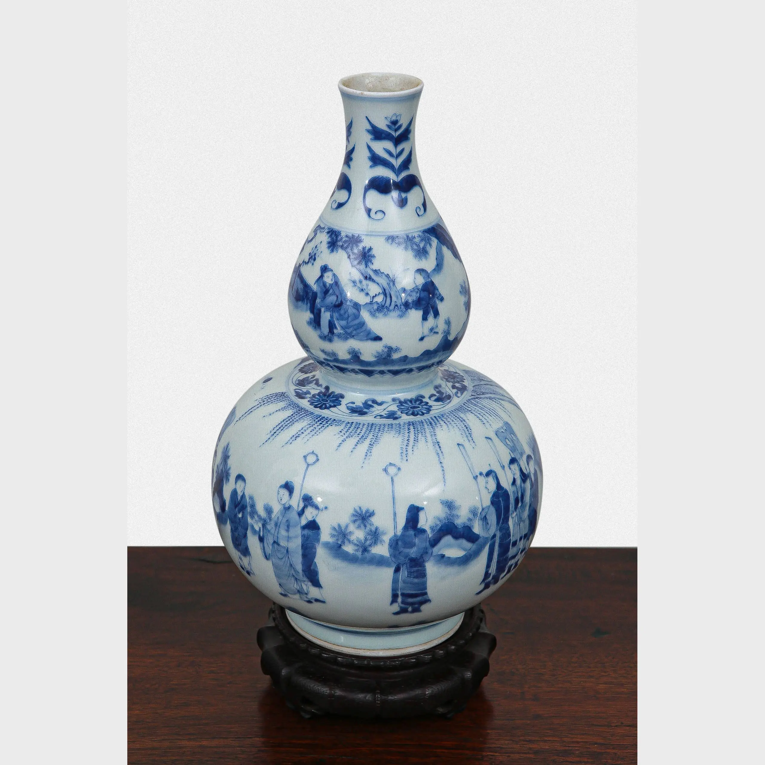 | Description | This double-gourd blue and white vase, produced during the Kangxi period (six character Kangxi mark) for the Japanese market, is finely painted with figures in procession beneath radiant motifs. The upper bulb depicts scholars in a landscape, while the lower registers show celebratory attendants. |