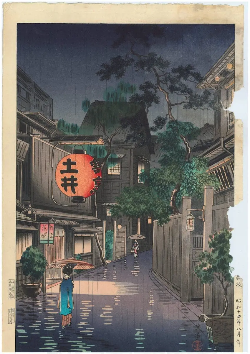 Atmospheric shin-hanga night scene by Kawase Hasui (1883–1957) depicting a rain-washed street beneath a glowing red lantern. Published in 1939 by Doi, the print captures luminous reflections, soft shadows, and traditional architecture, exemplifying Hasui’s mastery of poetic urban nightscapes.