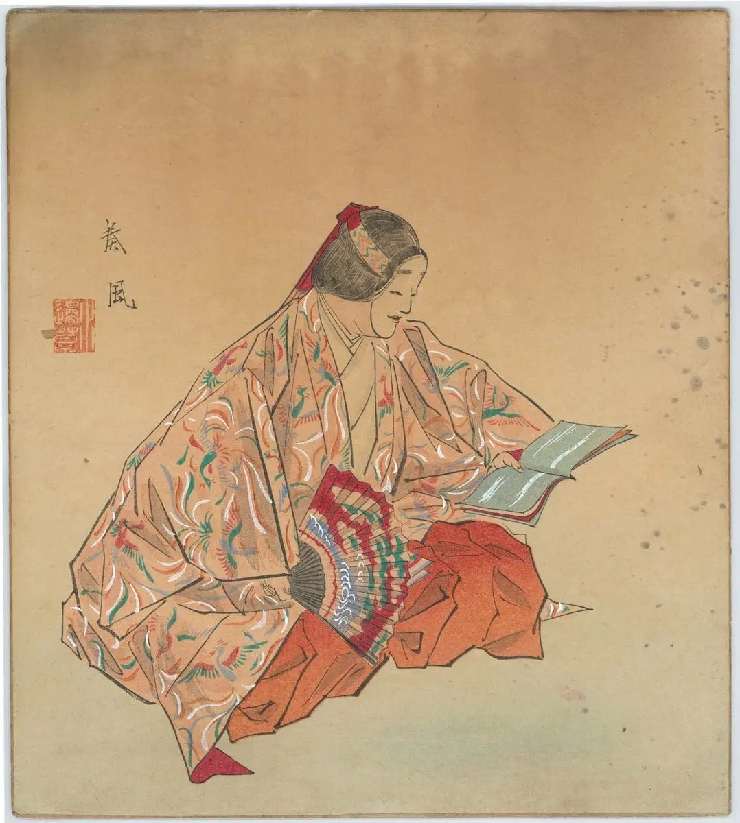 Graceful Edo-period ukiyo-e of a seated woman quietly reading, attributed to the artist, Shunpū. Rendered with delicate linework and softly patterned robes, the composition emphasizes refinement, literacy, and calm introspection. A subtle bijin-ga genre scene, early to mid-20th century, showing age toning and intact seals.