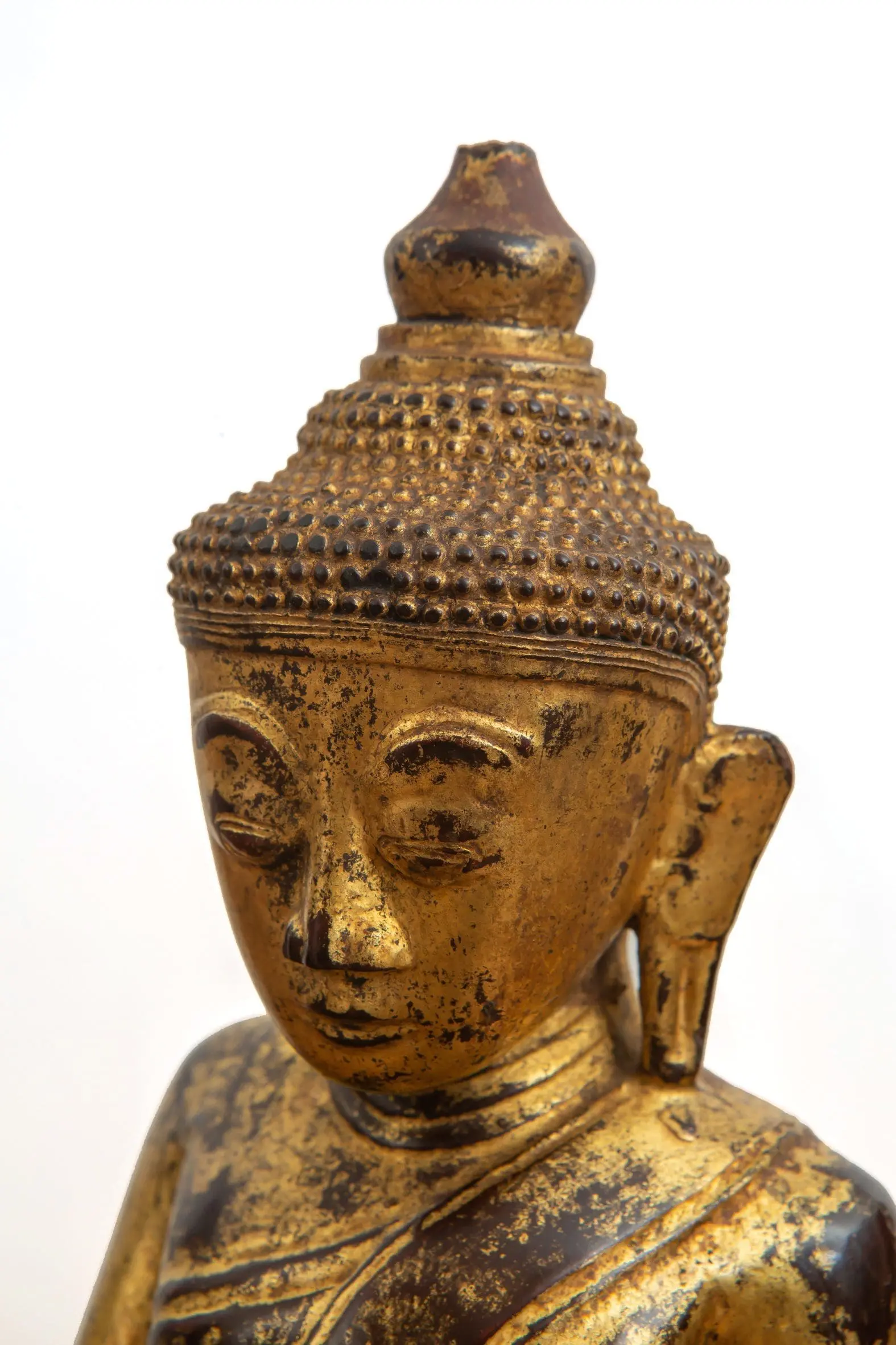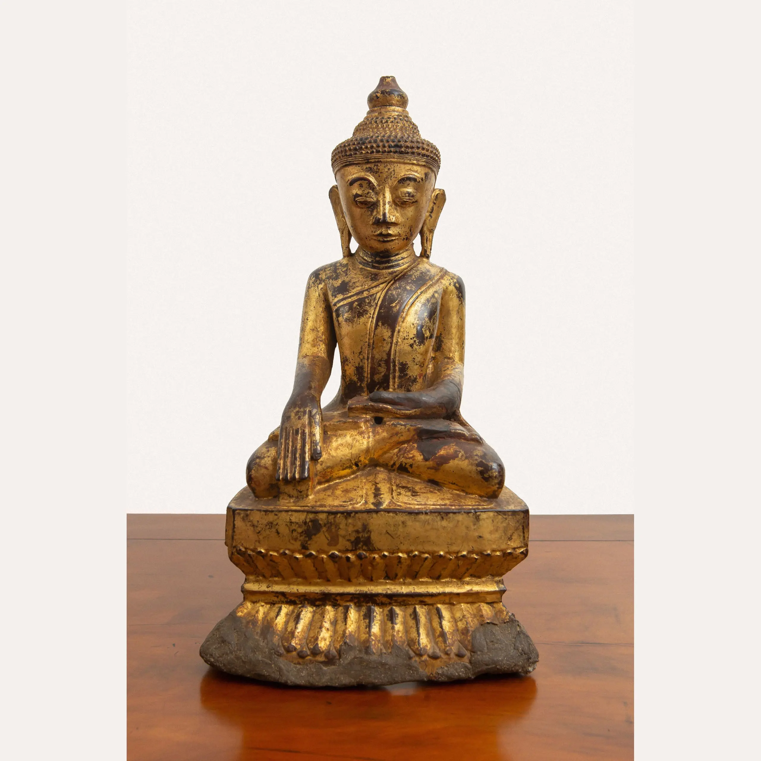 | Description | Buddha seated on an elaborate lotus throne, his hands in a Subduing Mara Mudra, also known as the "conquering evil " mudra, the "calling he earth to witness" mudra, or the "touch the earth" mudra. |