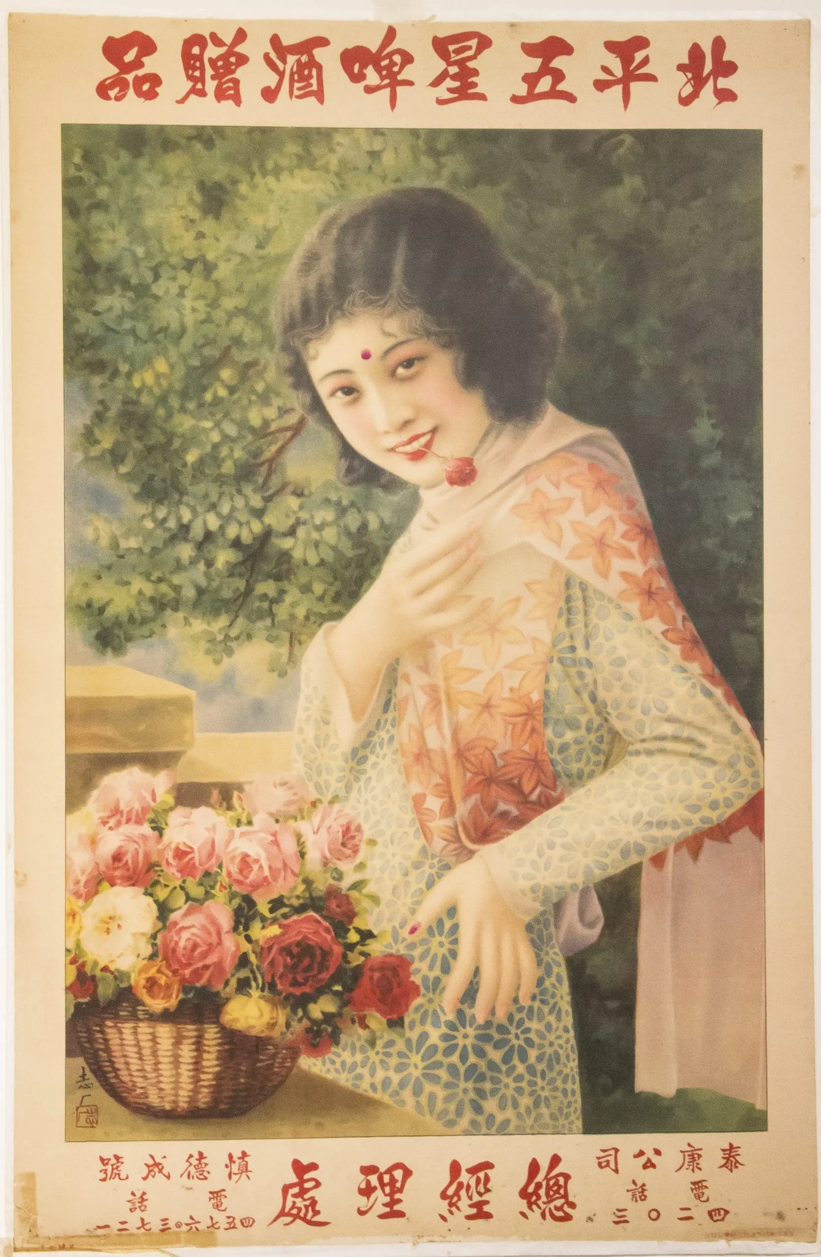 | Description | Large Republican-era beer advertising poster, circa 1930s, depicting a smiling modern girl holding a basket of roses and coyly biting a single bud. Set against lush greenery, it promotes a northern “Five-Star” beer brand. Signed with an unidentified two-character artist’s signature and red seal at lower left. |