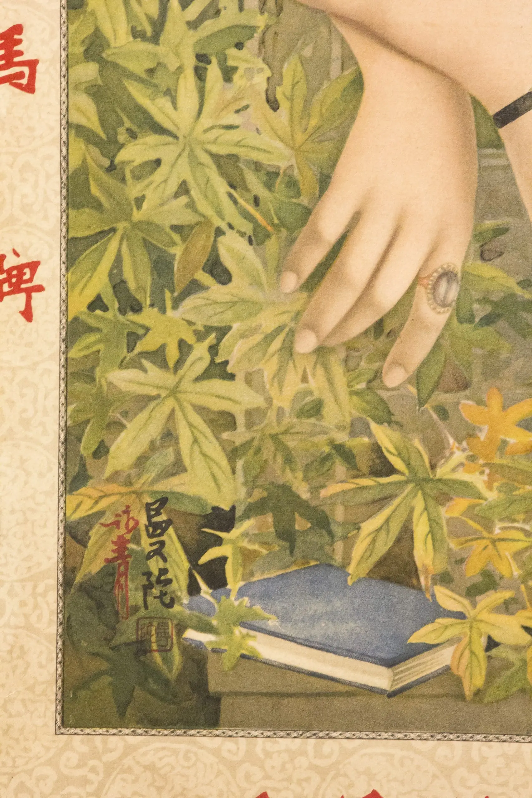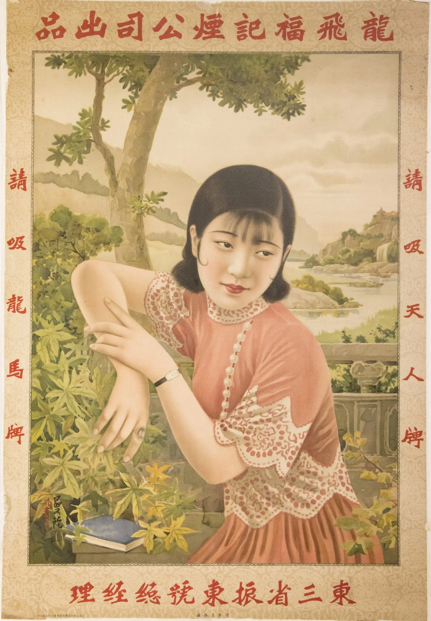 | Description | 1930s Shanghai cigarette advertisement featuring a modern qipao beauty leaning over a terrace amid lush foliage, with river landscape and hills beyond. Soft lithographic shading and delicate details evoke the “calendar girl” glamour aesthetic of Republican China. Signed in the lower left with two-character artist inscription and red seal. |