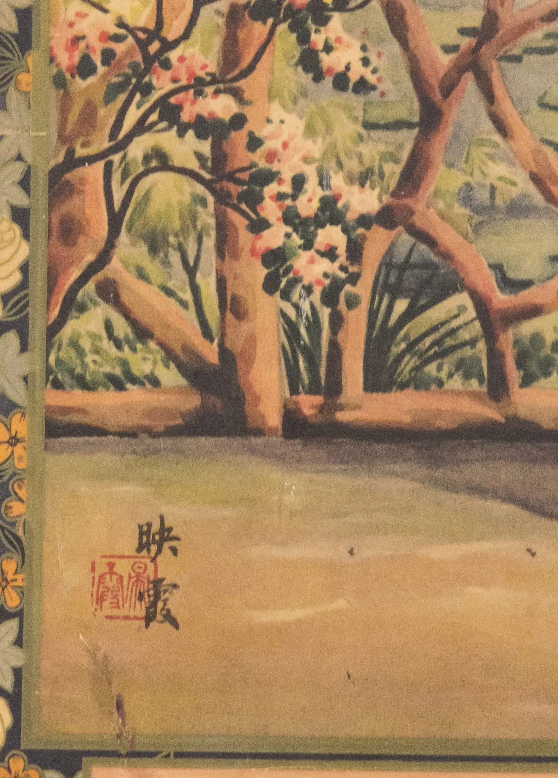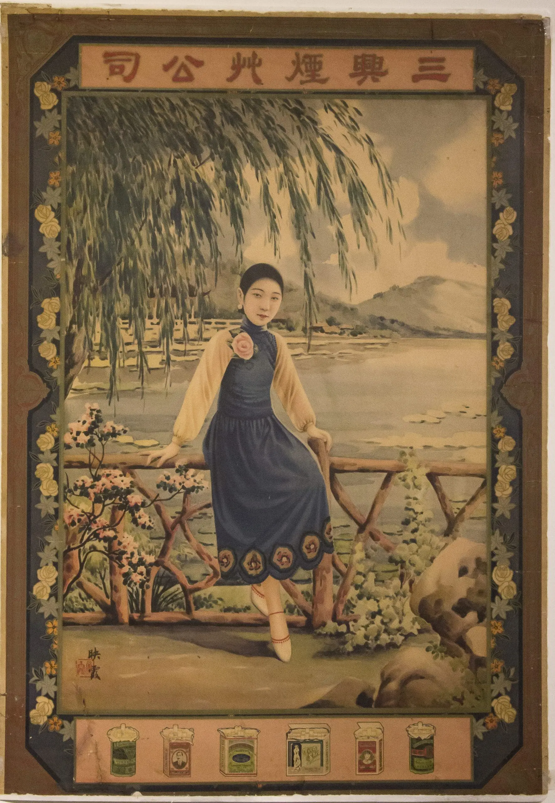 | Description | 1930s Shanghai cigarette advertisement featuring a young woman posed on a garden terrace with a willow-draped lakeside landscape behind her. Decorative floral borders frame the product panel below. Printed in soft glamour tones and signed with the character “Yun” (雲) and matching seal. |