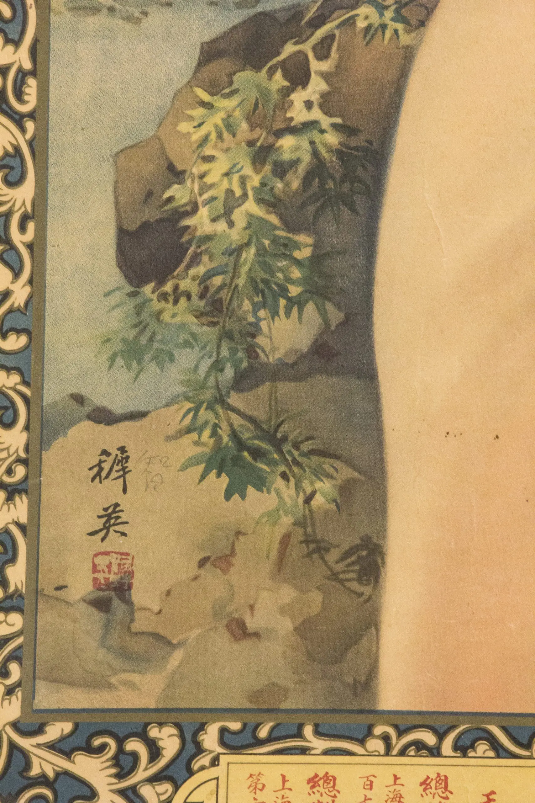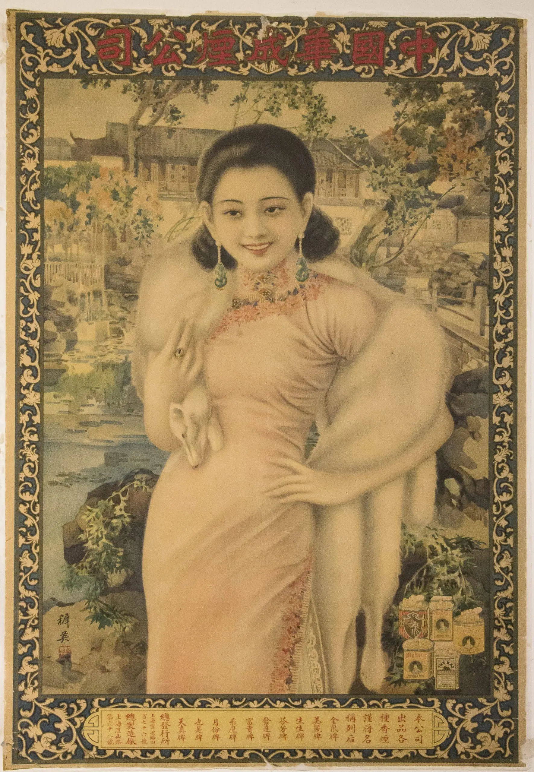 | Description | 1930s Shanghai cigarette advertising poster depicting a fashionable woman in qipao with fur stole against a scenic outdoor backdrop. Printed in a decorated border with brand promotion and product boxes. Signed “Hui Kui” with seal. |