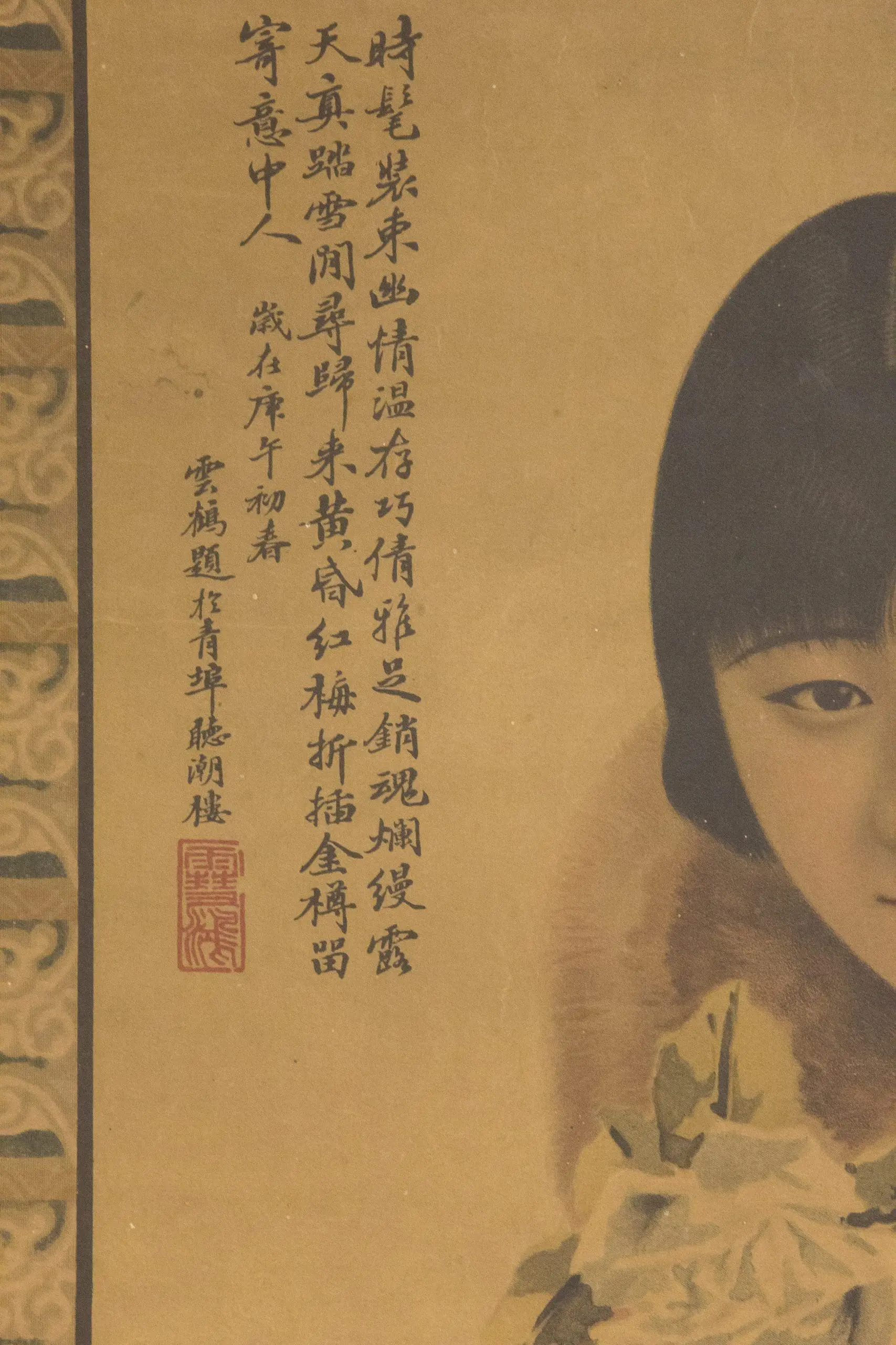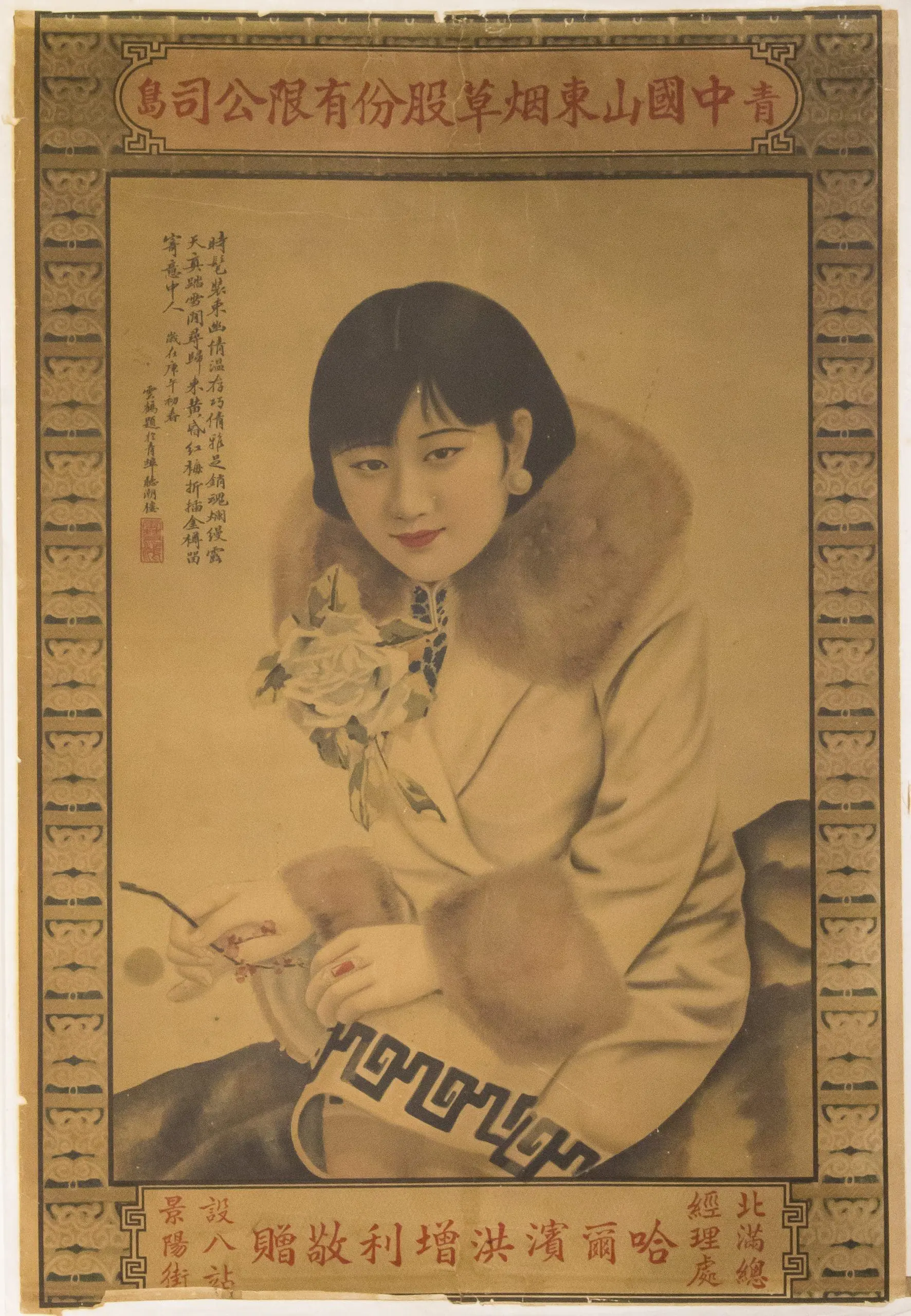 | Description | 1930s Shanghai cigarette advertising poster depicting a fashionable woman in qipao with fur collar holding a cigarette holder. Medium folio lithograph with decorative border, promotional text, and distributor information. Image toned with wear but intact. |