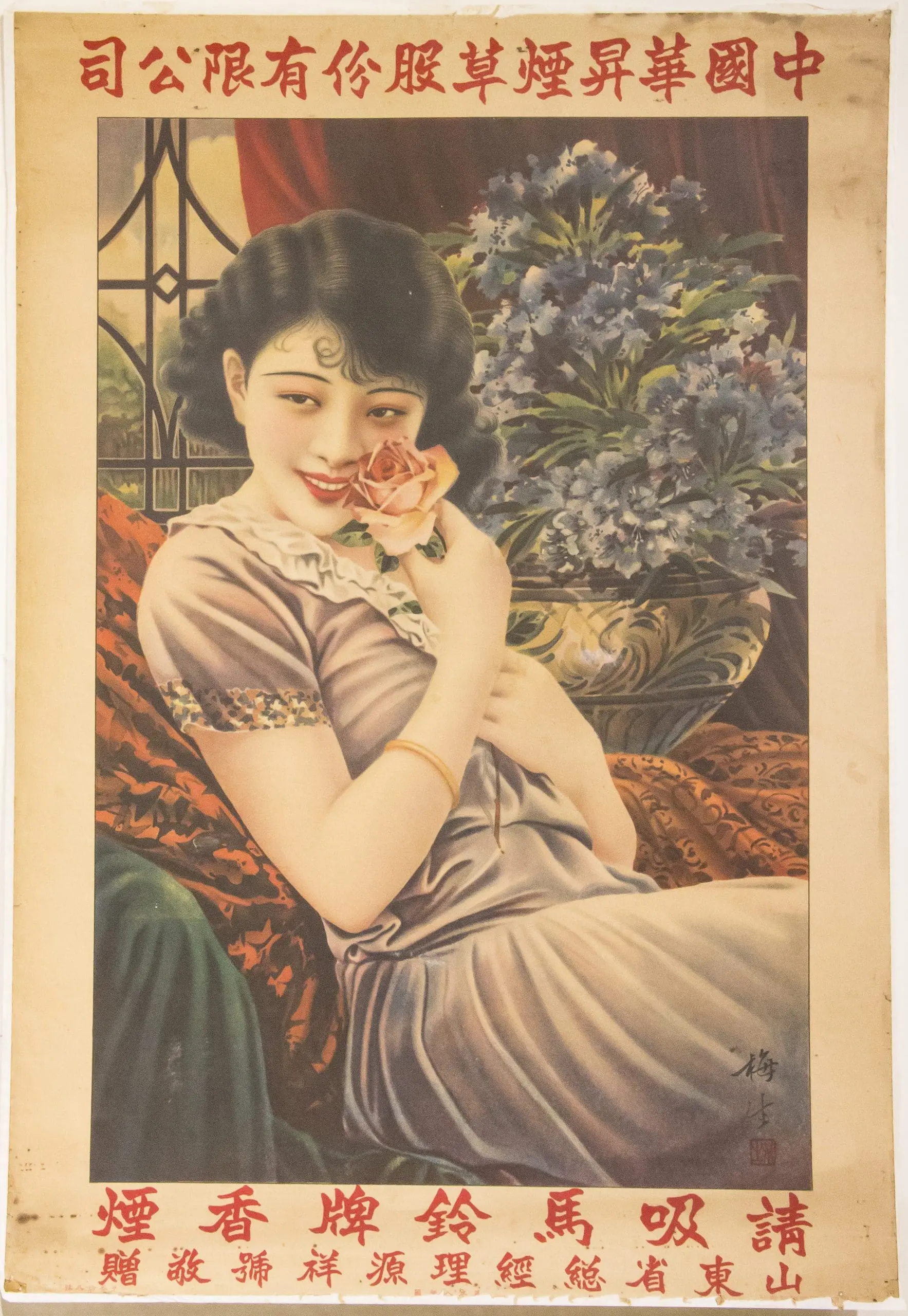 | Description | A refined 1930s Shanghai beauty advertisement by Mei Yutian, depicting a fashionable young woman coyly holding a rose amid lush florals and patterned textiles. |