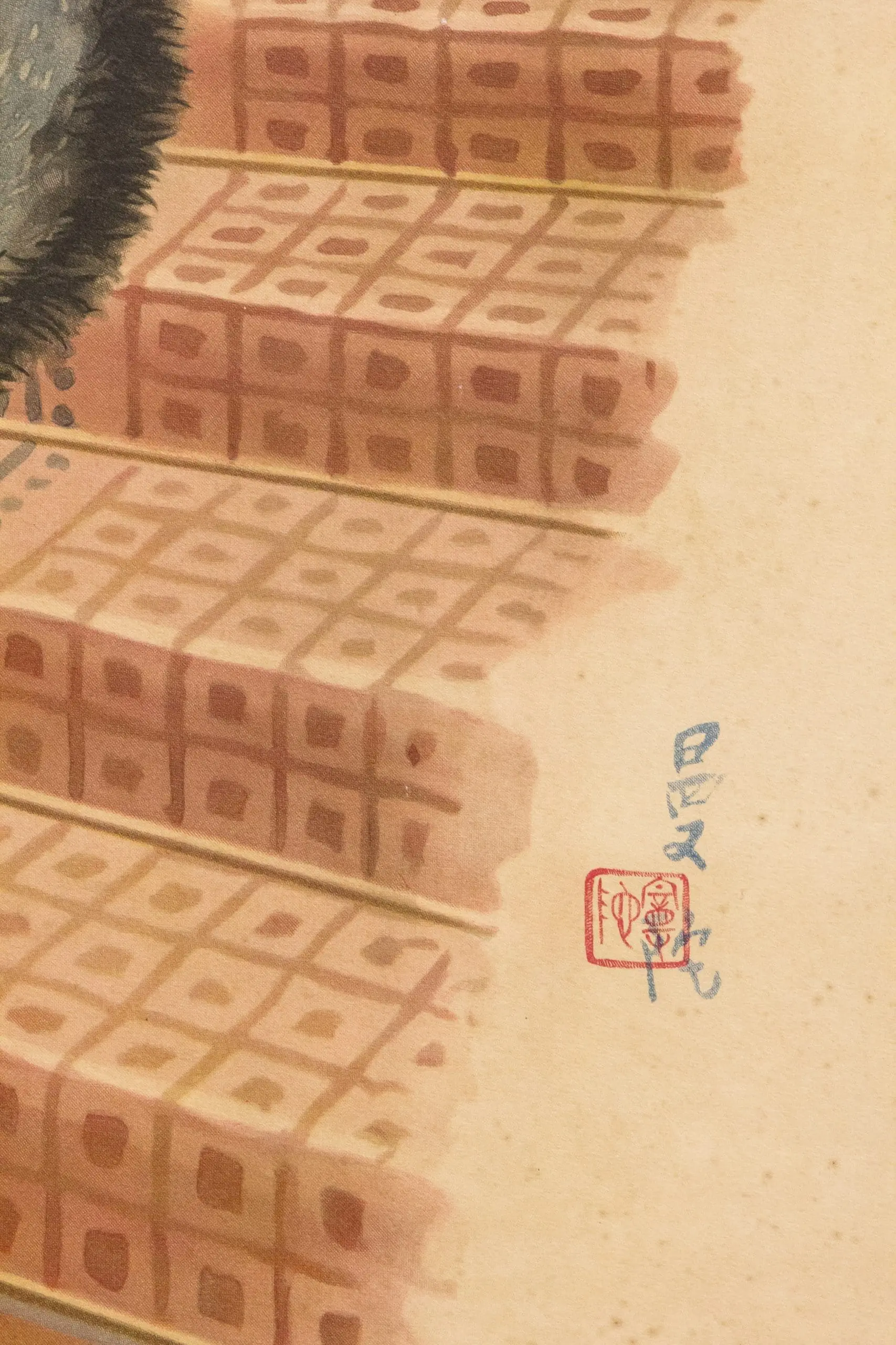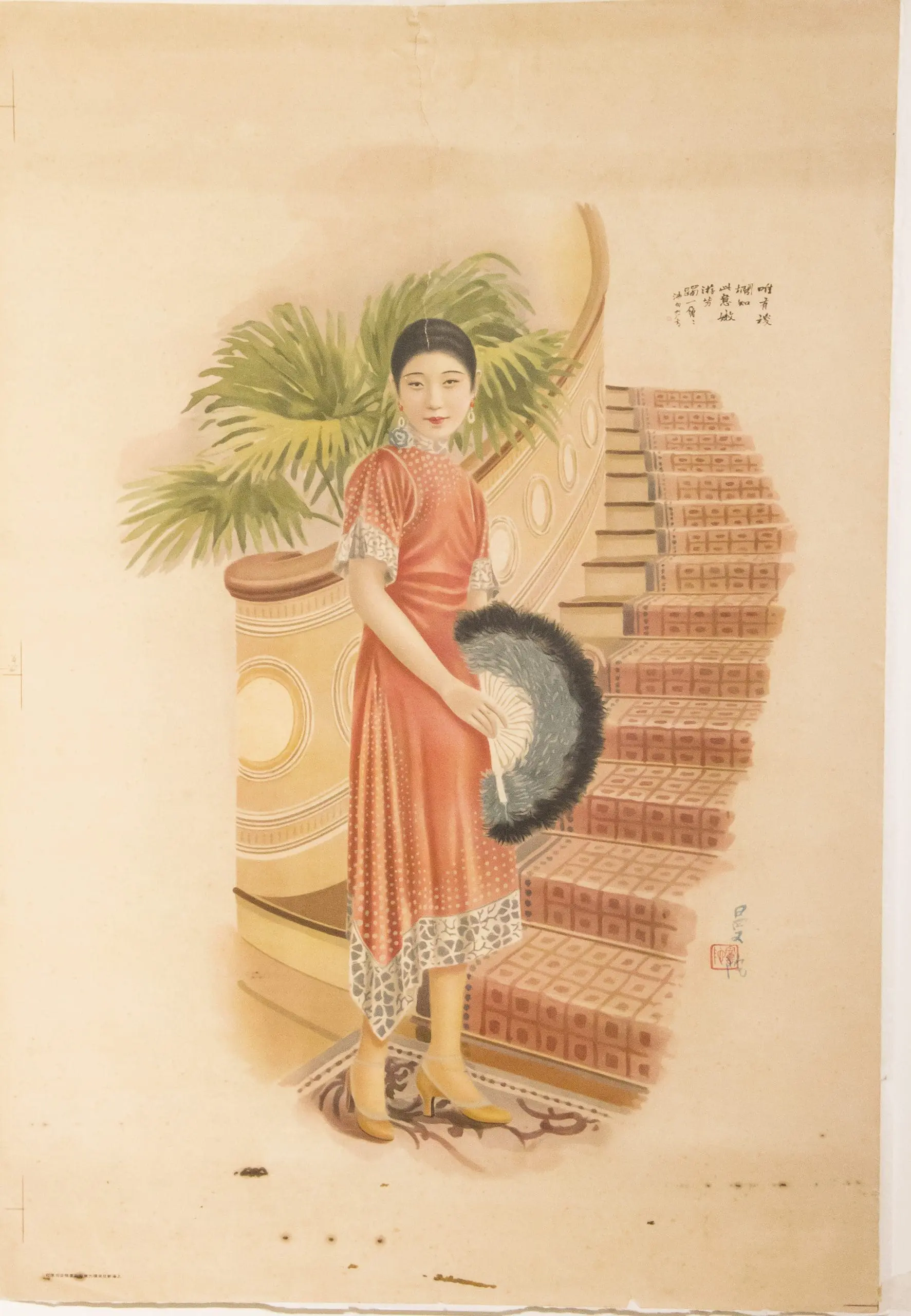 | Description | Elegant 1920s Shanghai calendar-style advertising poster depicting a fashionable woman in a red qipao before an Art Deco staircase, rendered in soft lithographic tones. At lower right appears a small red square artist’s seal (朱文方印), a traditional studio signature mark indicating the designer or workshop rather than the commercial printer. |