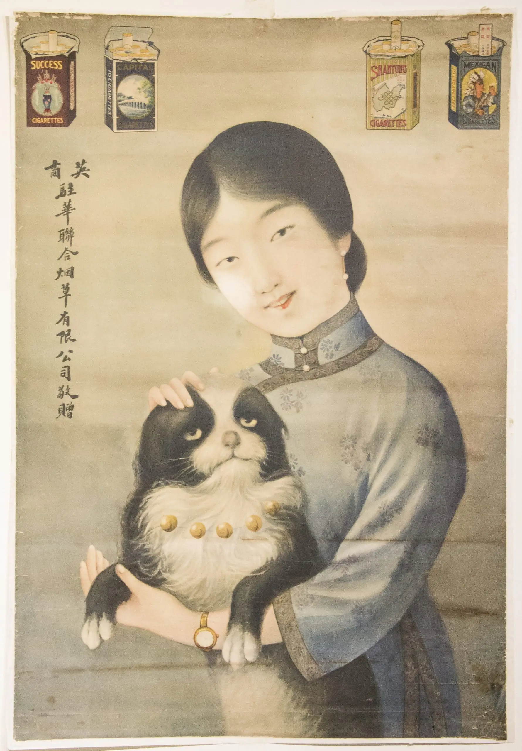 | Description | An early 1930s cigarette advertisement featuring a graceful woman in a modest qipao holding a pampered Pekingese. |