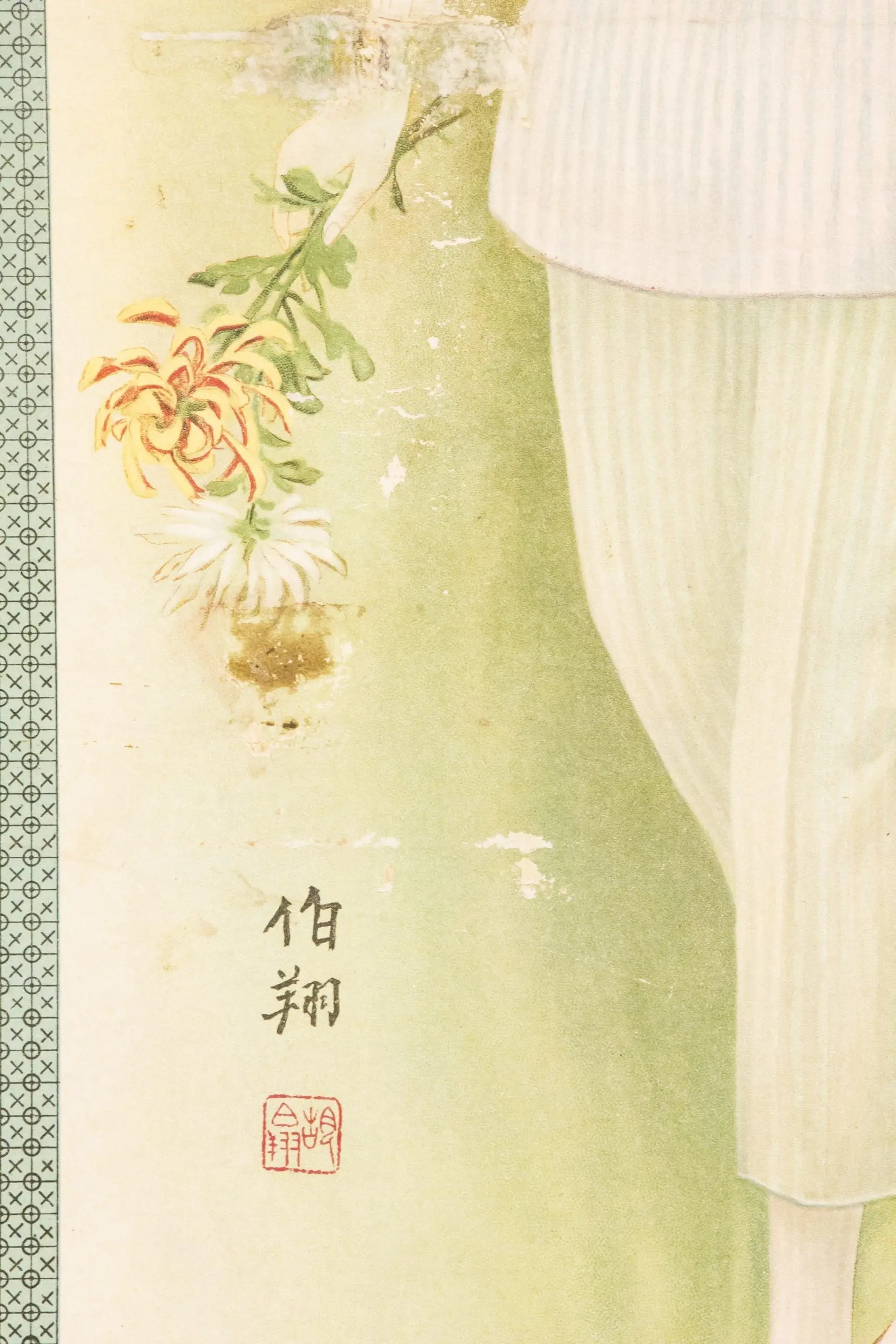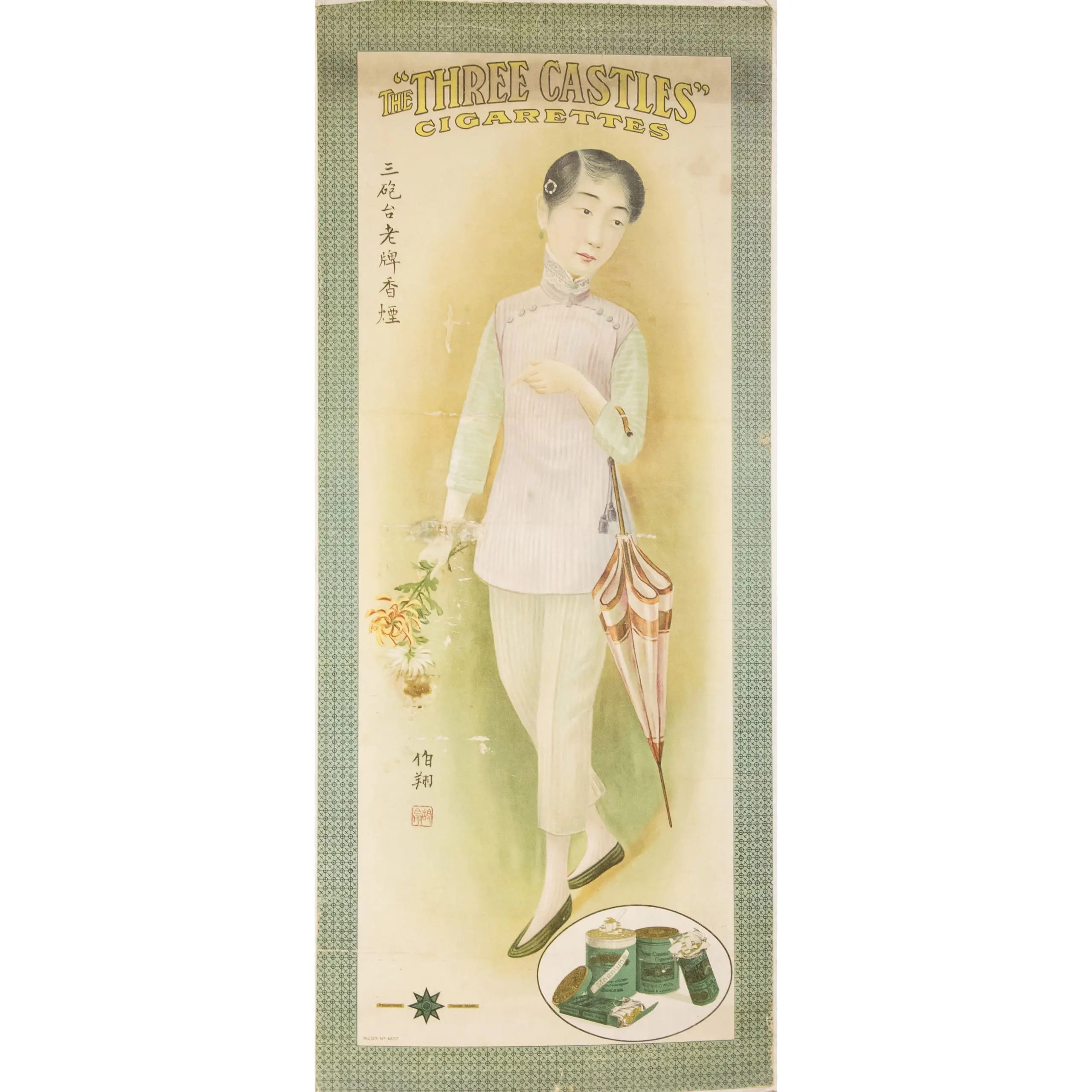 | Description | A refined 1930–33 “Three Castles” cigarette advertisement by Boxiang depicting a poised modern woman holding chrysanthemums and a parasol. |
