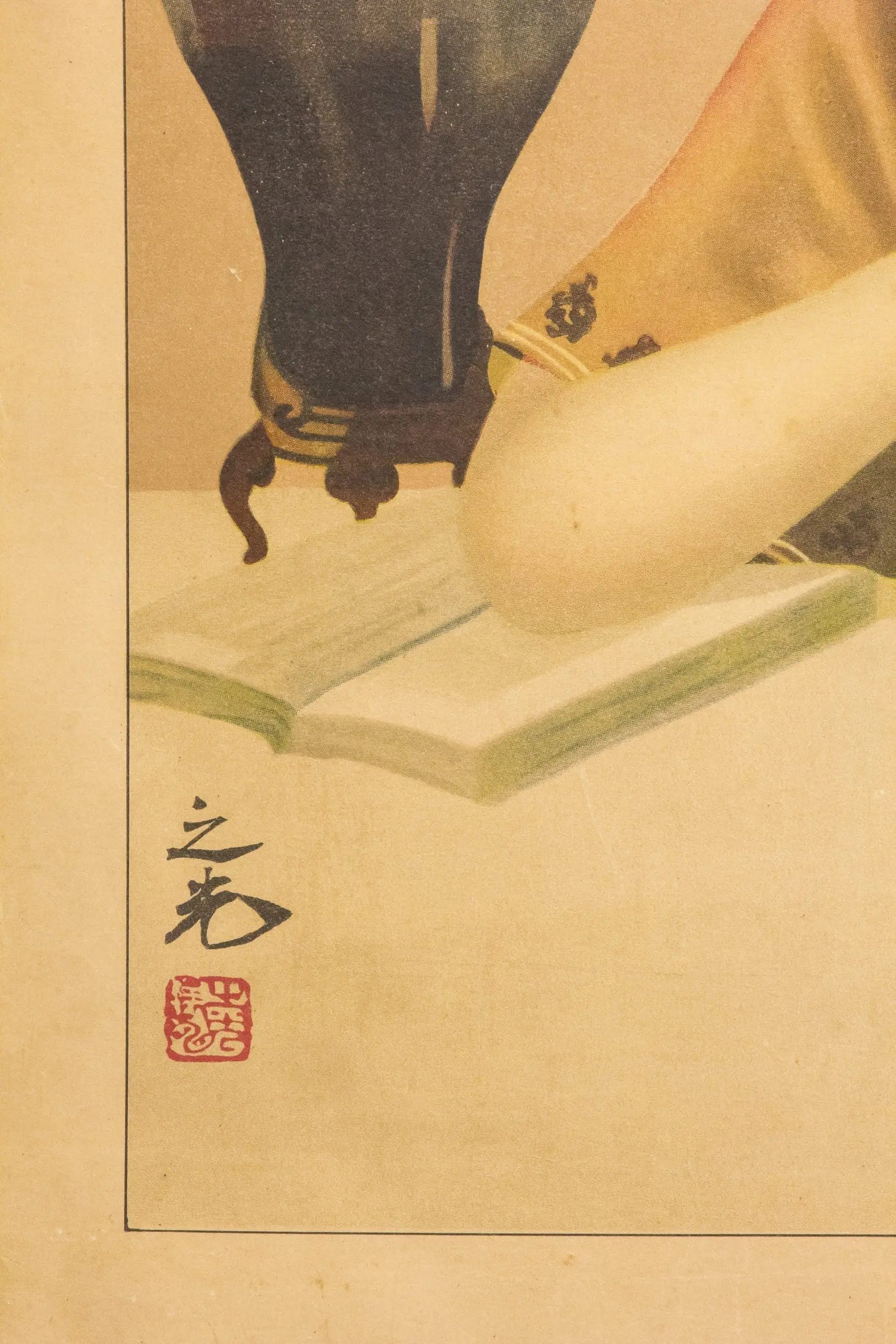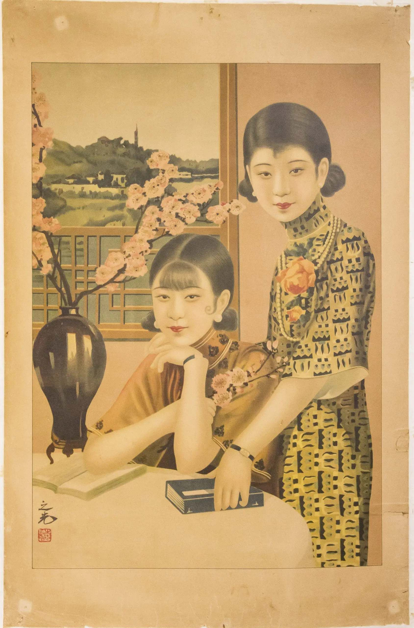 | Description | Li Nong’s refined 1930s cigarette poster portrays two modern Shanghai girls in elegant qipao amid blossoms and books. |