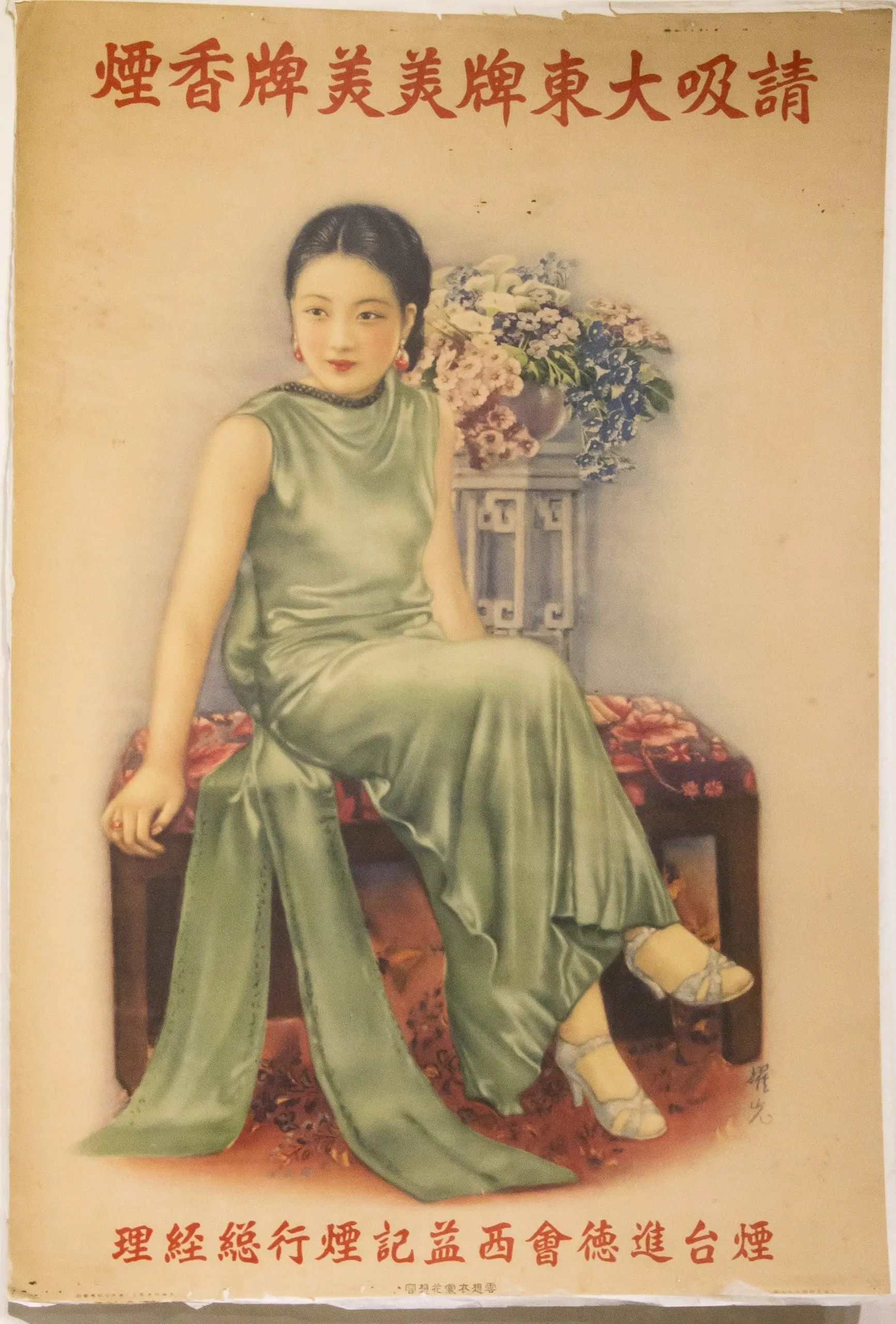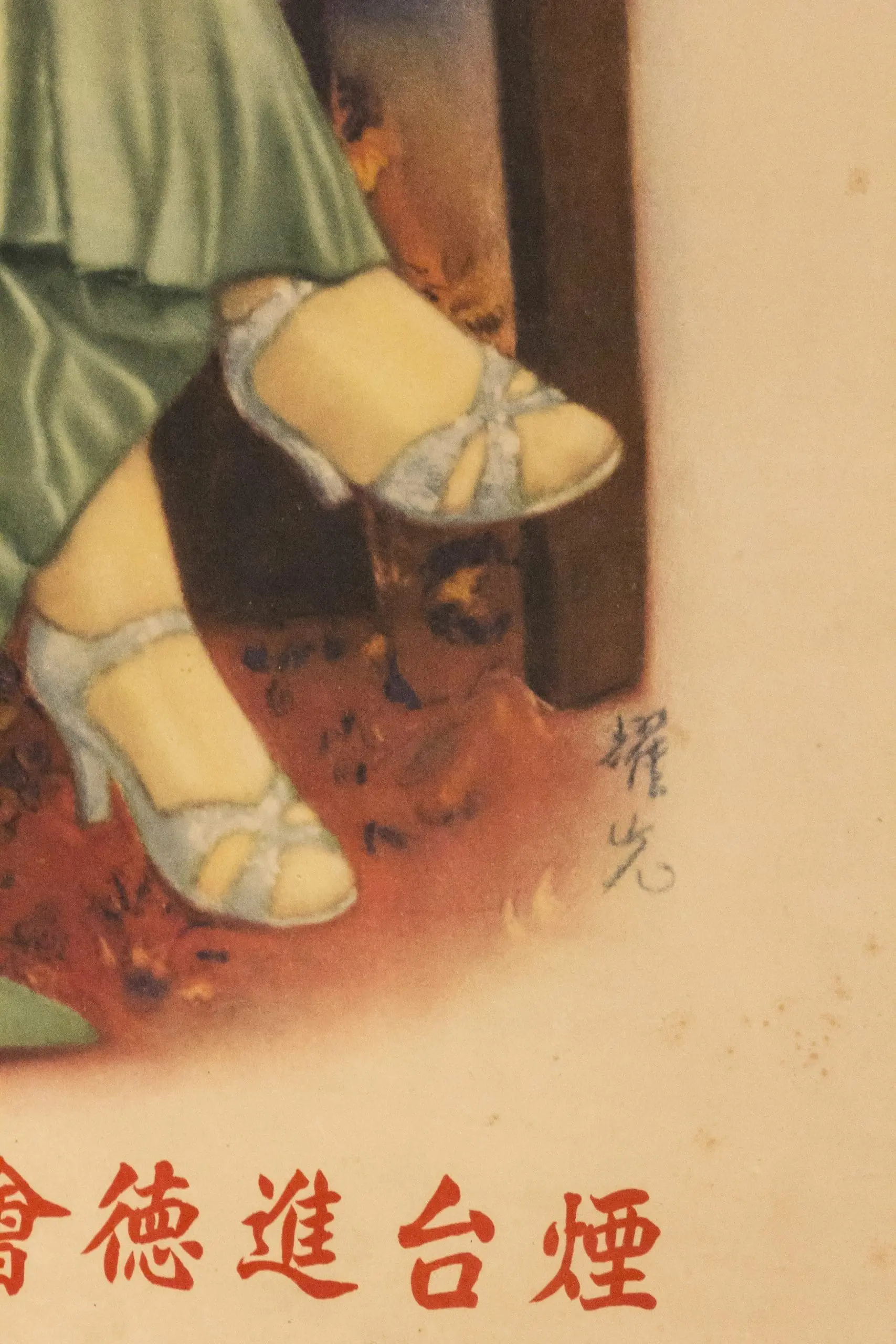 | Description | A glamorous 1930s cigarette advertisement by Yao Guang portraying a poised modern beauty in a flowing green silk gown. Soft lithographic tones, fashionable heels, and floral décor convey Shanghai elegance. |