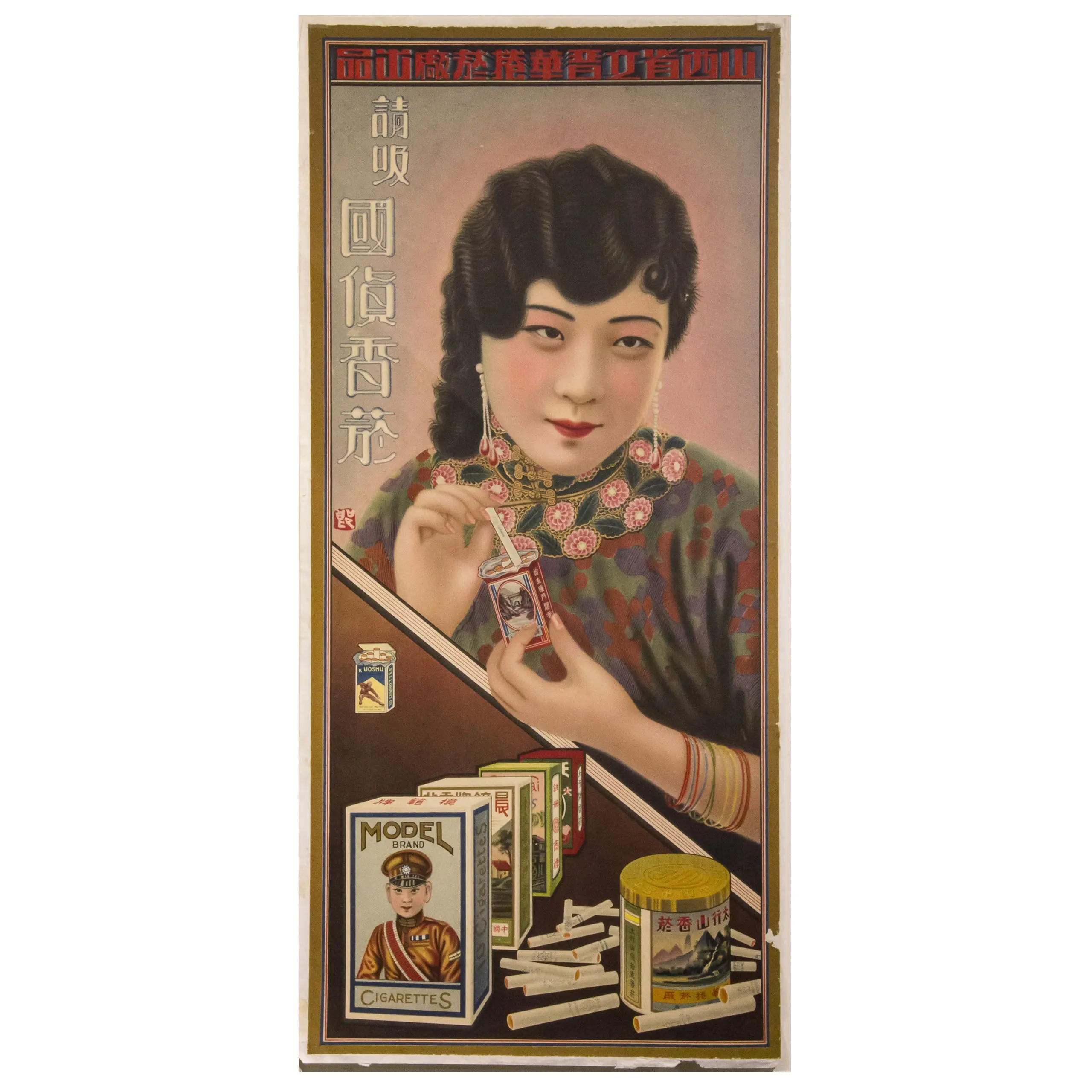 | Description | Tall, narrow Shanghai yuefenpai-style tobacco advertisement showing a fashionable woman in a patterned qipao poised with a cigarette. Soft airbrushed complexion, Art Deco framing, and bold vertical Chinese copy promote Model Brand cigarettes. Packs, tin, and loose sticks are staged at the bottom to emphasize product choice and modern urbanity. |