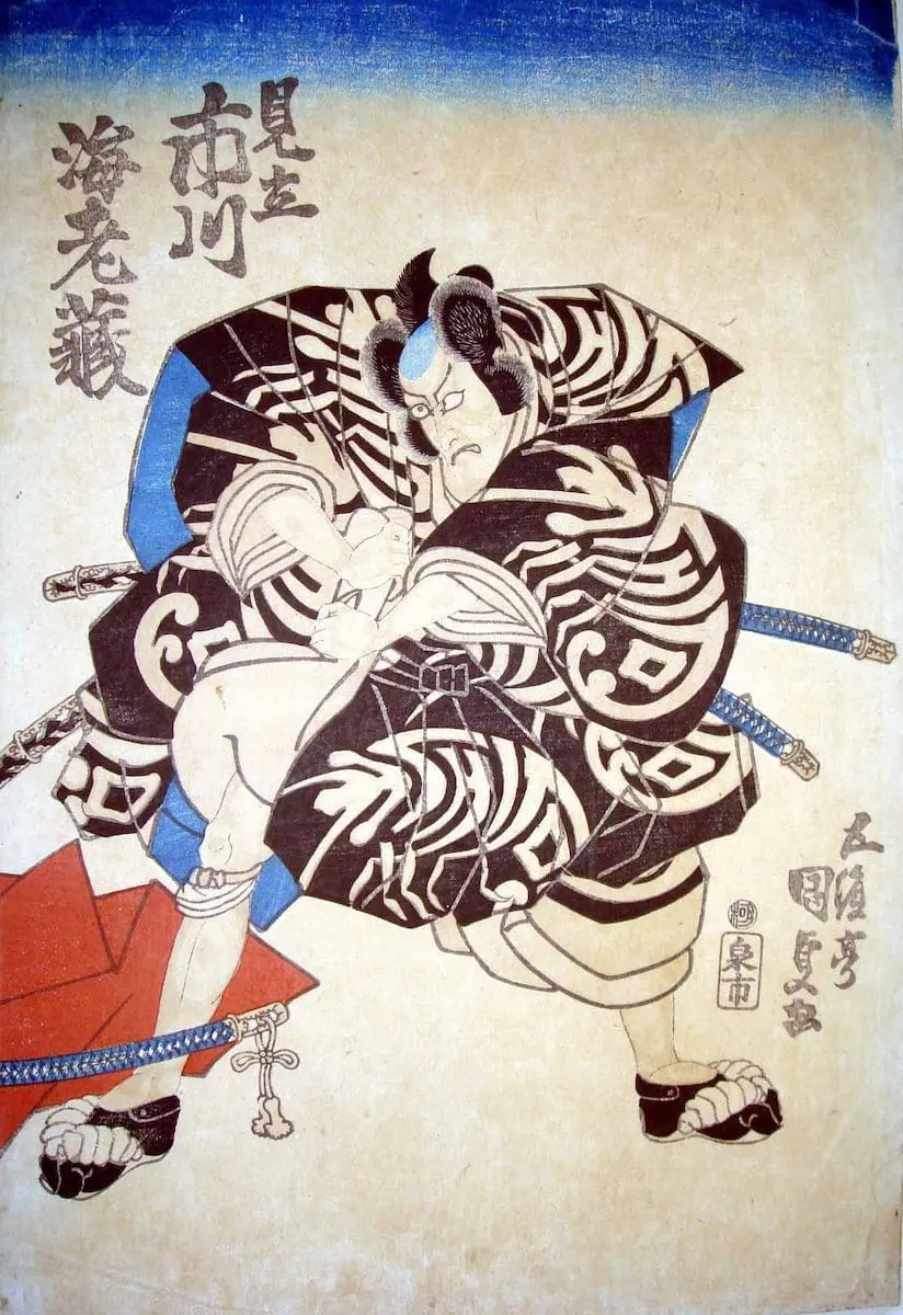 | Description | Authentic Japanese woodblock print or UKIYO-E entitled "Ferocious samurai in black and with white robe". Artist: Kunisada. Printer: Sen-Ichi |