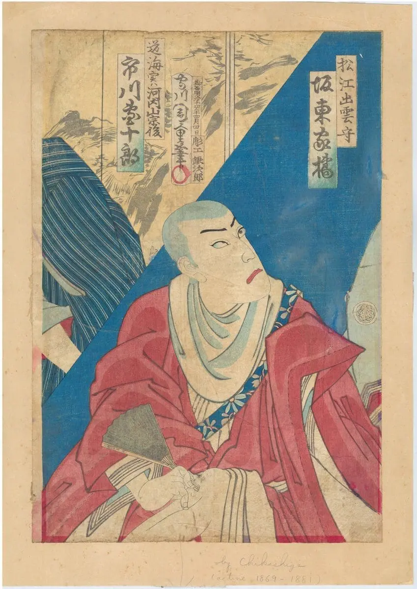 | Description | Authentic Japanese woodblock print or UKIYO-E entitled "Man holding fan and standing before draped blue fabric. Artist: Chikashige Morikawa. |
