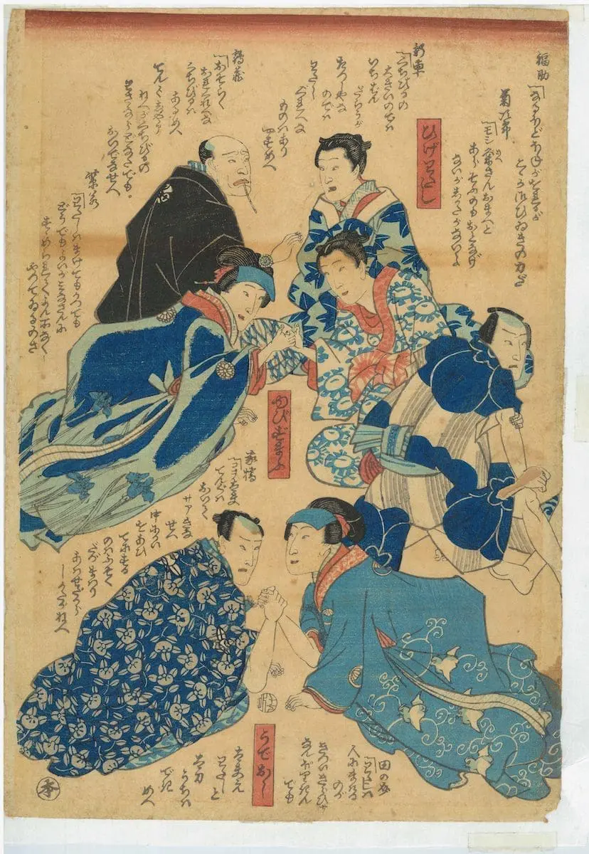 | Description | Authentic Japanese woodblock print or UKIYO-E. Grouping of samurai and geishas, calligraphy surrounding. Artist: Utagawa Kunisada (Toyokuni III). |