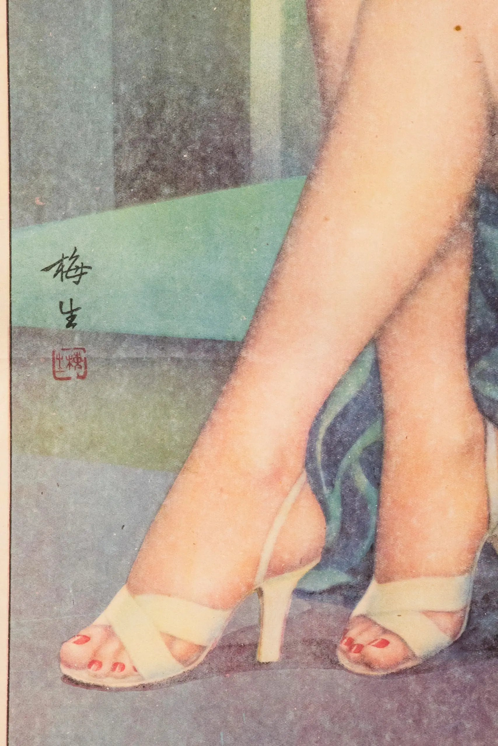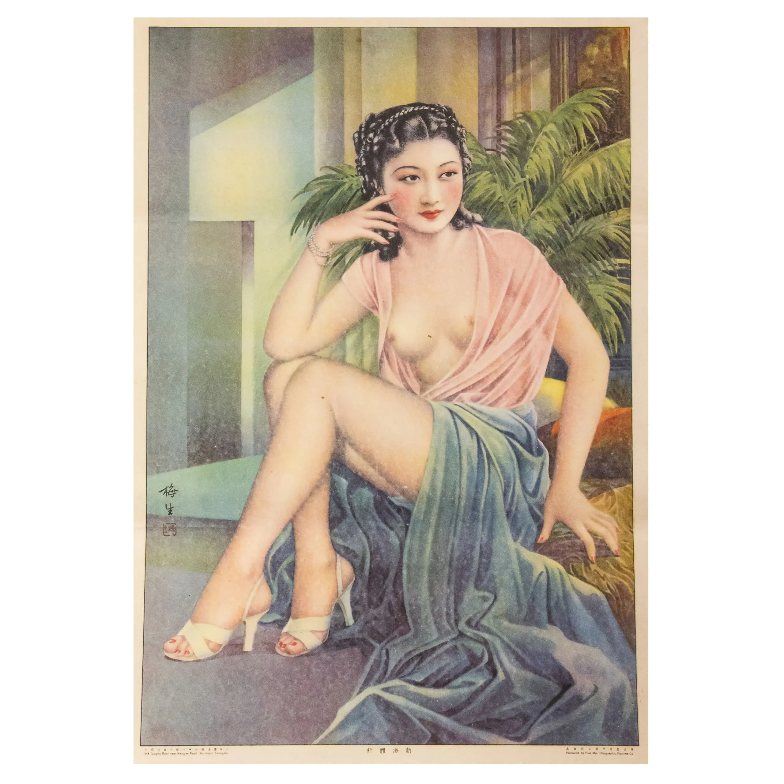 | Description | Shanghai semi-nude lithograph showing a seated modern woman in draped fabrics with exposed torso, printed in soft pastel tones against an interior setting with palms. Signed Mei-sheng with Shiji seal. Republican-period glamour subject aimed at urban commercial markets. Scarcer category within pre-war beauty calendars. |