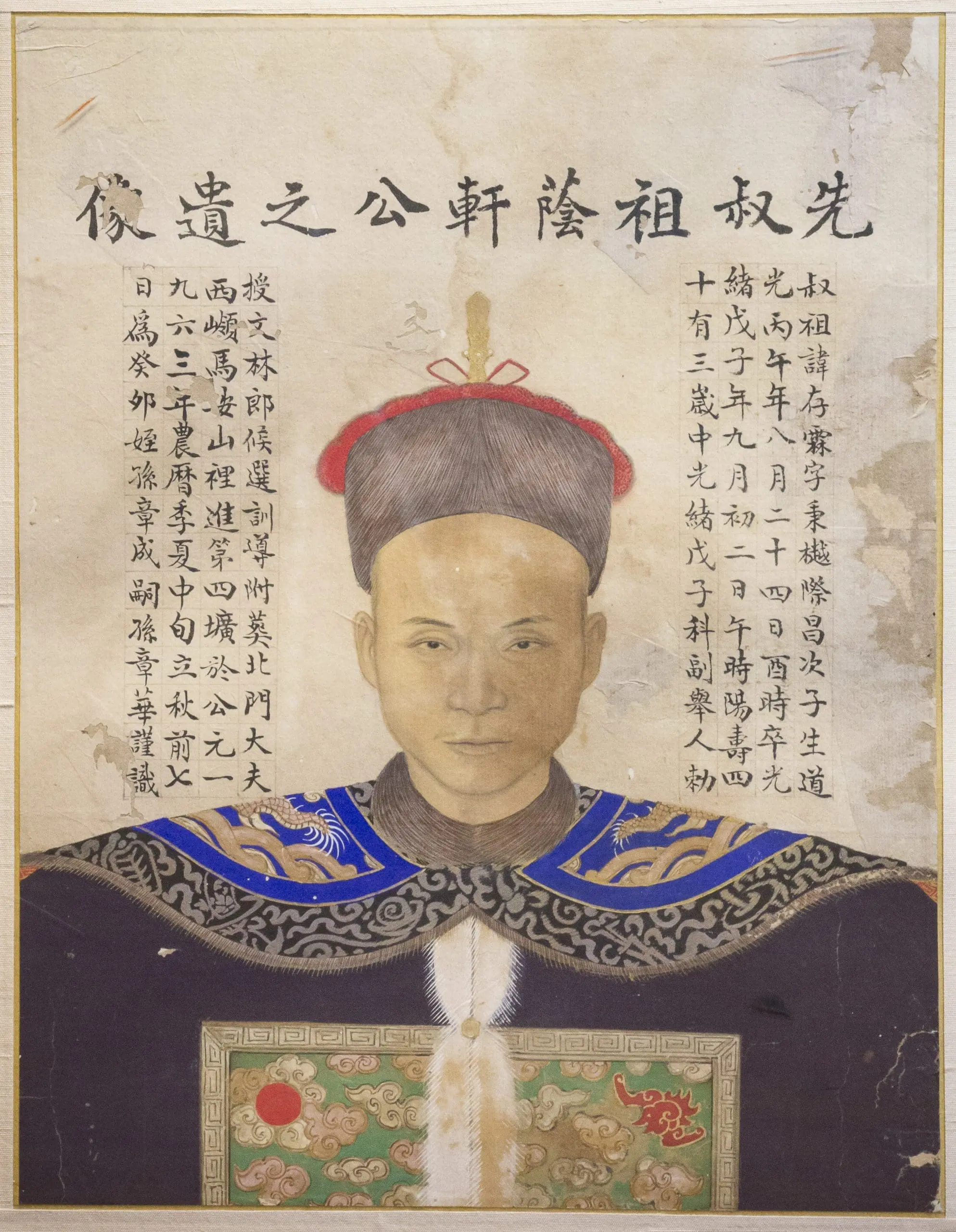 | Description | Qing-era portrait of a dignified official. His gold-plated hat, indicating 7th rank, and bird-embroidered badge signify his position. His black robe with blue embroidery and surrounding calligraphy detail his life and status, reflecting his respected role. |