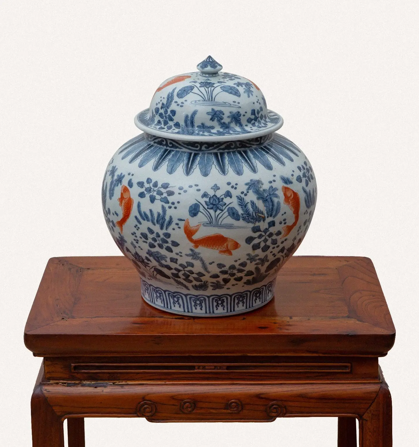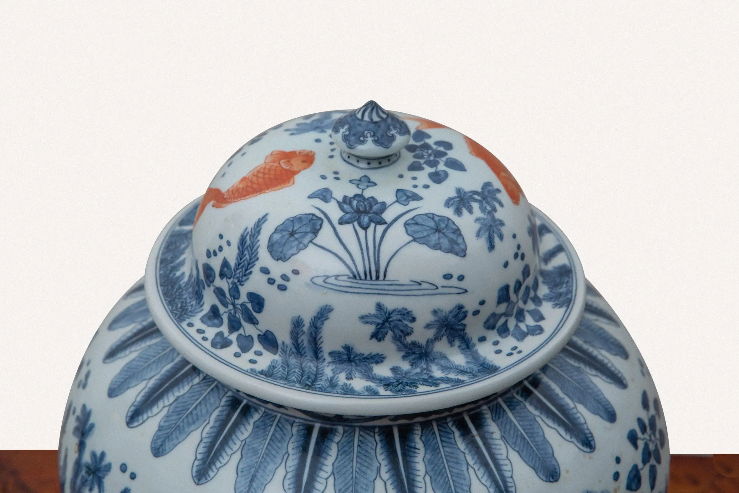 | Description | A large lidded jar with rounded shoulders, decorated in underglaze red and overglaze blue. The design features koi swimming among aquatic plants, symbolizing prosperity and perseverance. The domed lid echoes the motif with matching floral accents. |