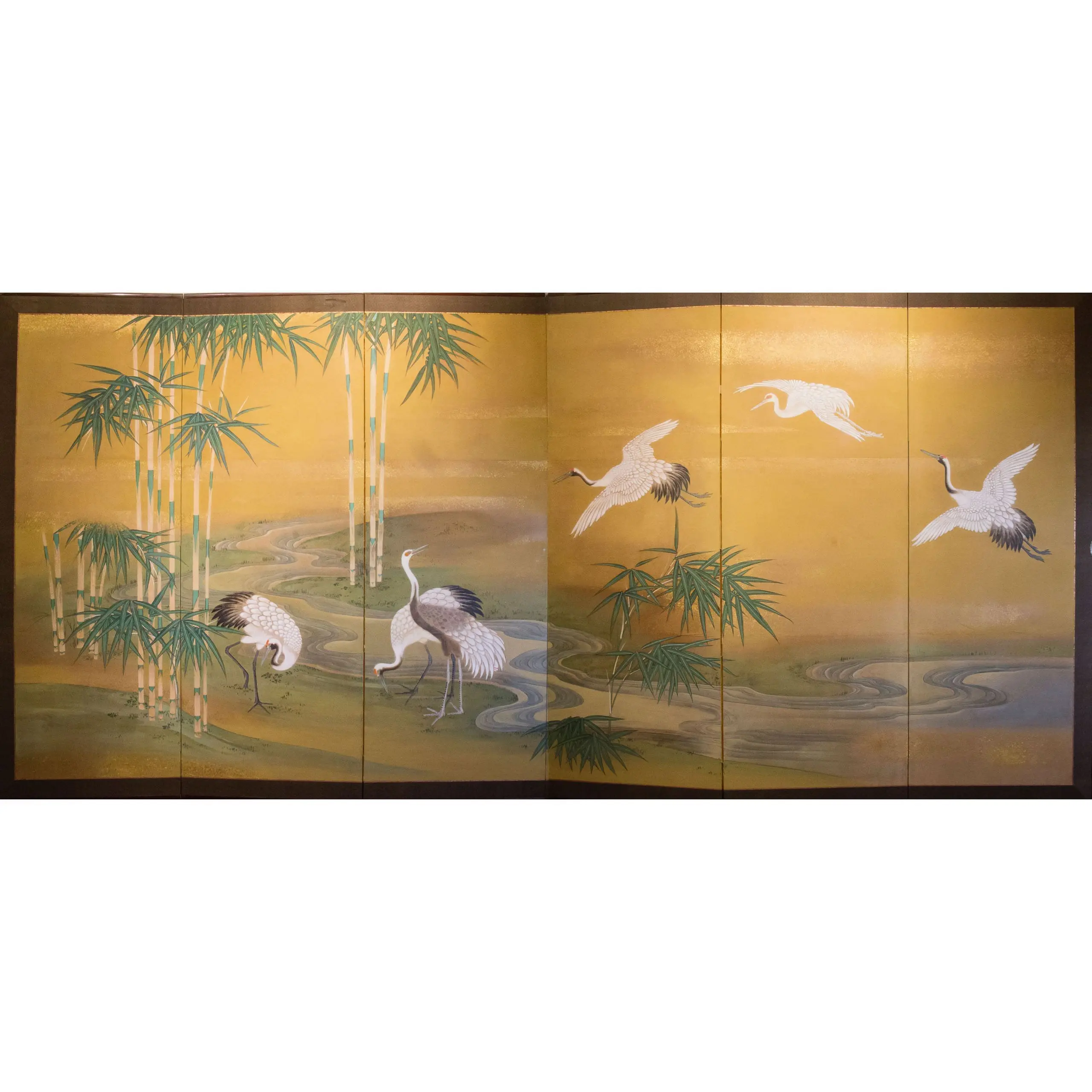 | Description | This Japanese six-panel folding screen (Byōbu) features a dramatic scene of cranes (egrets) and bamboo painted on a rich gold foil ground. The composition shows several cranes in flight and foraging near a stylized stream, with towering bamboo stalks providing vertical contrast. It is executed in a decorative, color-on-gold style. |