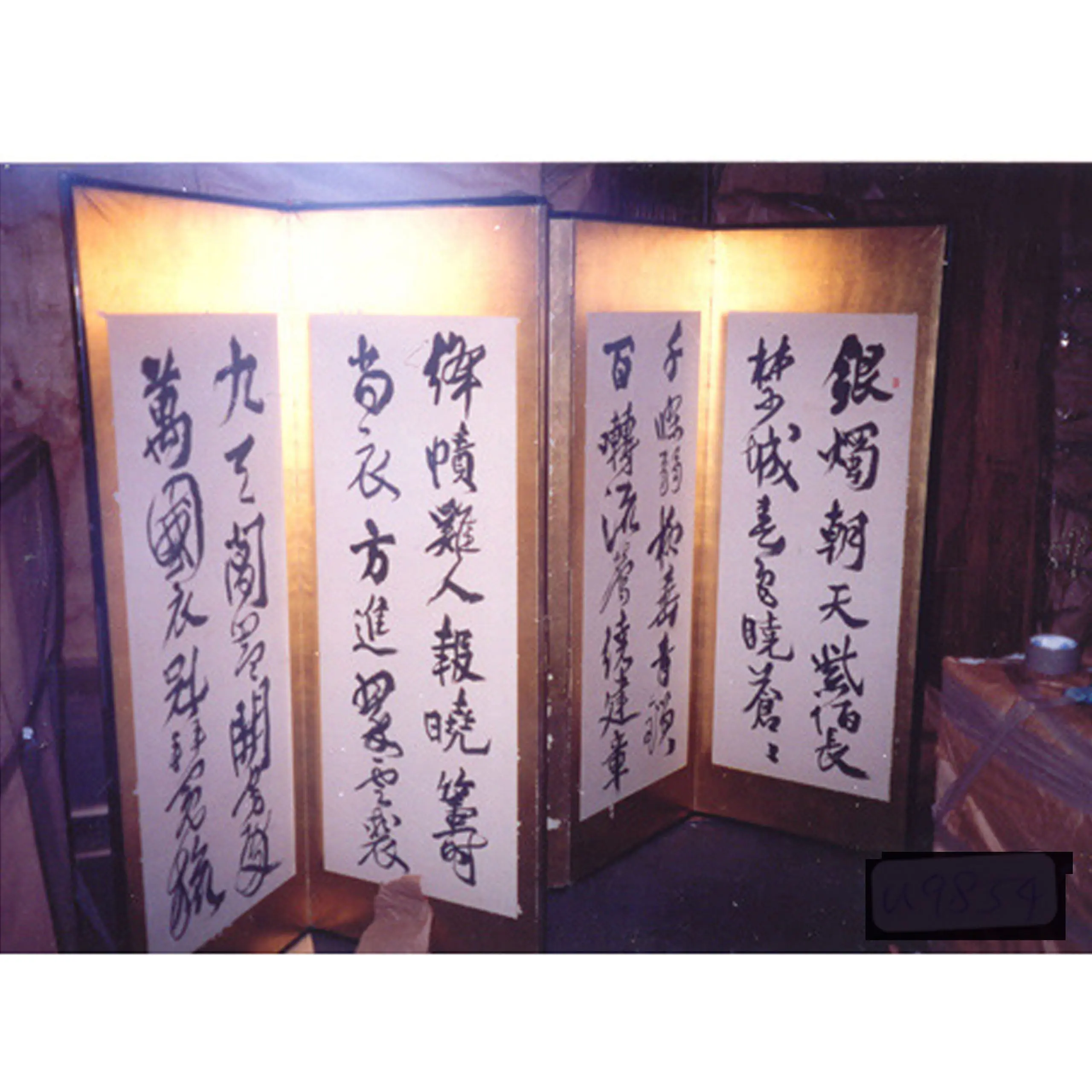 | Description | A slightly damaged, multi-paneled gold foil screen displaying Chinese or Japanese calligraphy. The screen features four large, vertical scrolls with elegant brushwork in black ink, mounted against the shimmering gold background. The rich texture and vertical format suggest it is an artistic furnishing, likely depicting poetry or classical texts. Slight water damage. |